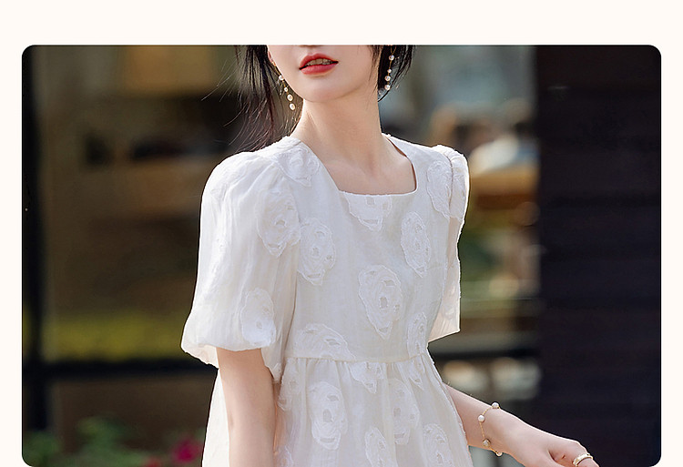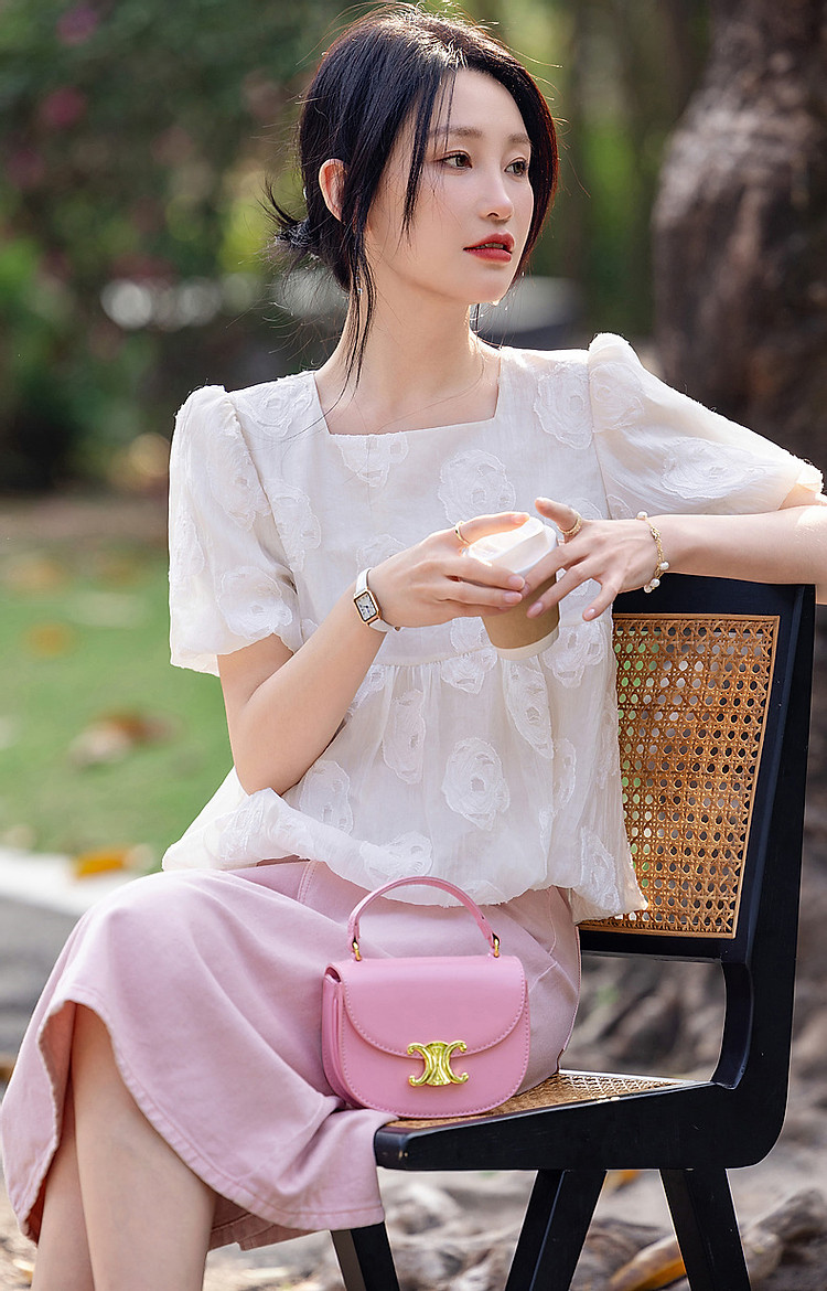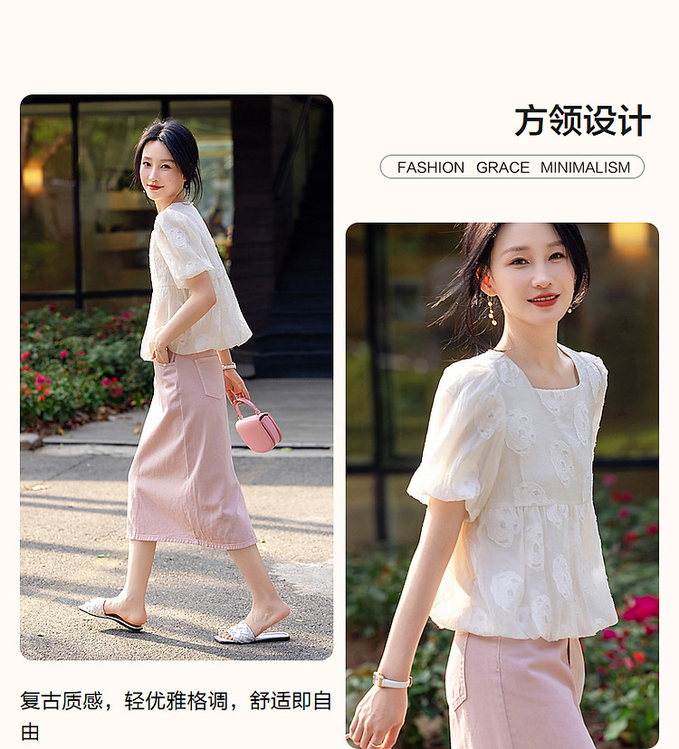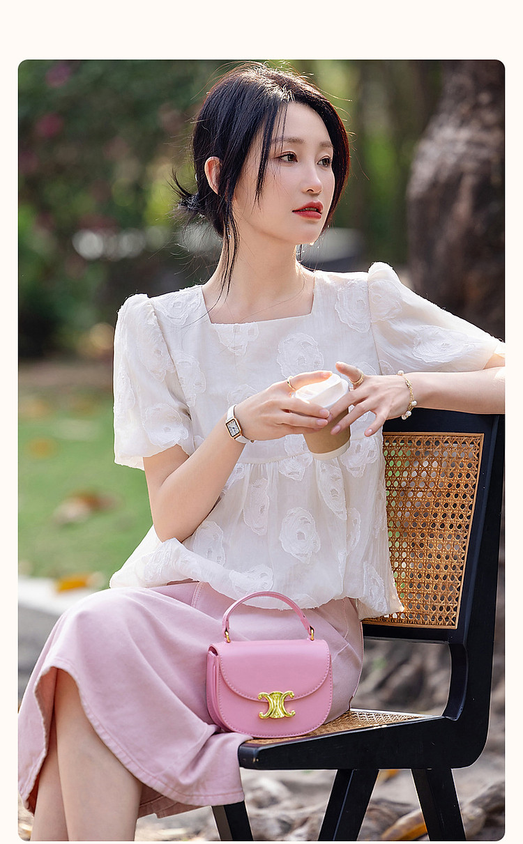 商品名称:【花间绮梦】夏法奢剪花娃娃衫方领衬衫泡泡袖舒适藏肉衬衣女上衣 980865