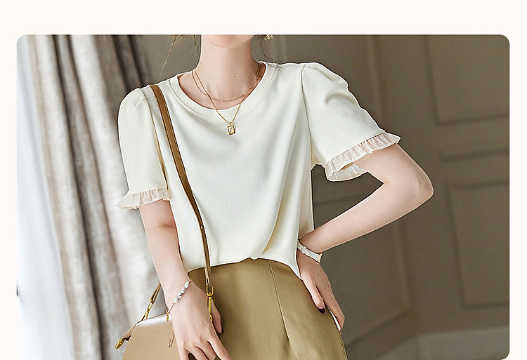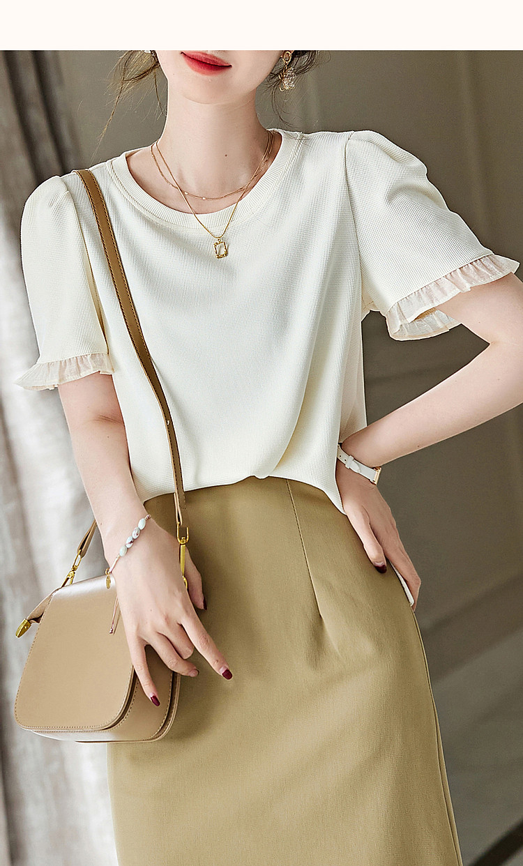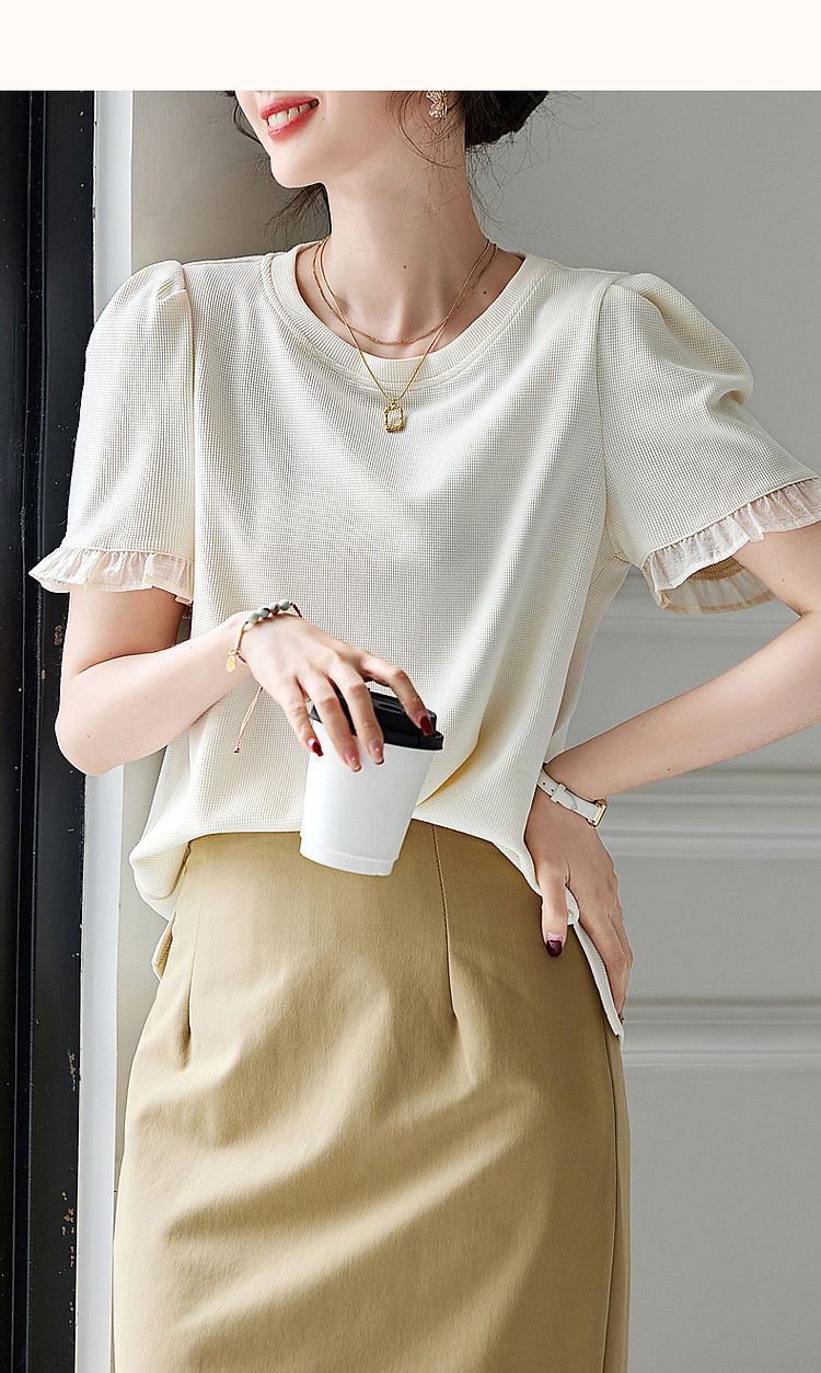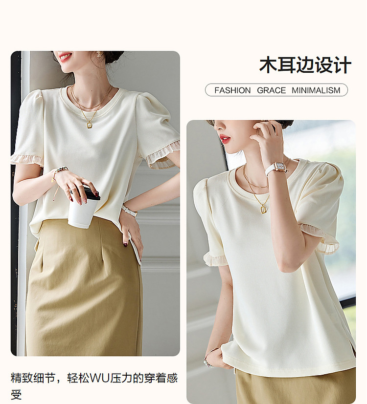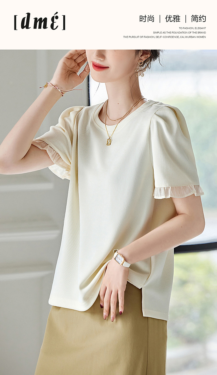 商品名称:【法式轻氧系列】夏圆领泡泡袖t恤女雪纺木耳边拼接清爽女式t恤 075009