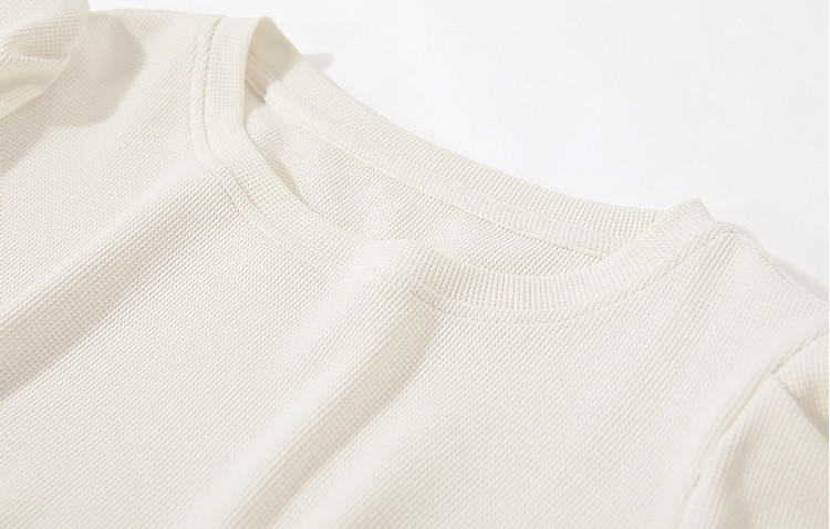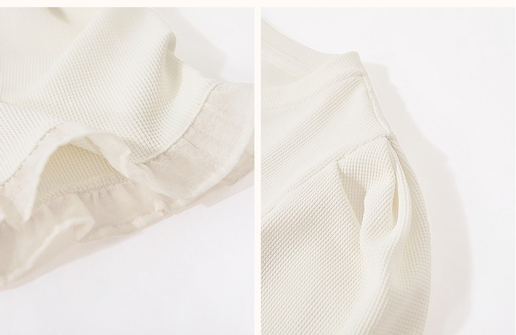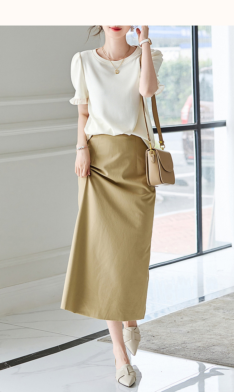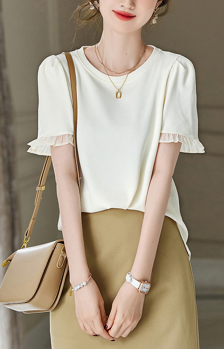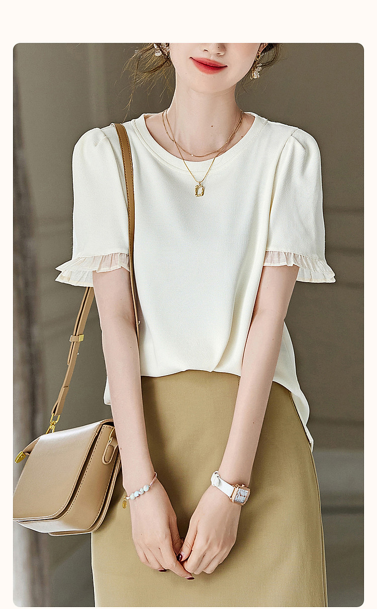 商品名称:【法式轻氧系列】夏圆领泡泡袖t恤女雪纺木耳边拼接清爽女式t恤 075009