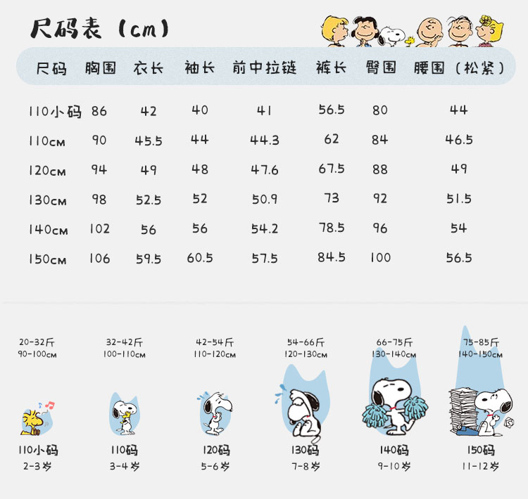 | 尺码 | 袖长(cm) | 上装号型 | 适合年龄 | 下装号型 | 衣长(cm) | 身高(cm) | 腰围(cm) | 裤长(cm) | 臀围(cm) | 胸围(cm) | 号型 |