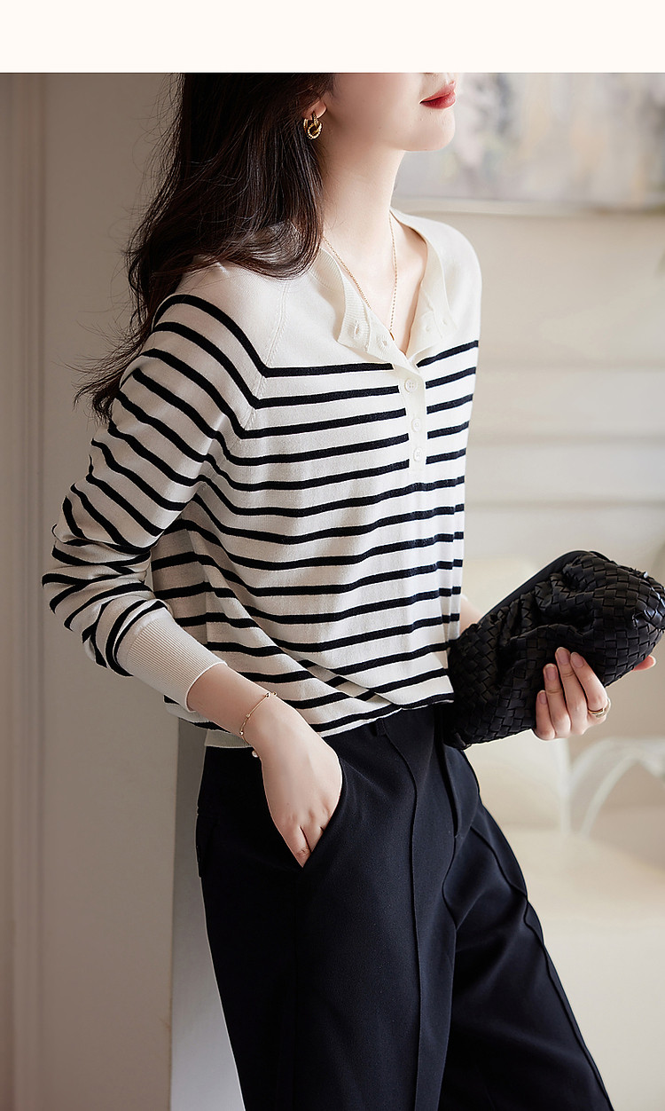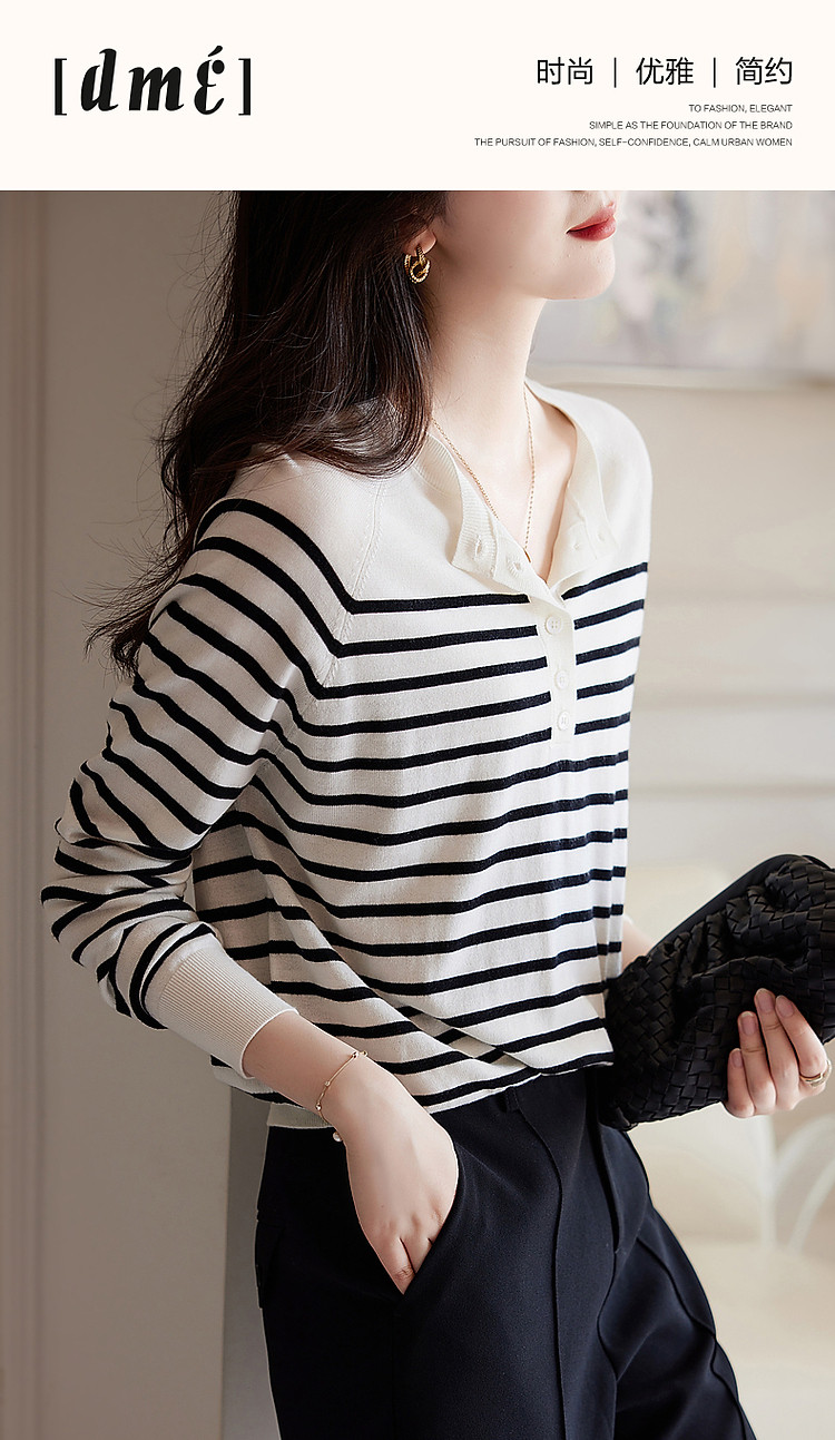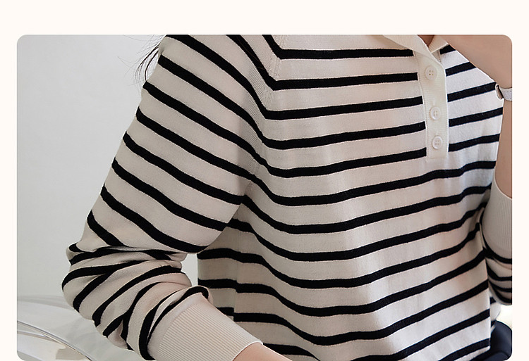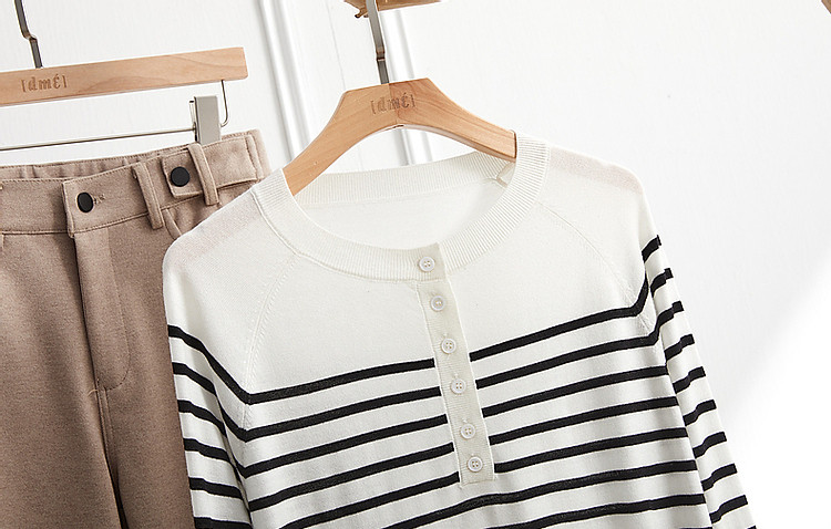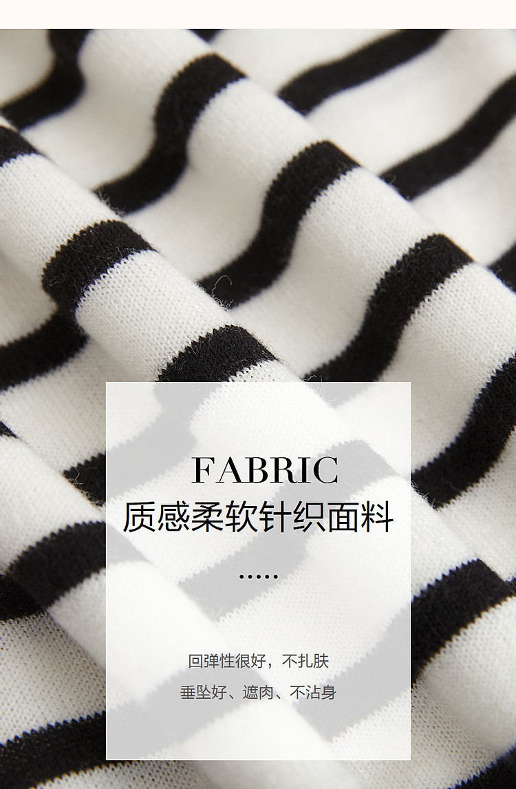 商品名称:【日系文艺通勤】春秋设计感圆领撞色条纹线衫藏肉显瘦针织衫 387585