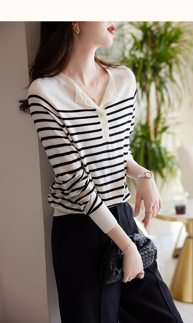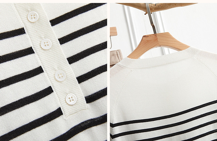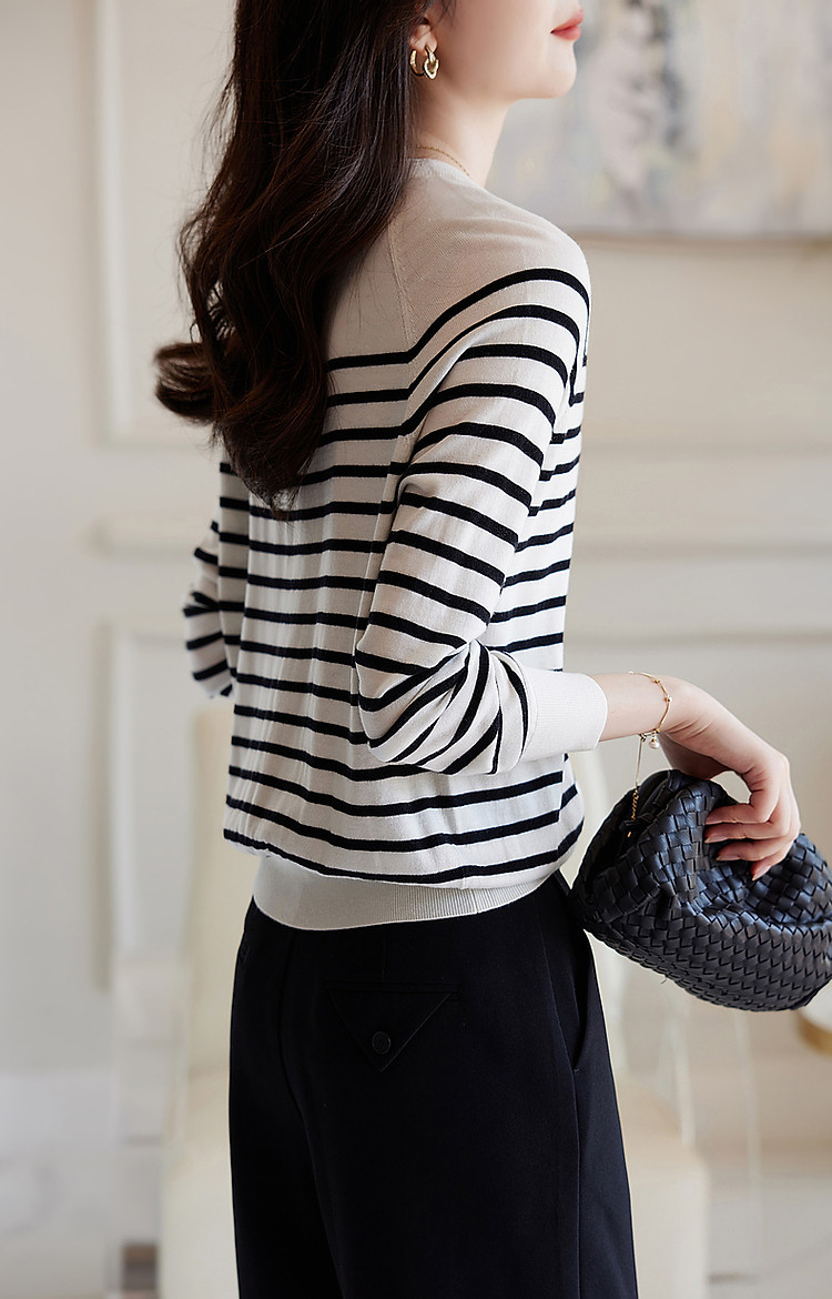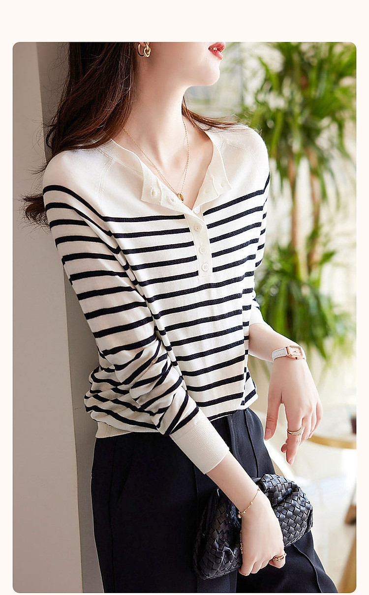 商品名称:【日系文艺通勤】春秋设计感圆领撞色条纹线衫藏肉显瘦针织衫 387585