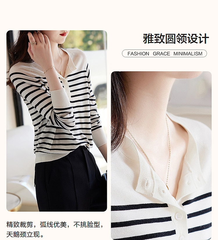 【2024秋冬】简约百搭翻领条纹针织开衫女时尚休闲毛衣外套 383060