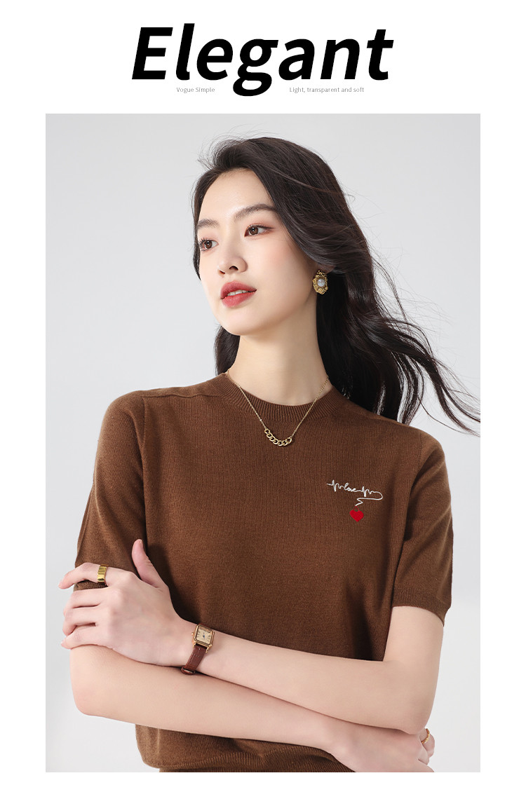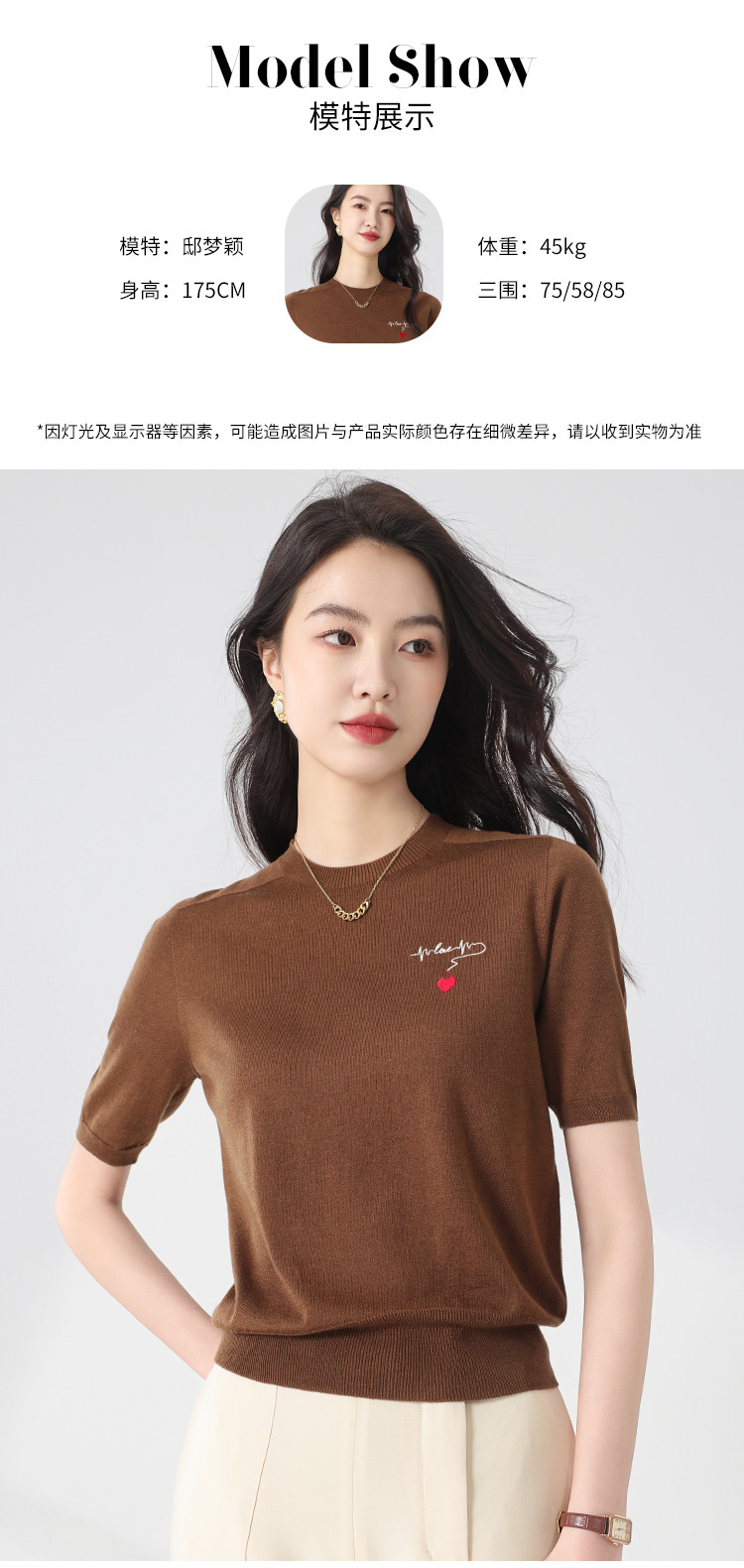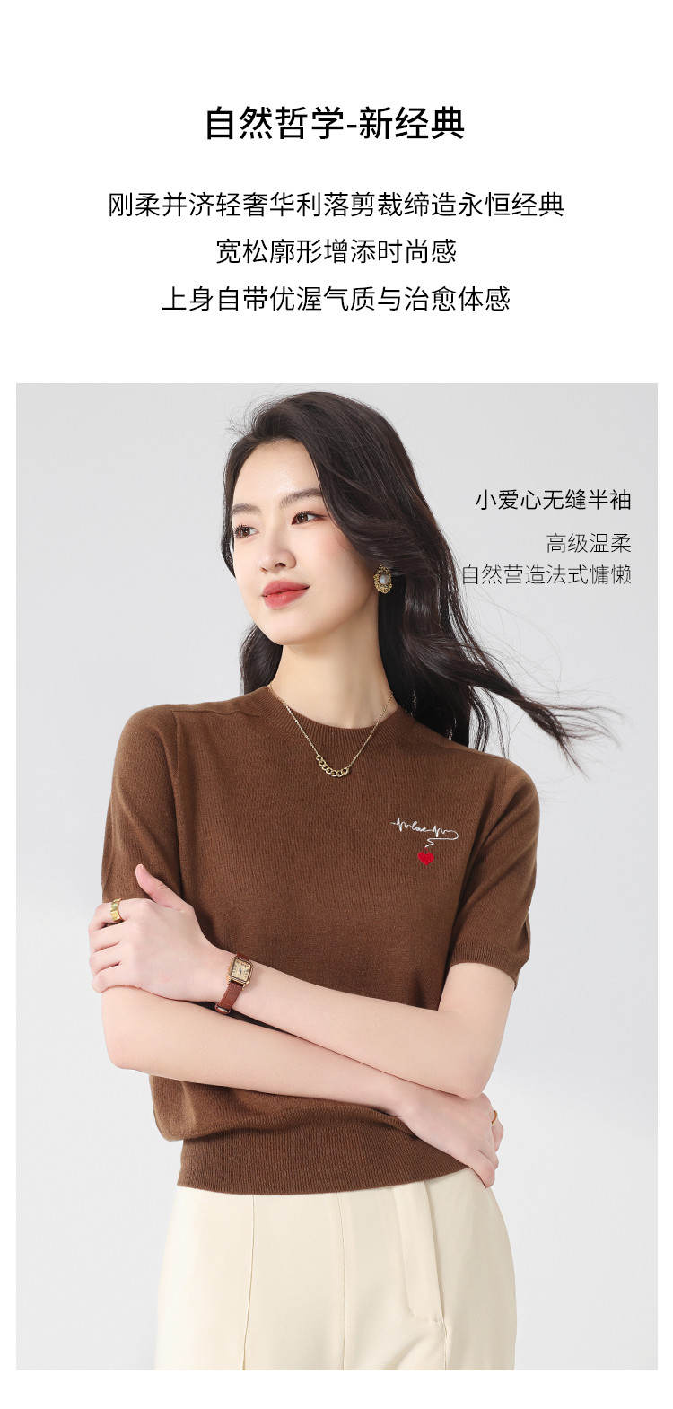 商品名称:【无缝 一线成衣】轻薄透气含桑蚕丝刺绣爱心针织打底衫短袖T恤 755603