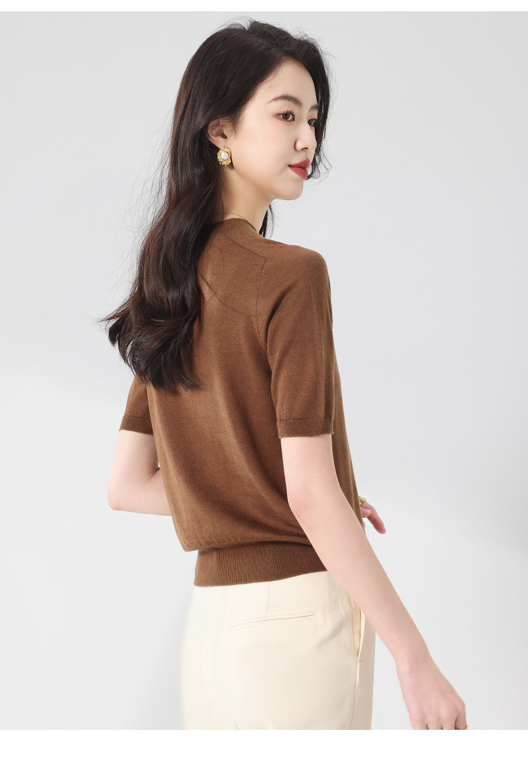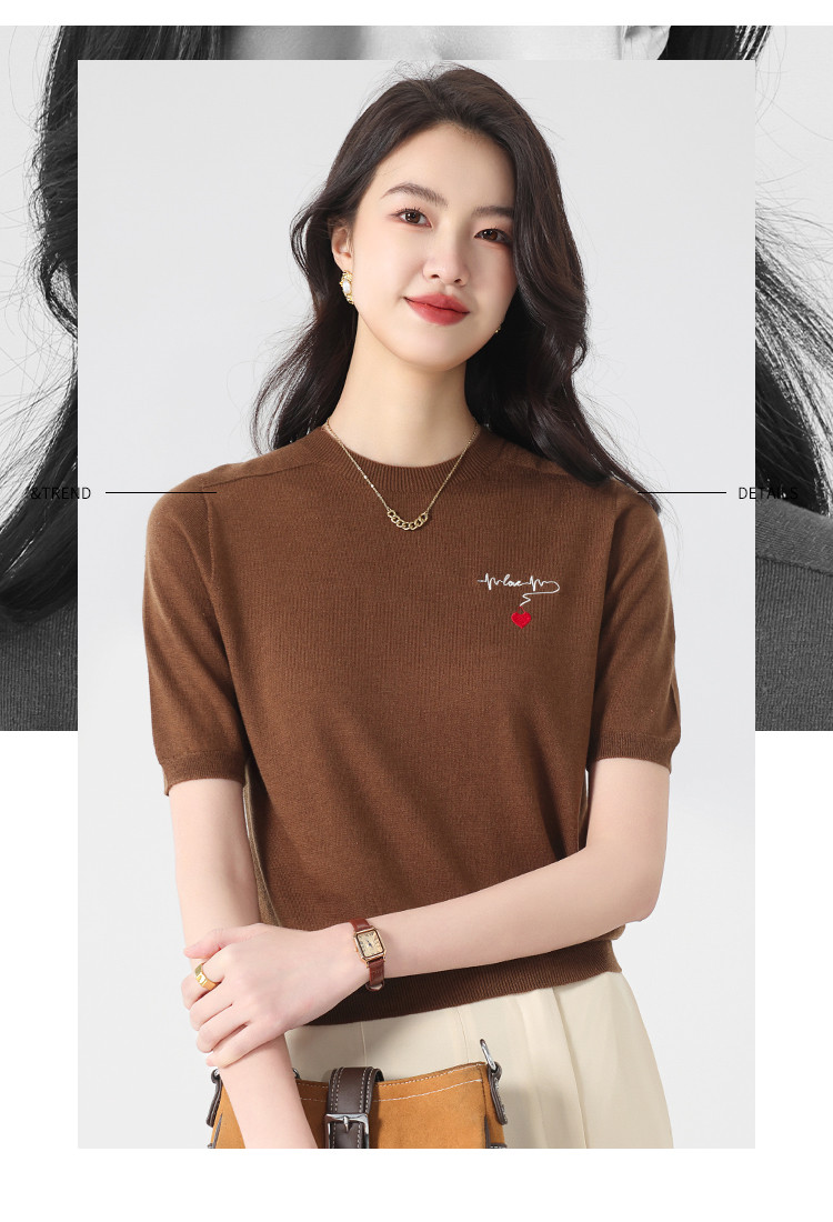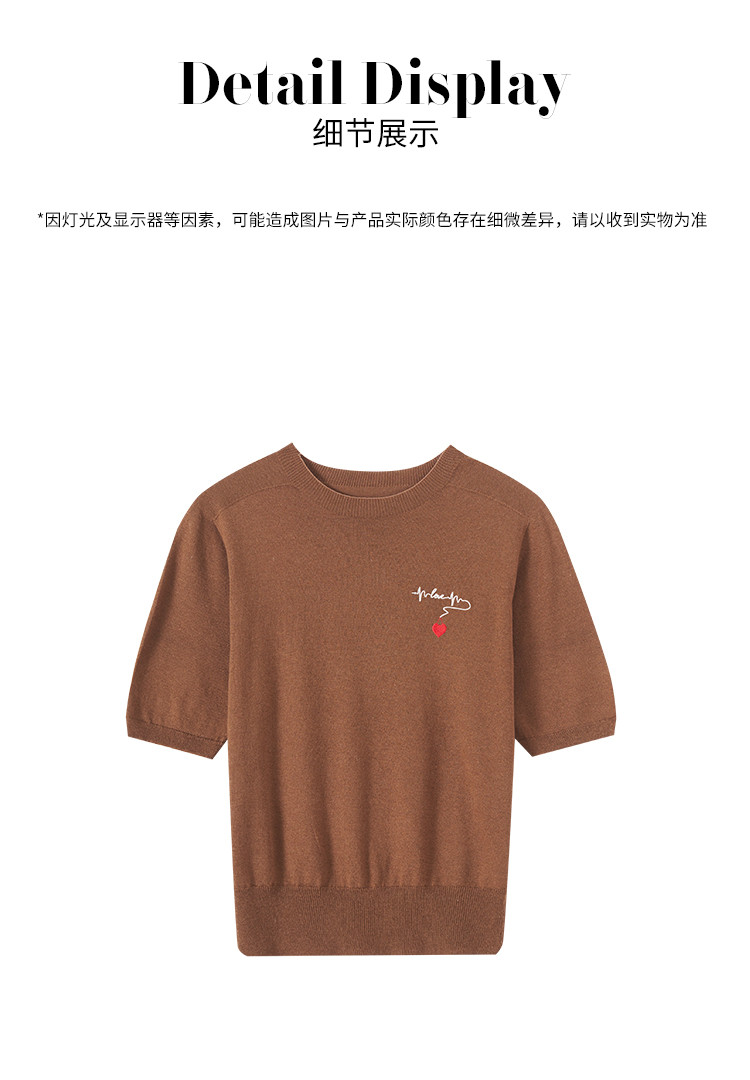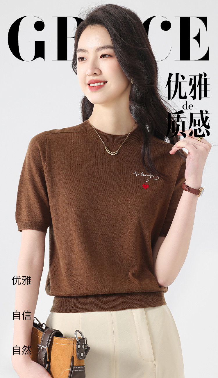 商品名称:【无缝 一线成衣】轻薄透气含桑蚕丝刺绣爱心针织打底衫短袖T恤 755603