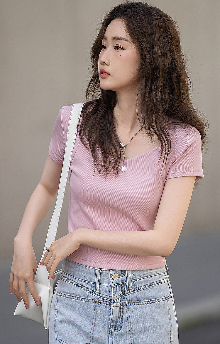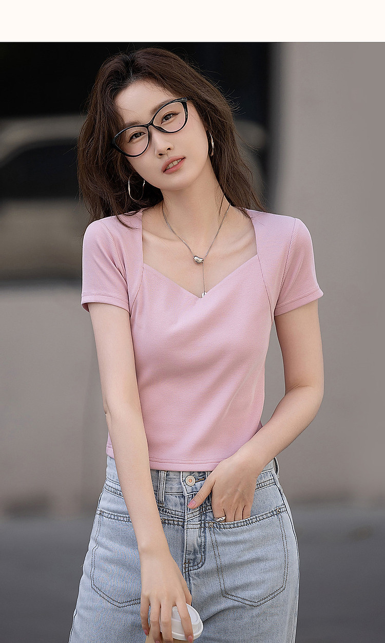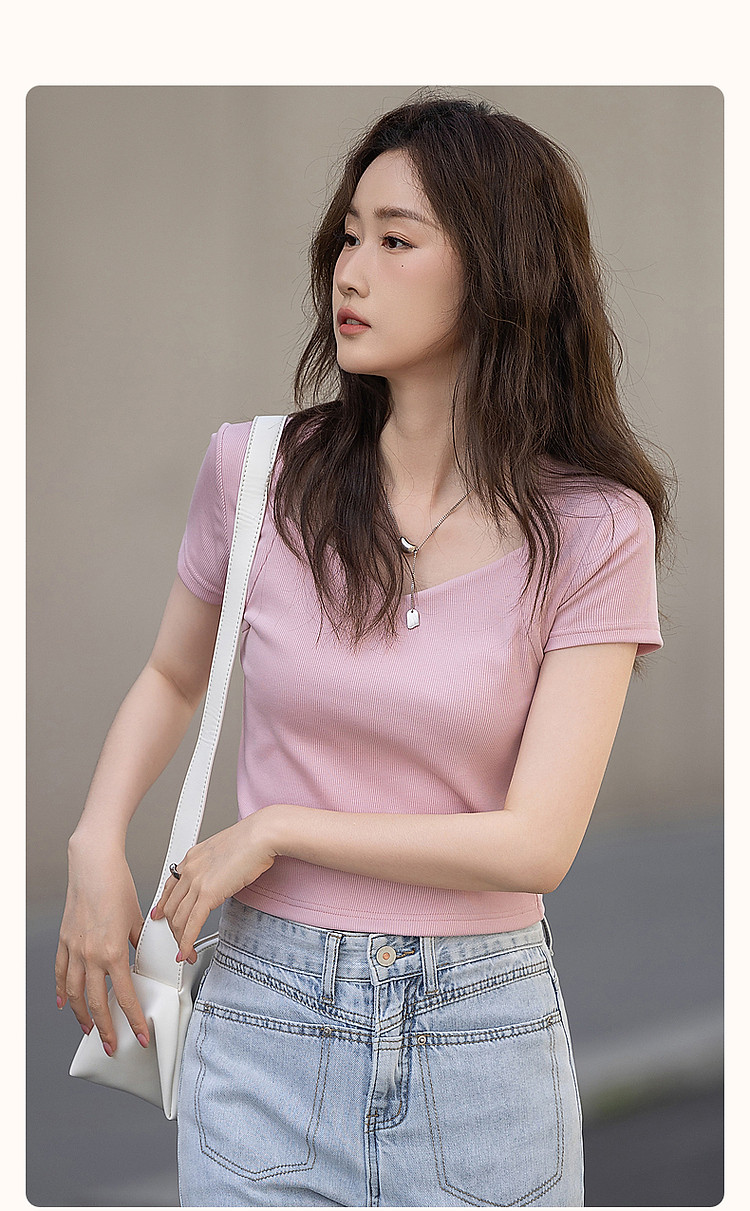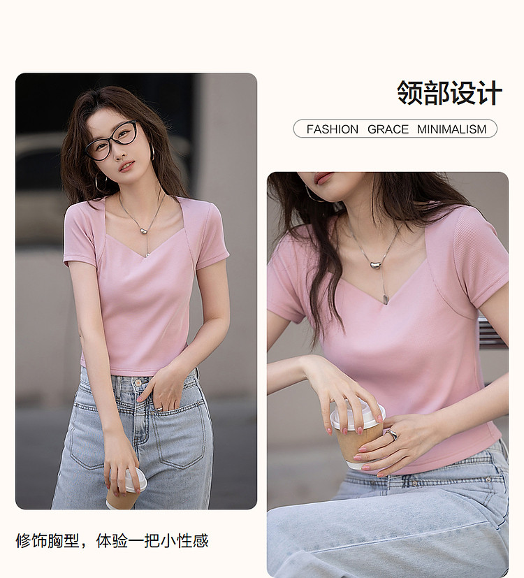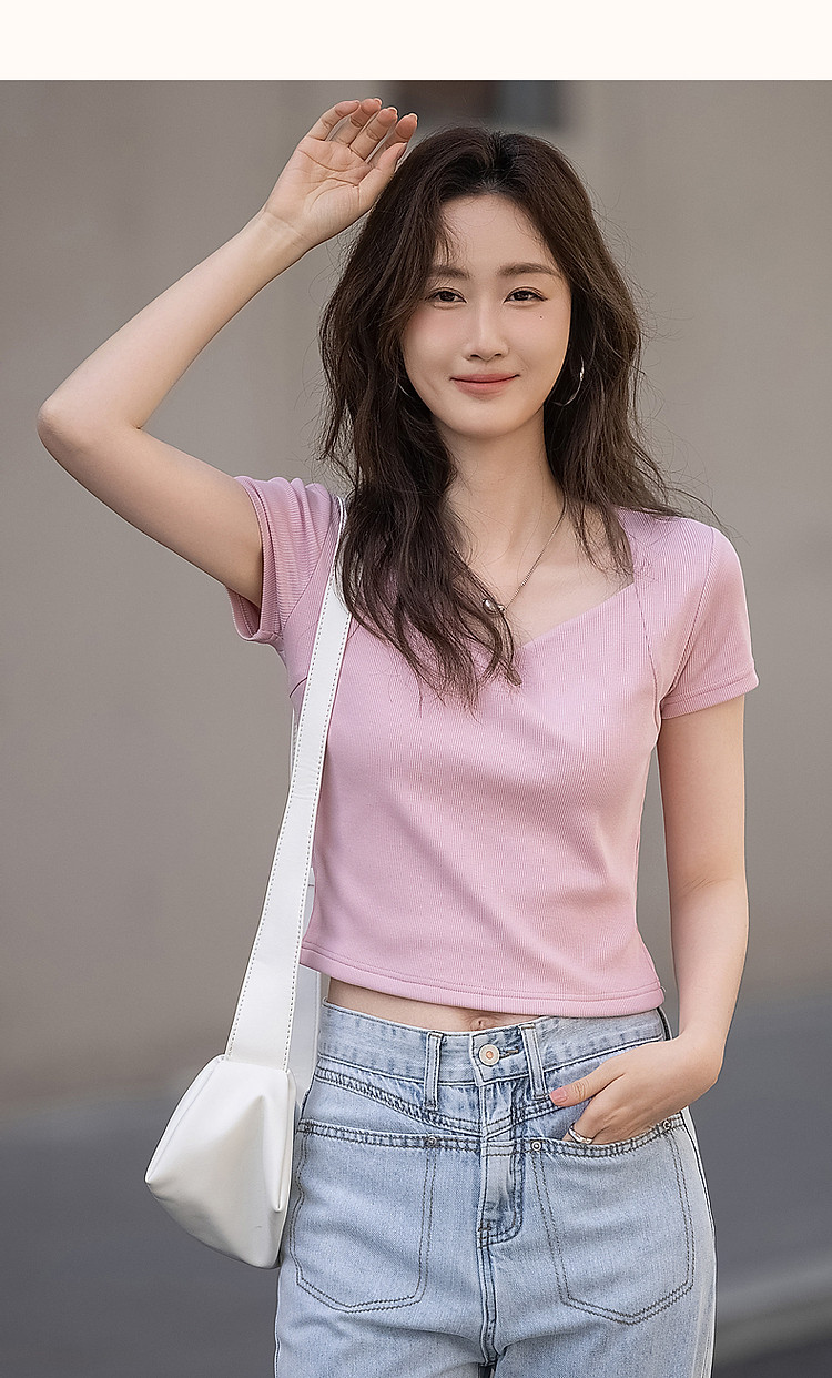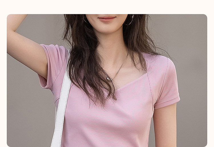 商品名称:【多巴胺纯欲风】夏韩系网红不规则领修身显瘦舒适短款女式t恤 050881