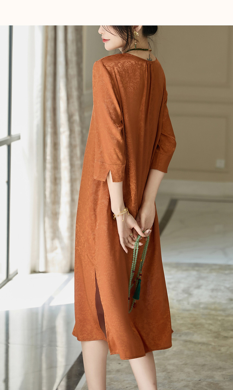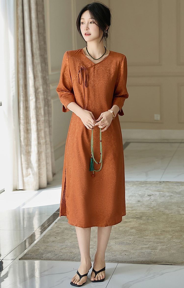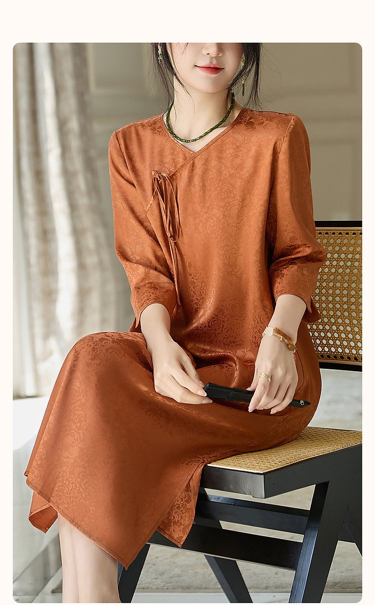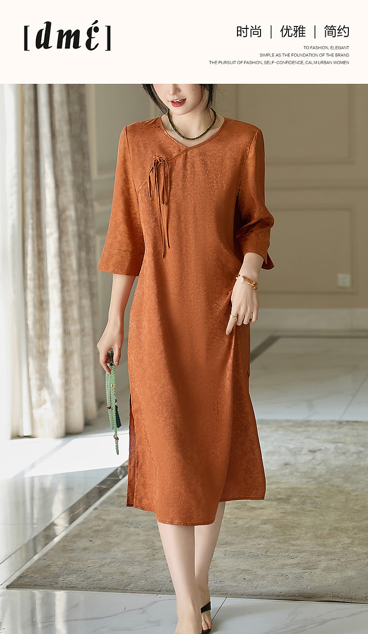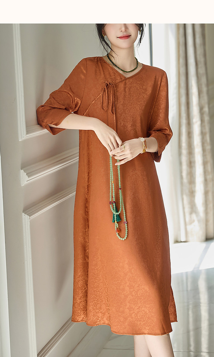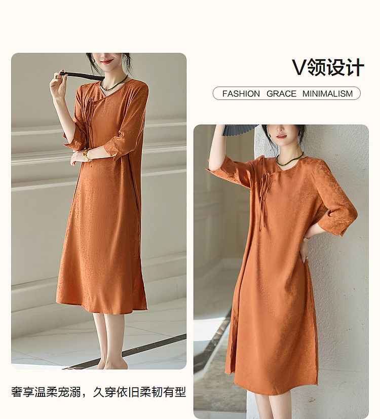 【东方禅意美学】夏国风新中式V领绑带五分袖提花舒适藏肉连衣裙 887489