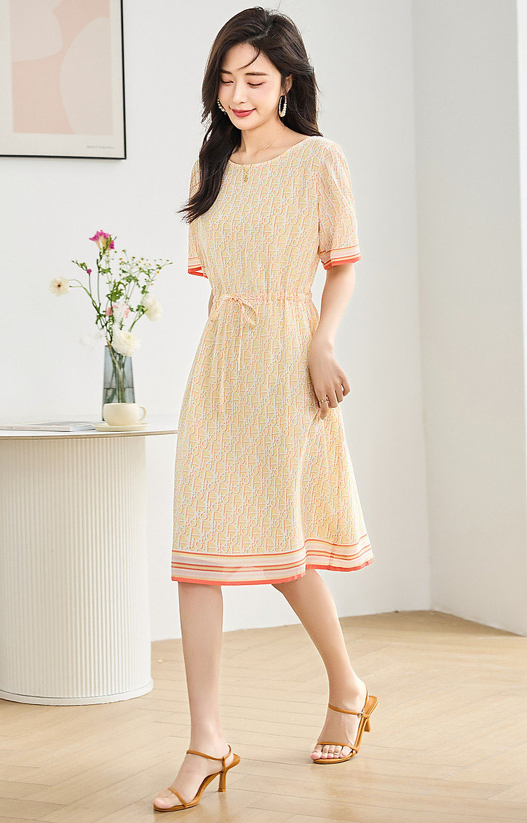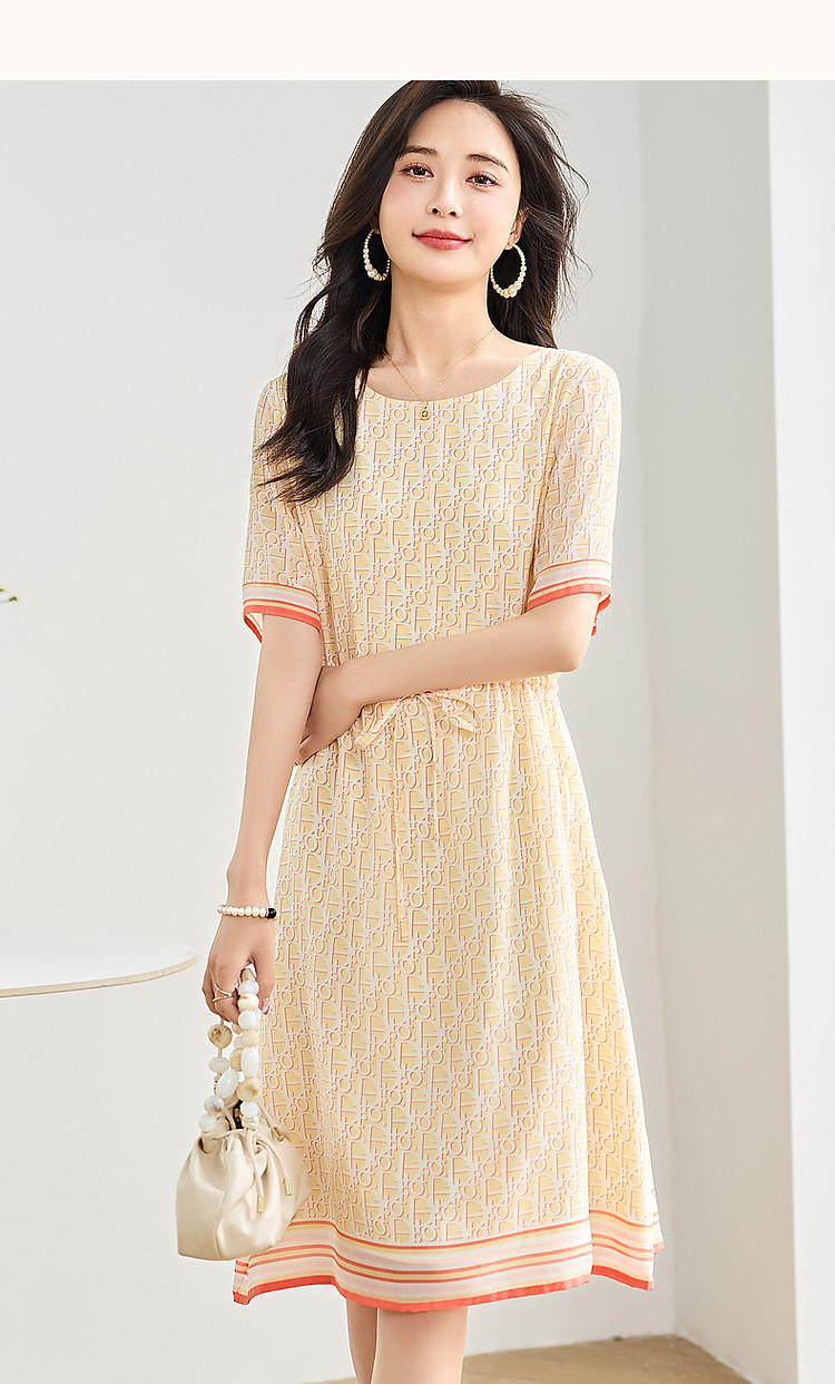 【法式仙感氧气】夏奢享桑蚕丝定位印花抽绳淑女连衣裙 019329