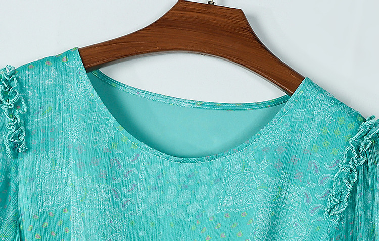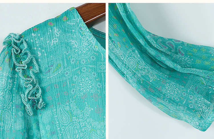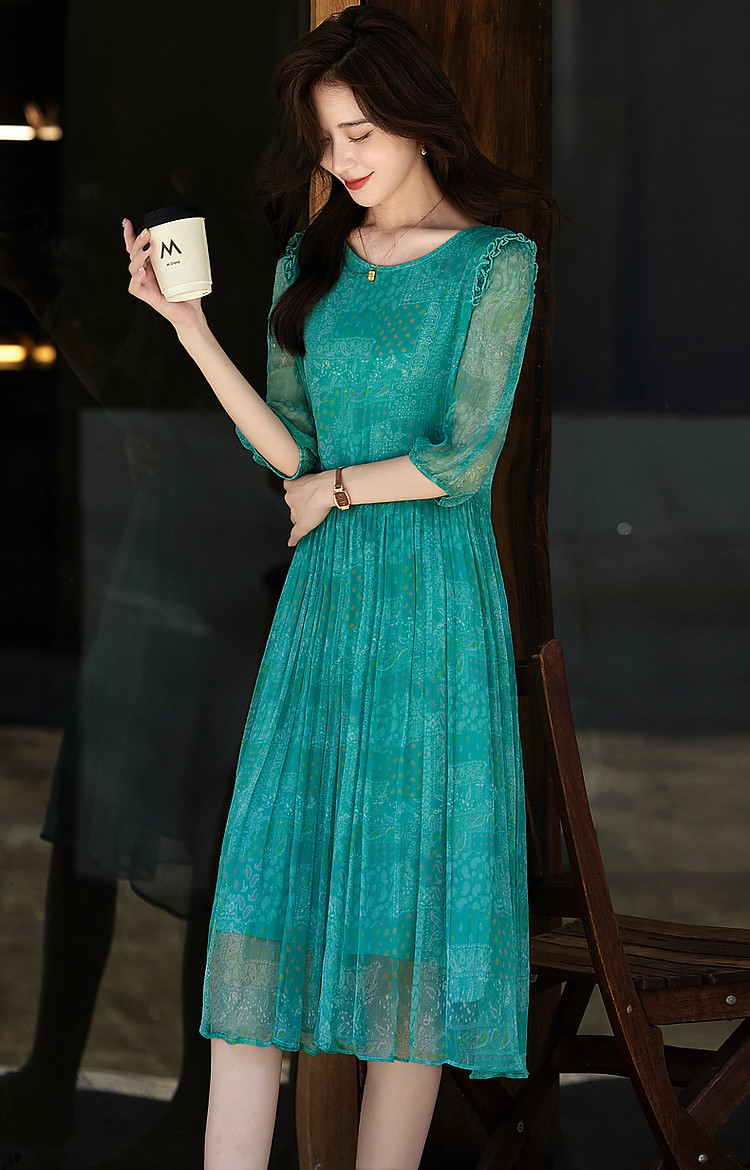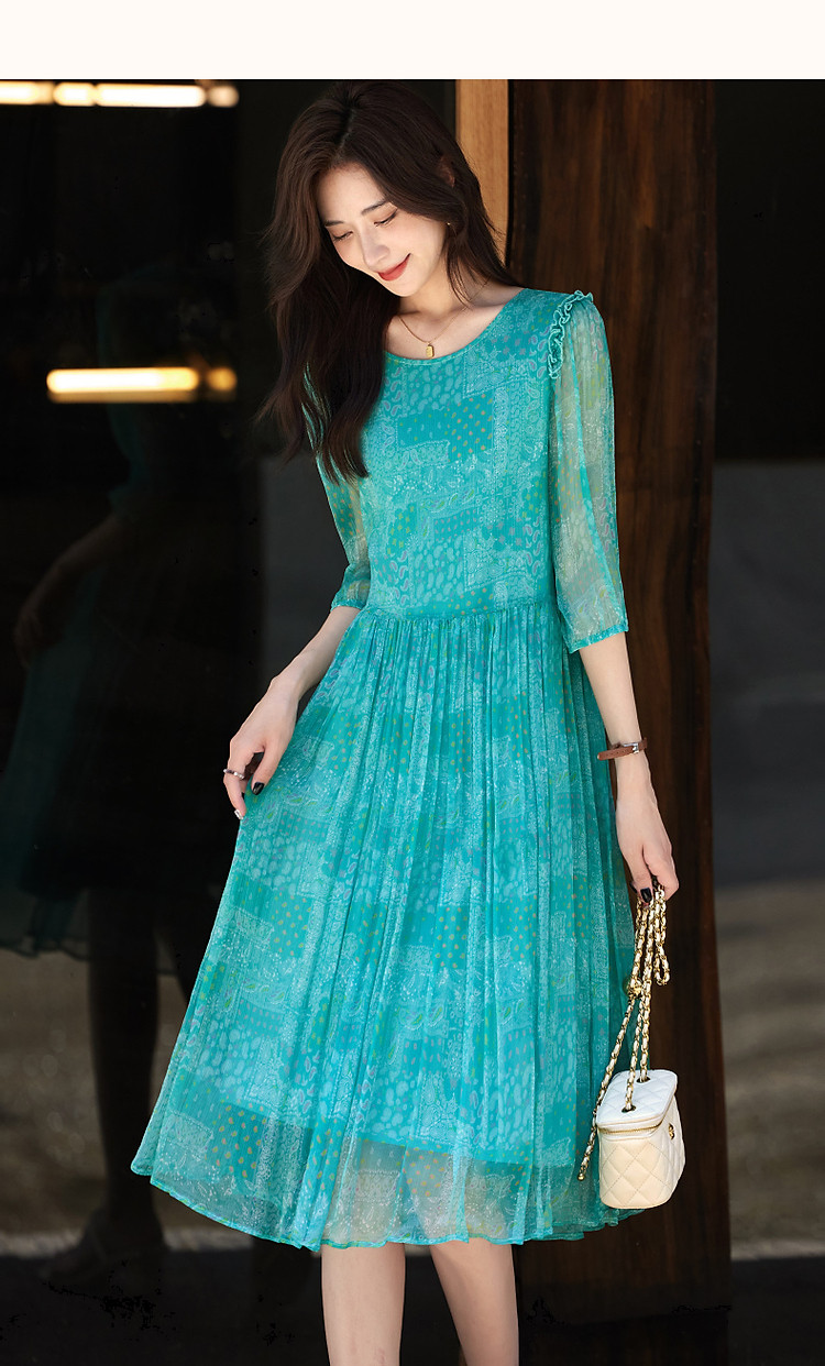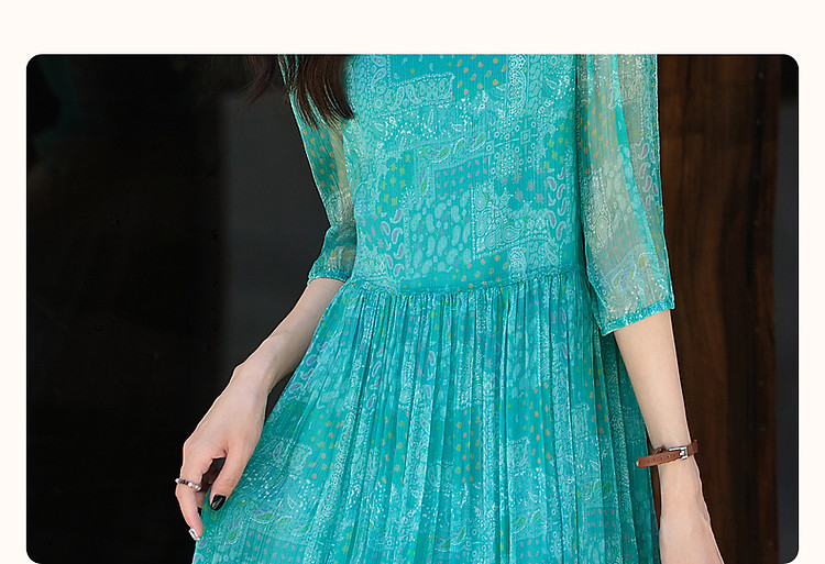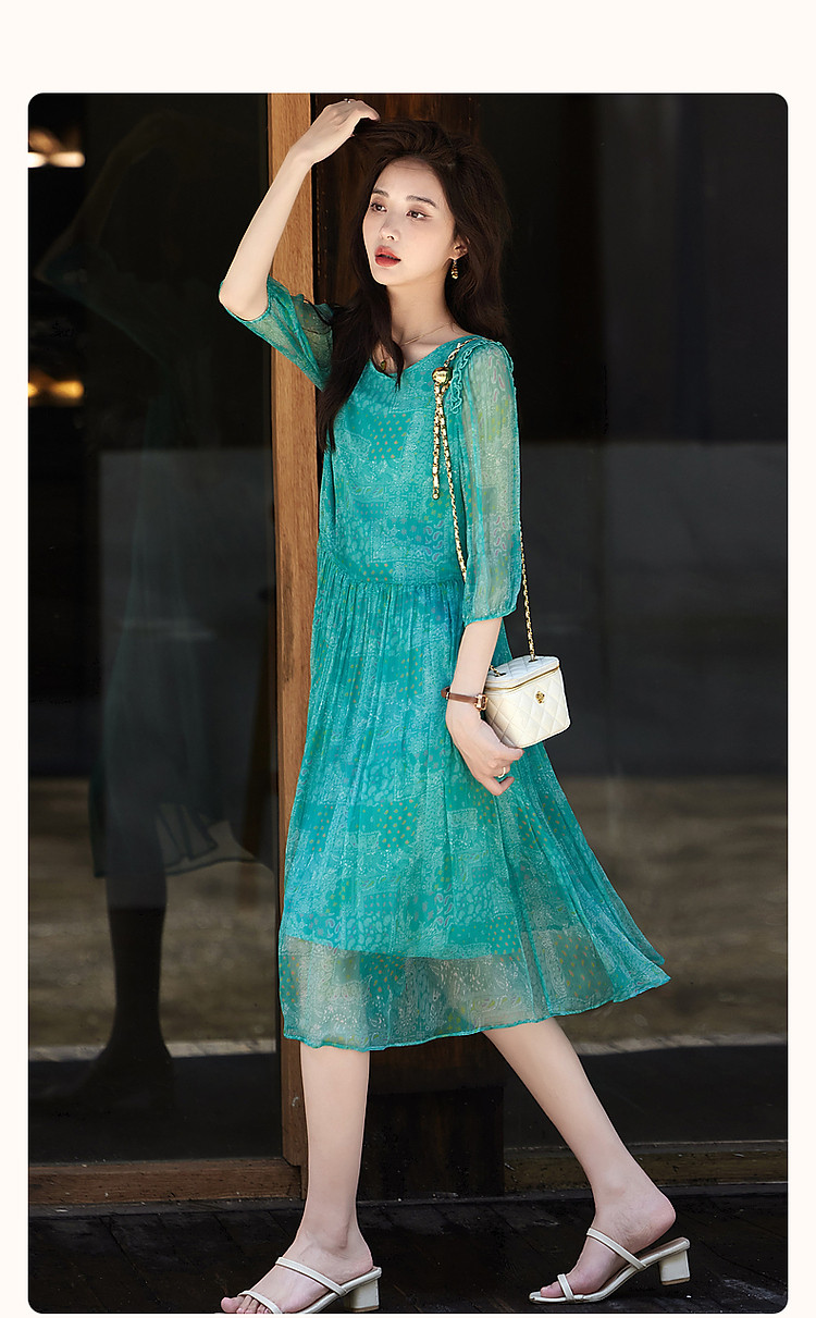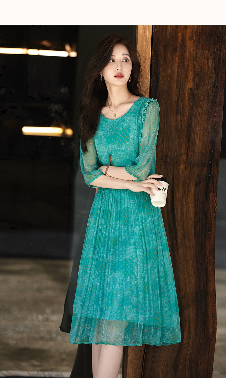 商品名称:【薄荷曼波】夏度假风桑蚕丝真丝抽褶七分袖遮肉连衣裙女 887041