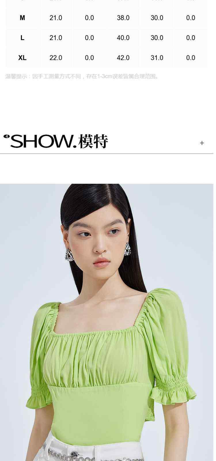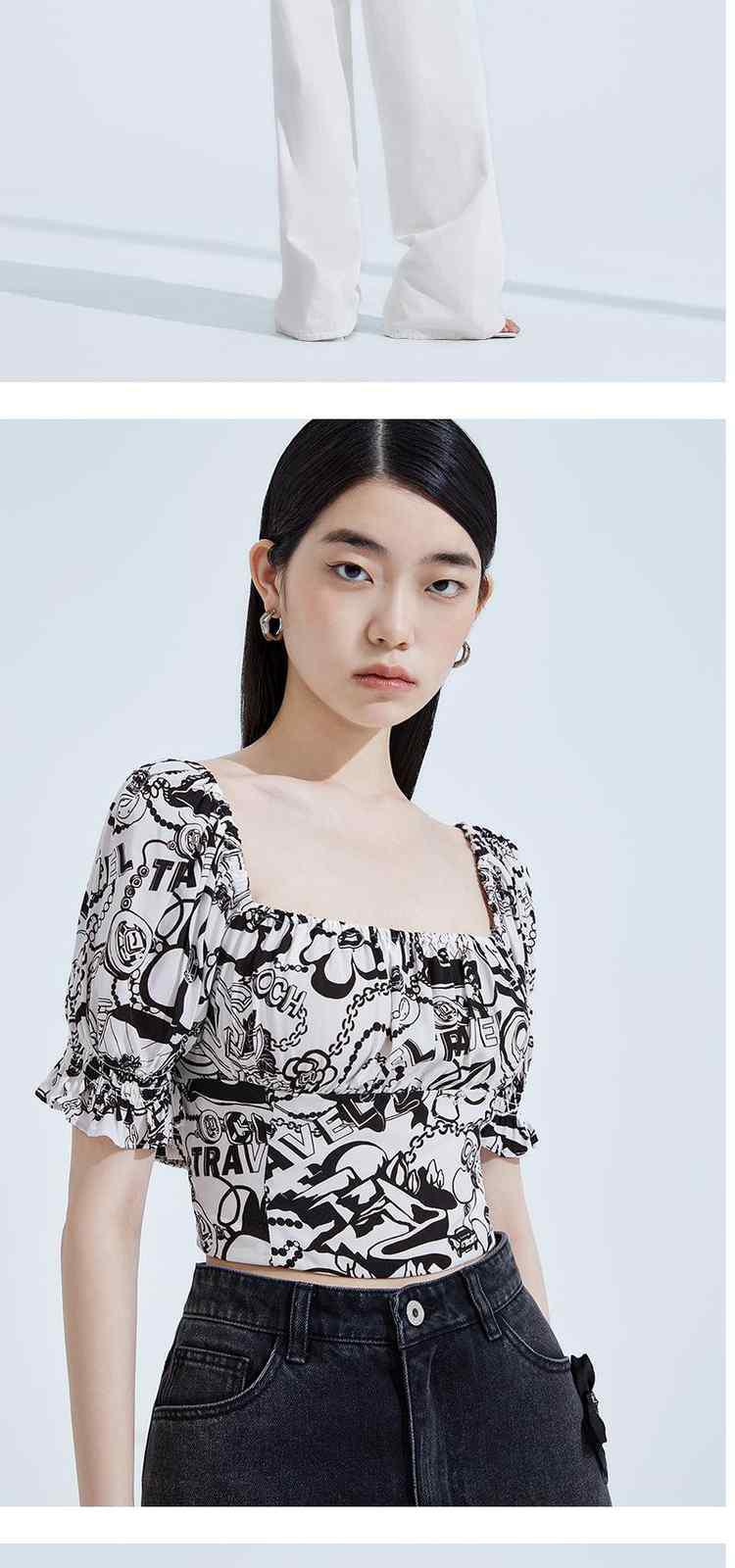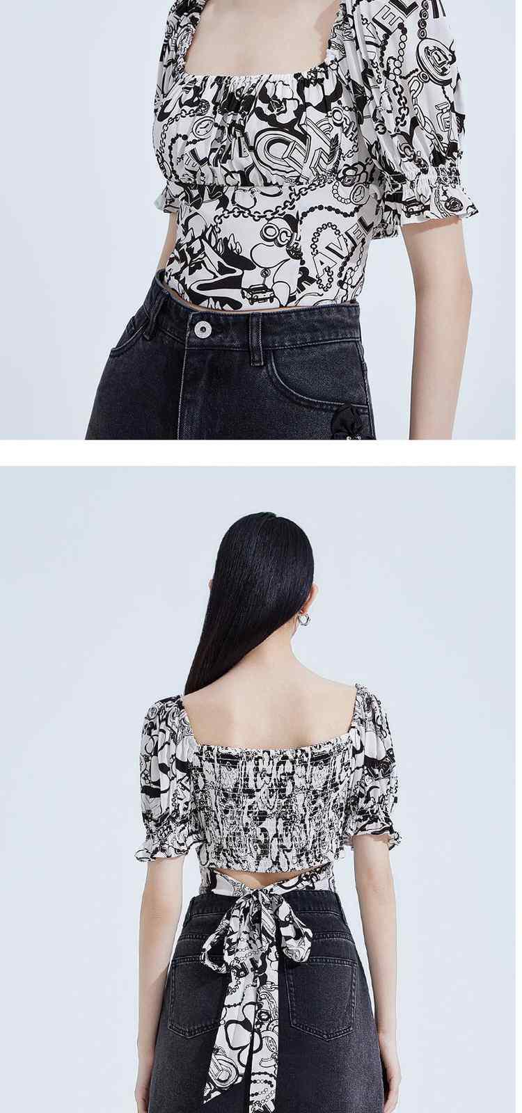 黑标系列夏装 方领泡泡袖系带短款法式短袖衬衫女 446671