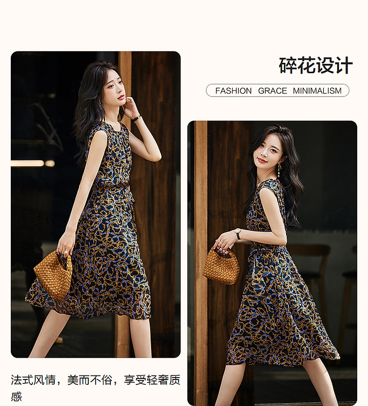商品名称:【名媛千金】春圆领桑蚕丝真丝碎花仙女裙腰带连衣裙女 734401