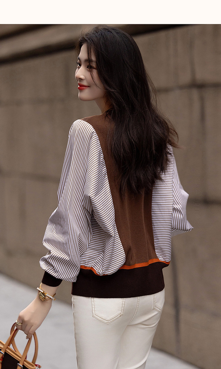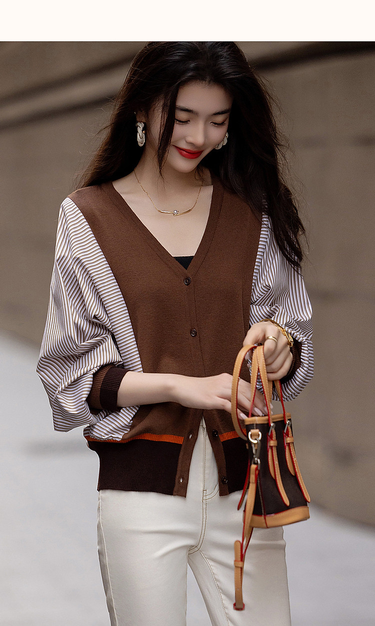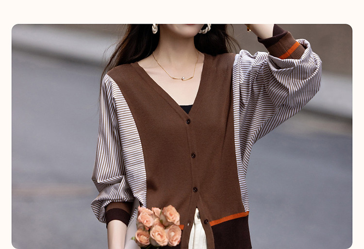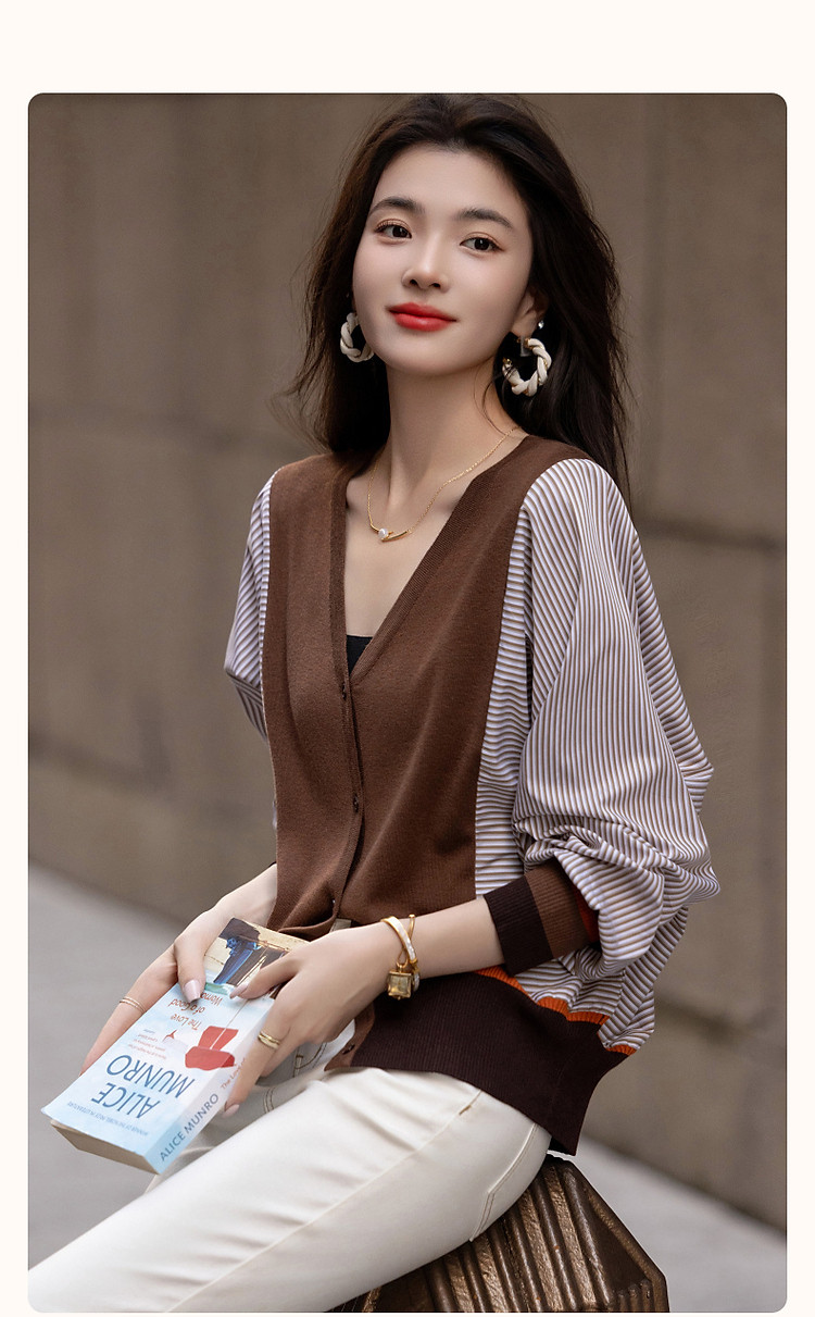 商品名称:【时髦蝙蝠袖拼接开衫】春秋通勤V领线衫舒适不挑人撞色针织衫 206145