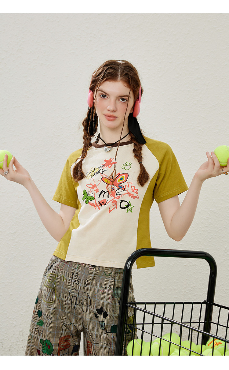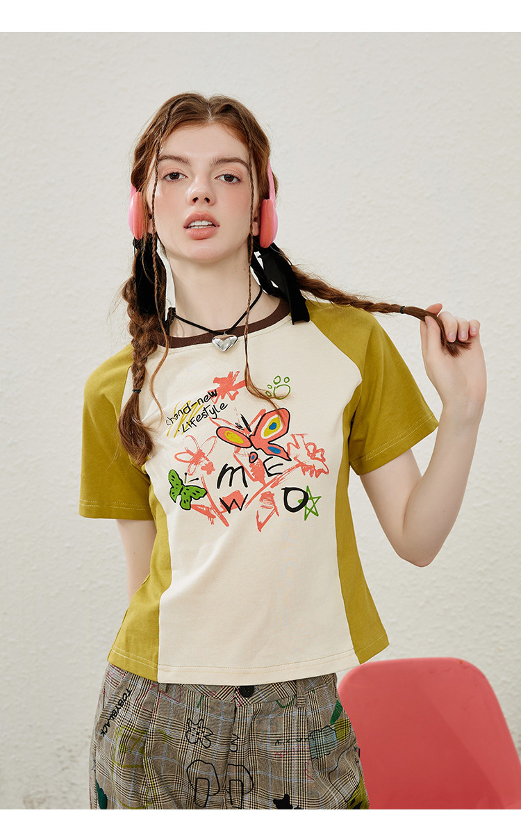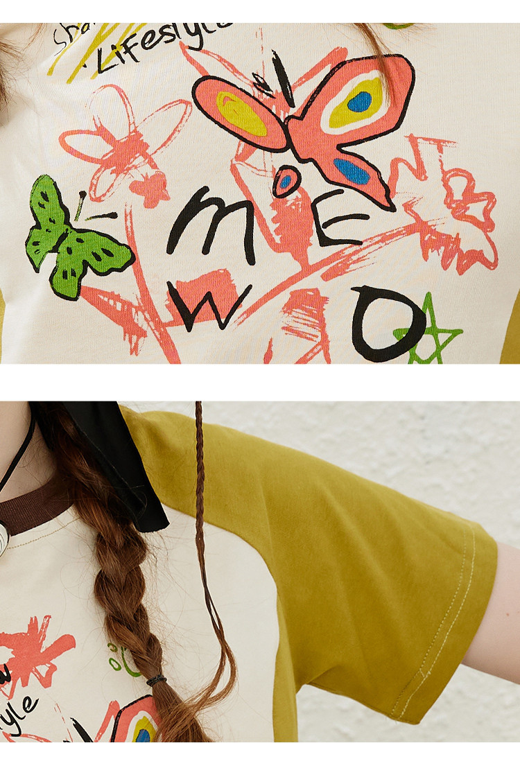 涂鸦印花插肩袖宽松休闲圆领女式T恤夏季休闲短袖上衣 655901