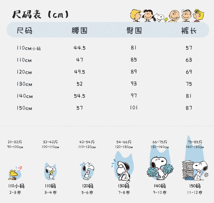 | 尺码 | 身高(cm) | 腰围(cm) | 裤长(cm) | 臀围(cm) | 适合年龄 | 号型 |