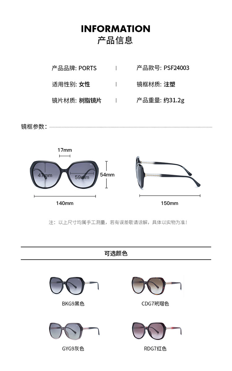 商品名称:PORTS女款休闲经典日常注塑轻盈太阳镜PSF24003 471946