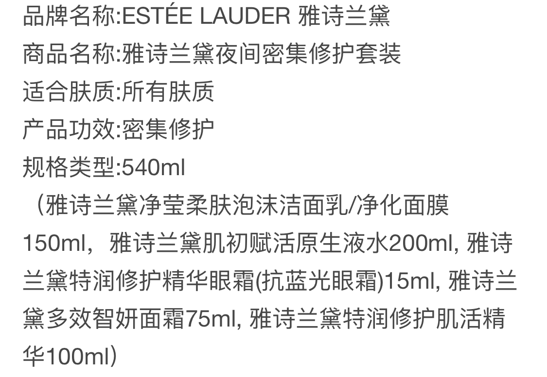 商品名称:雅诗兰黛 夜间密集修护五件套 洁面乳150ml+原生液200ml+面霜75ml+小棕瓶100ml+眼霜15ml