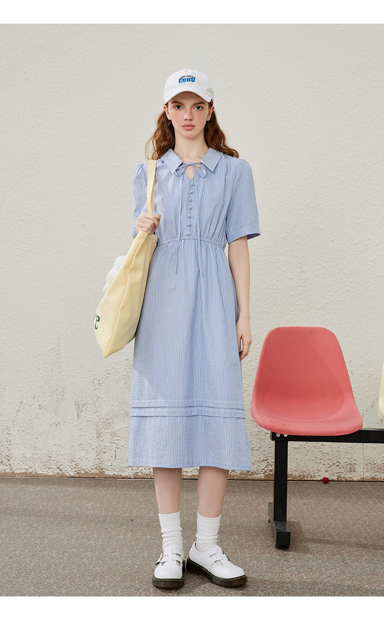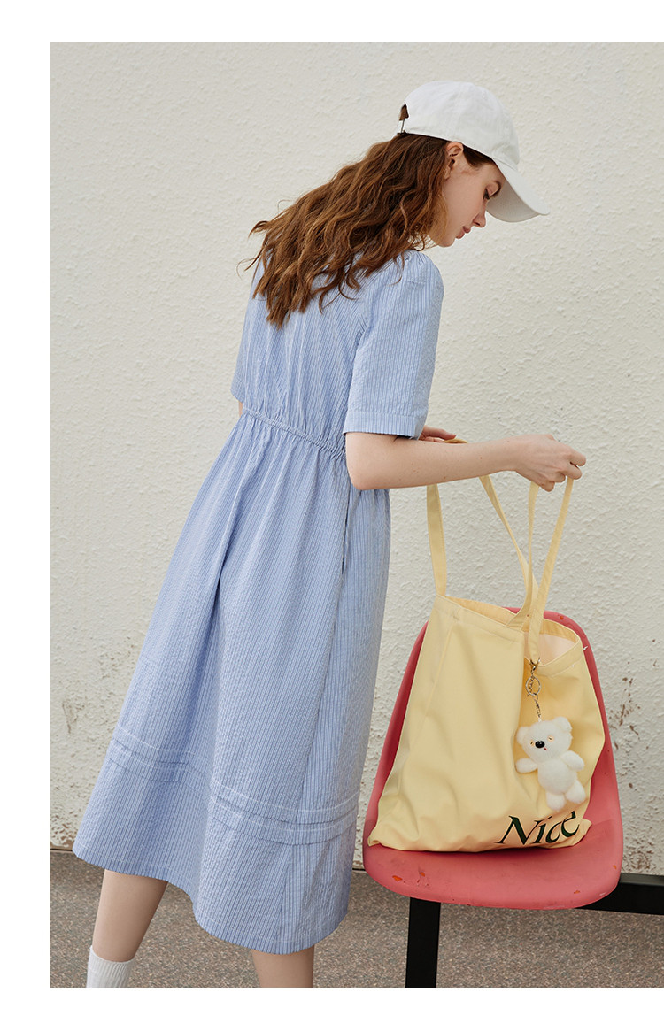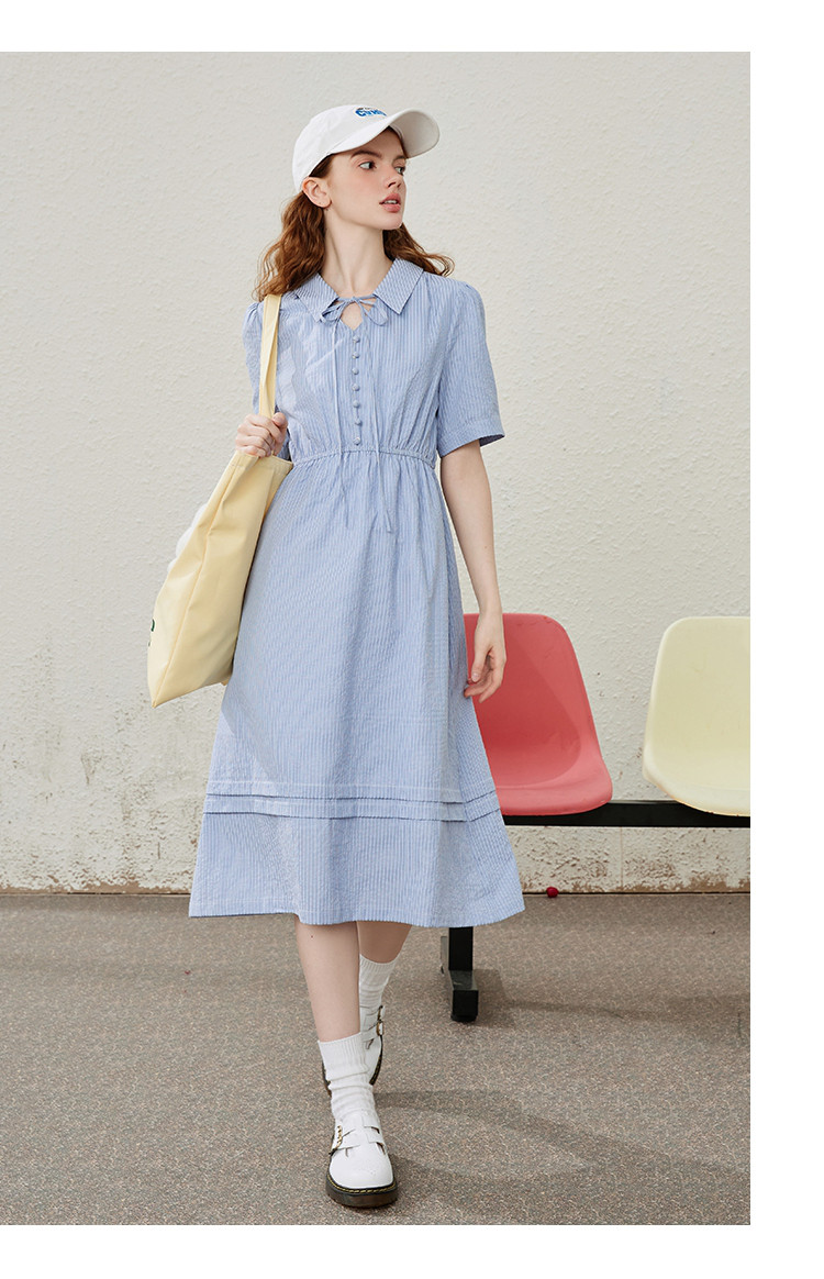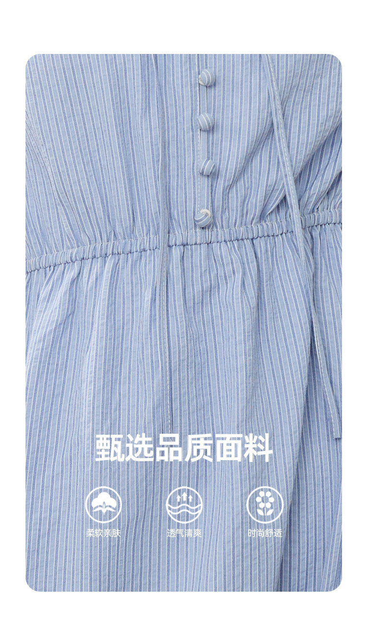 商品名称:条纹设计感收腰系带领小众长款连衣裙夏季休闲气质A字裙 535517