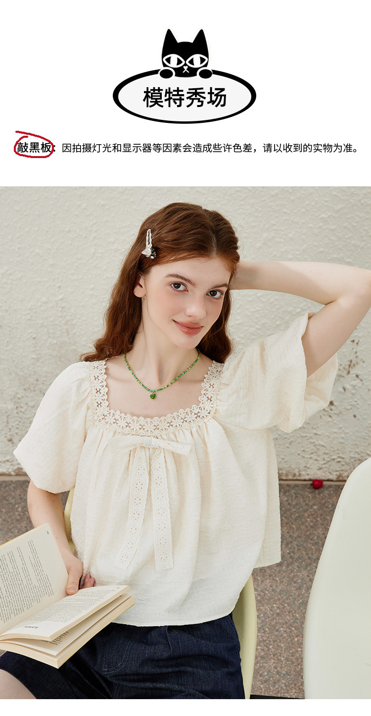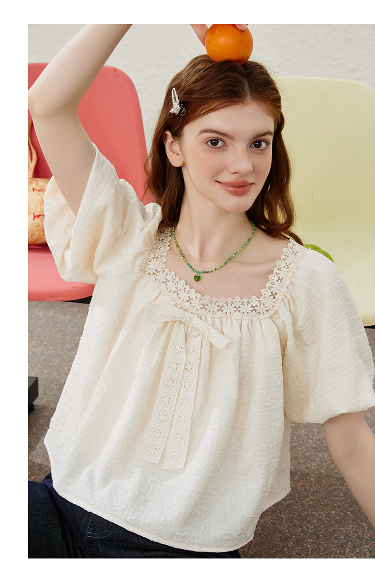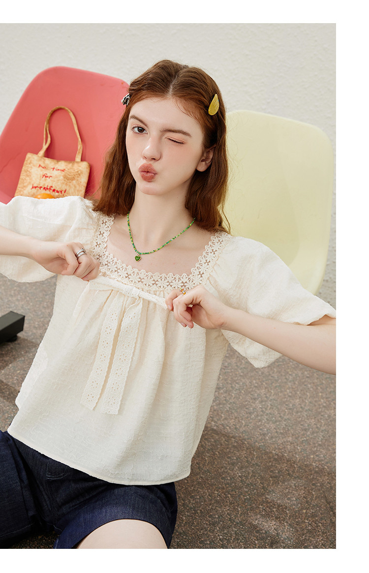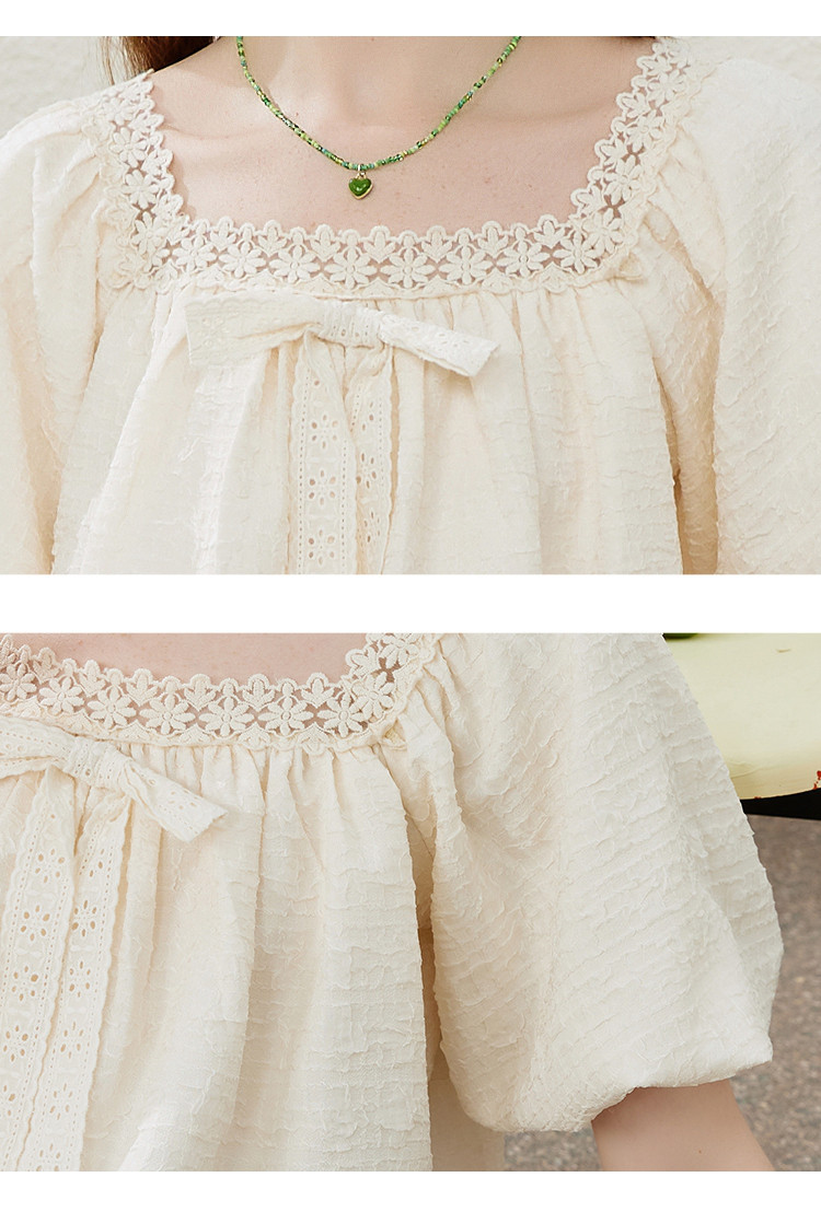 商品名称:【法式气质】蕾丝花边泡泡袖女式衬衫夏季纯色优雅短袖 019421