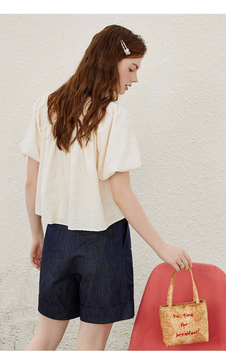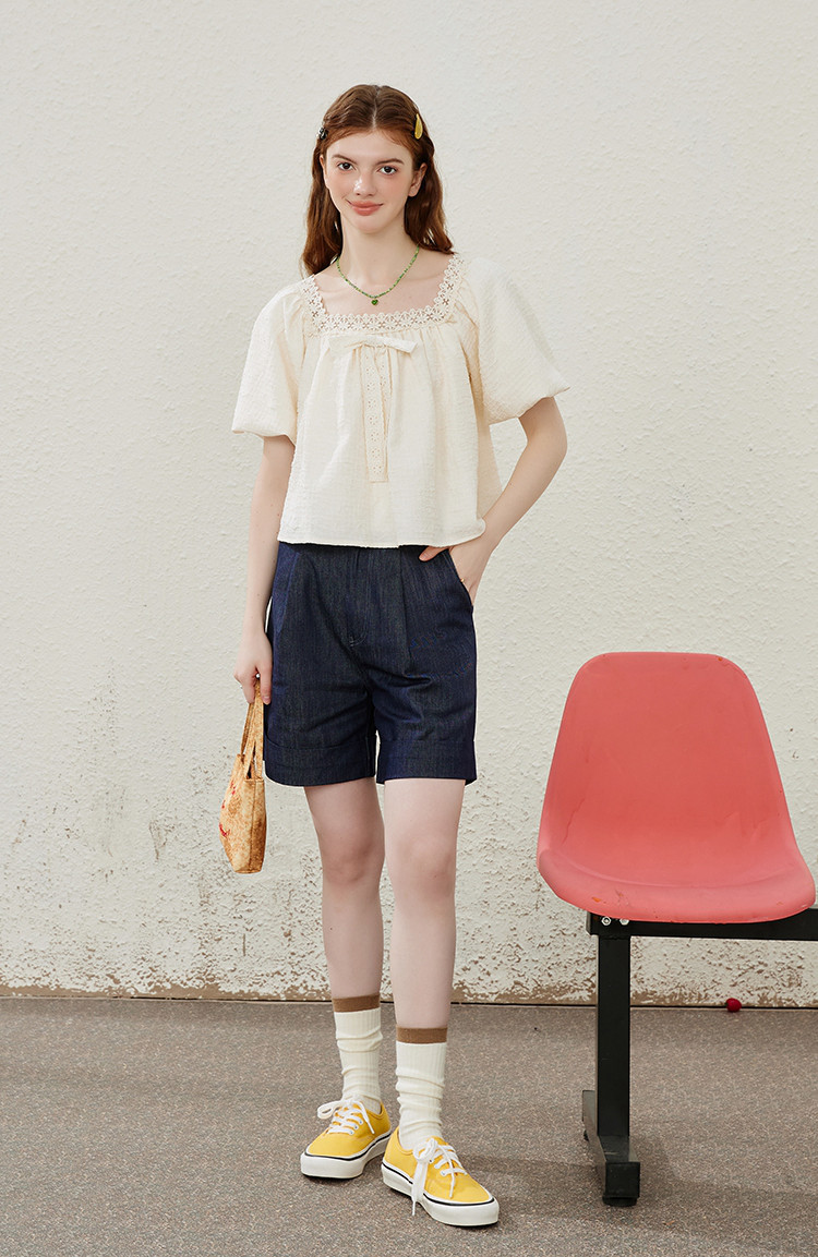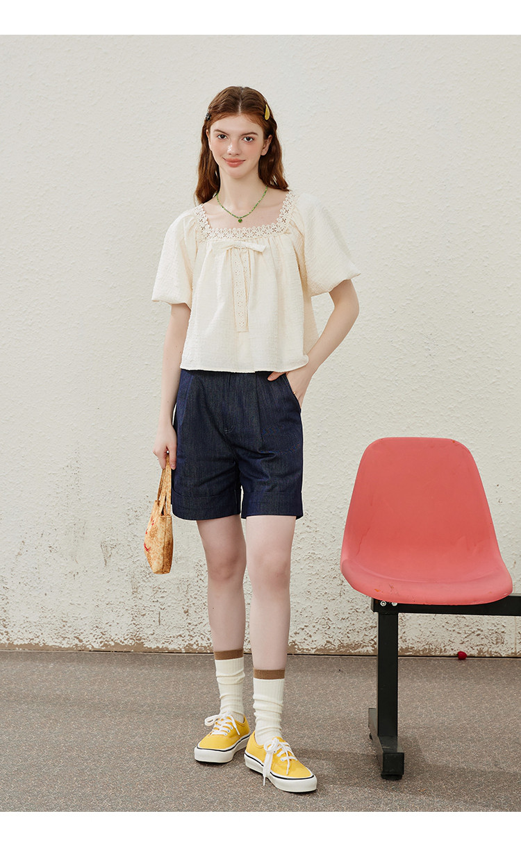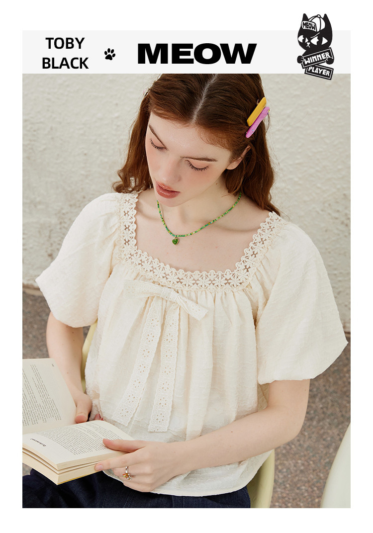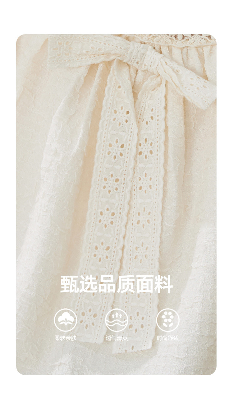 商品名称:【法式气质】蕾丝花边泡泡袖女式衬衫夏季纯色优雅短袖 019421