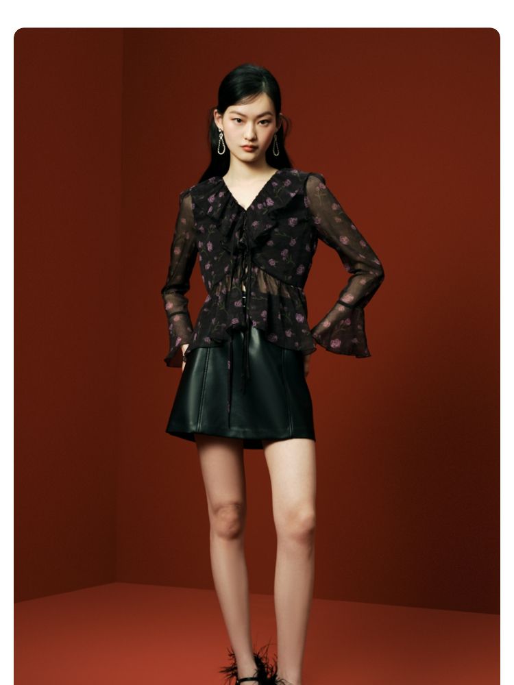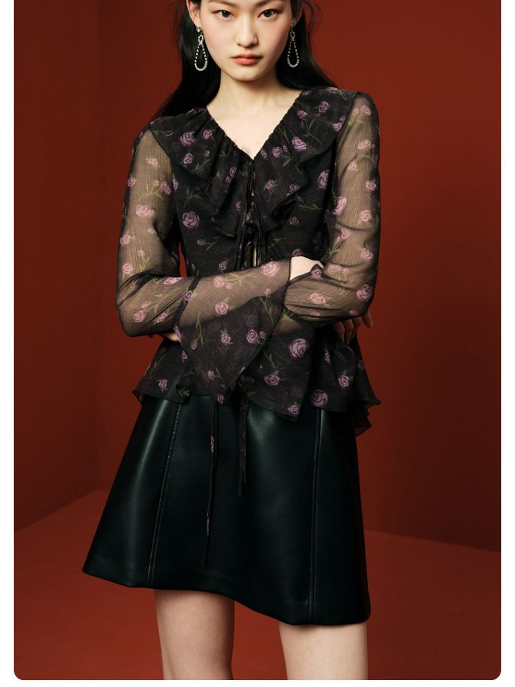 【玫瑰印花】2024春夏新款碎花V领雪纺衫九分袖衬衫女 253073