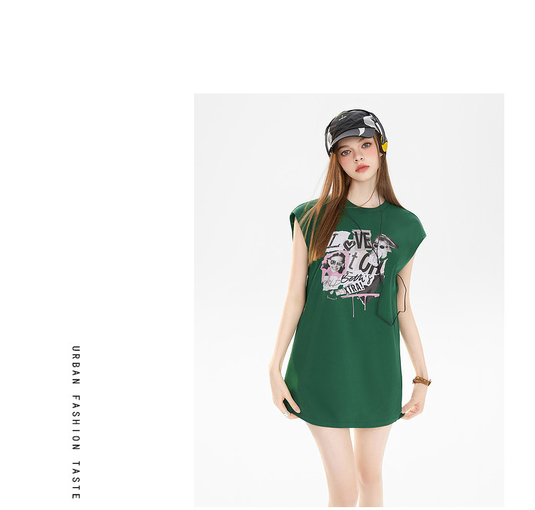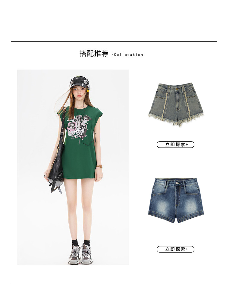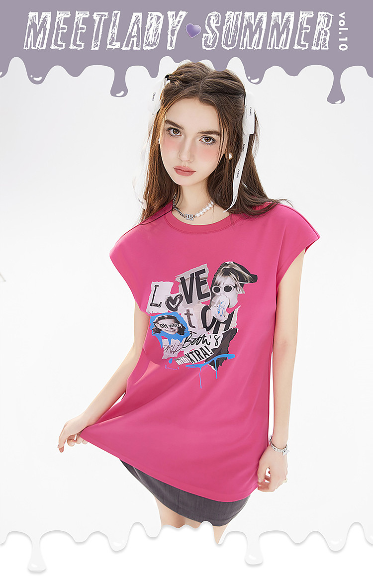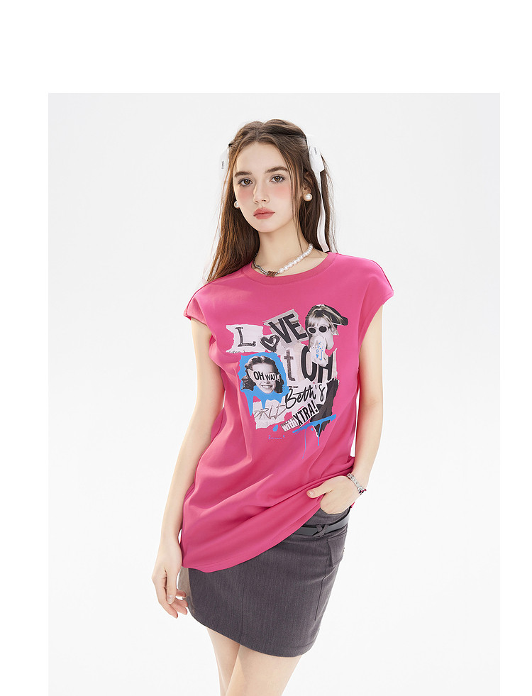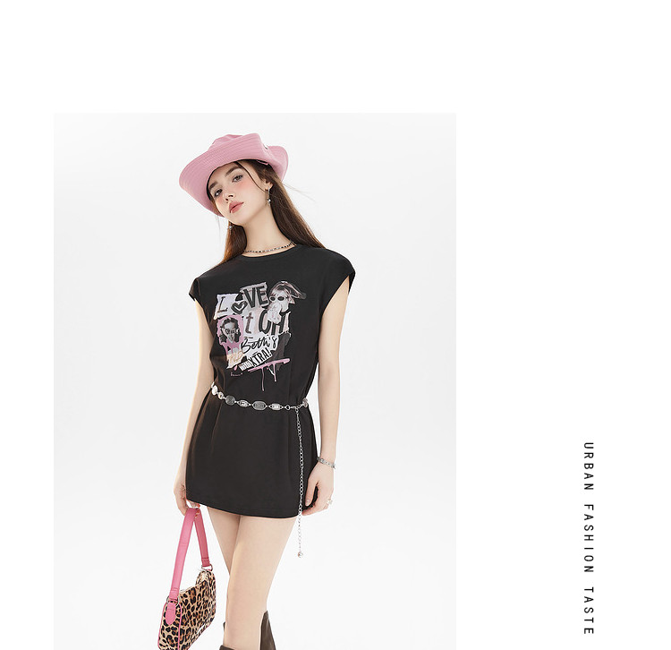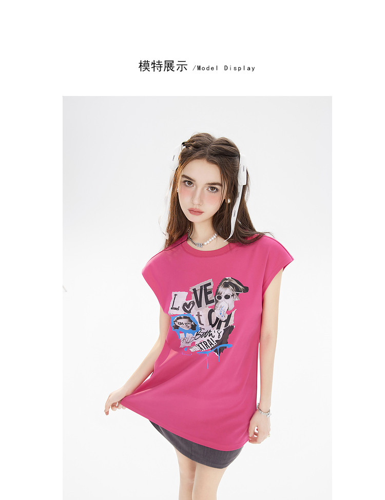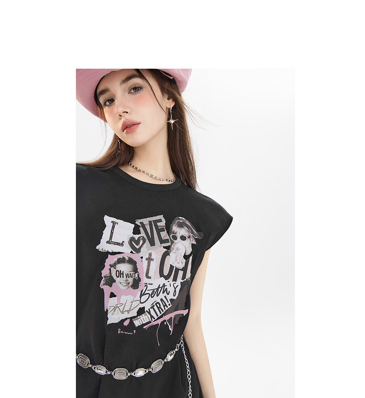 商品名称:夏装美式复古辣妹T恤女无袖印花拼接设计感上衣 483156