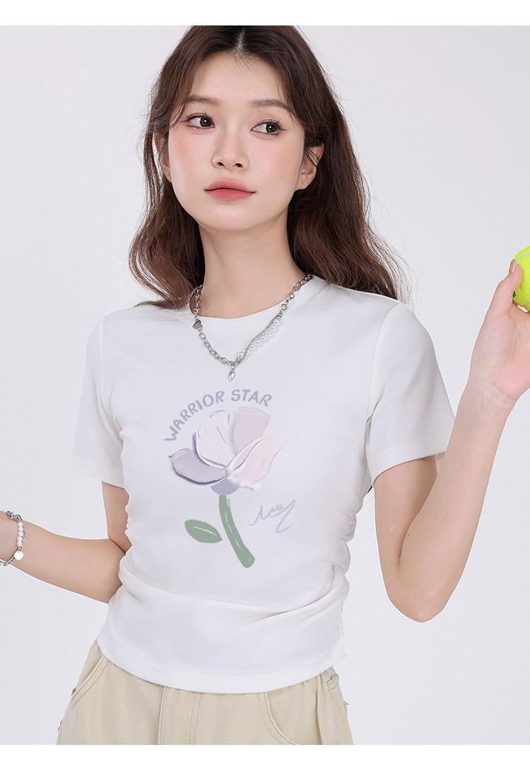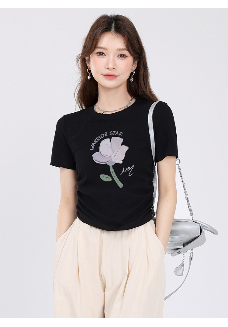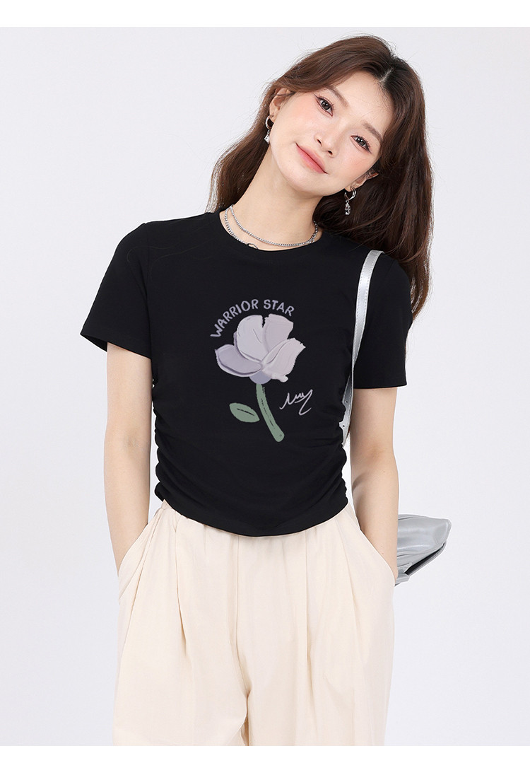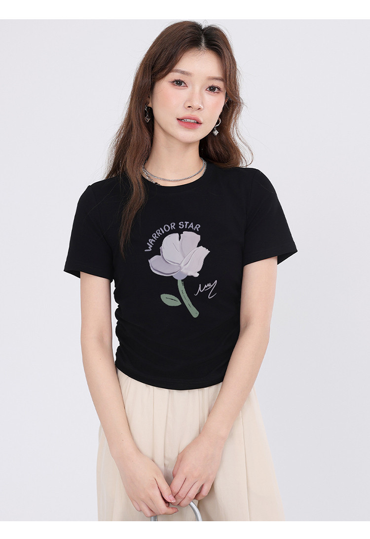 【女装正肩】女式短款小个子T恤紧身显瘦夏季小众抽褶设计感短袖 356179
