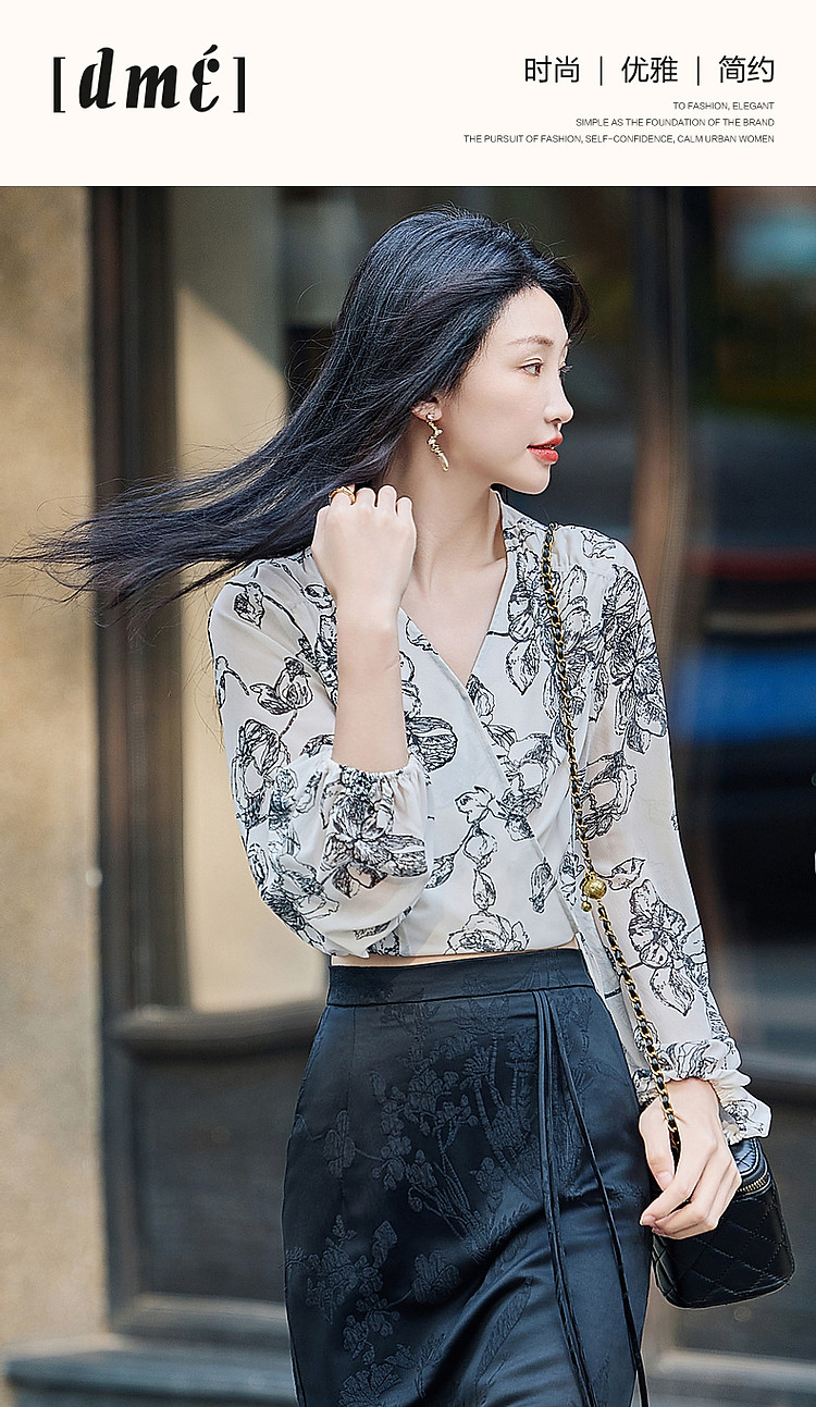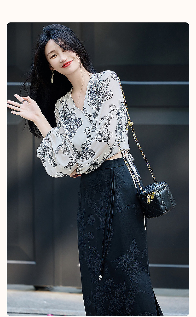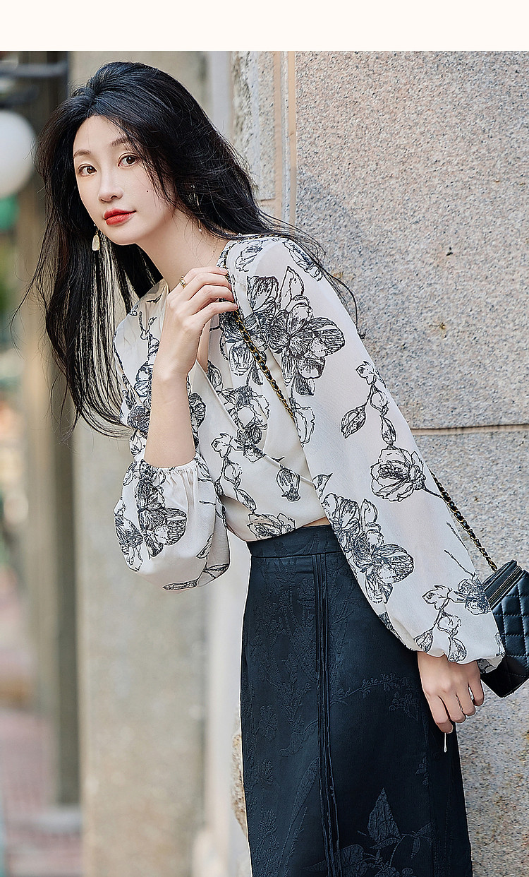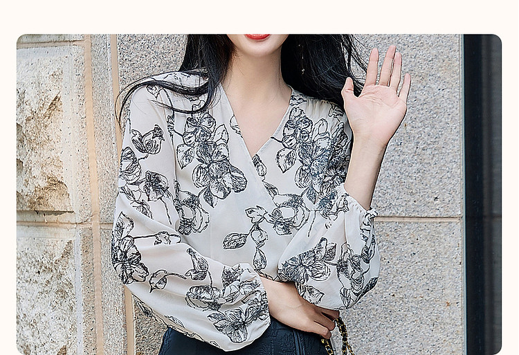 商品名称:【韩风大姐姐】夏素描印花衬衫设计感交叉领灯笼袖藏肉衬衣女上衣 011329