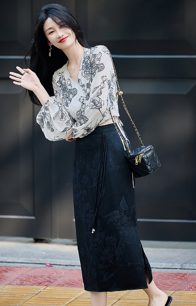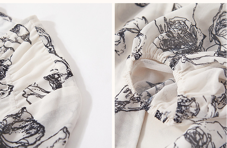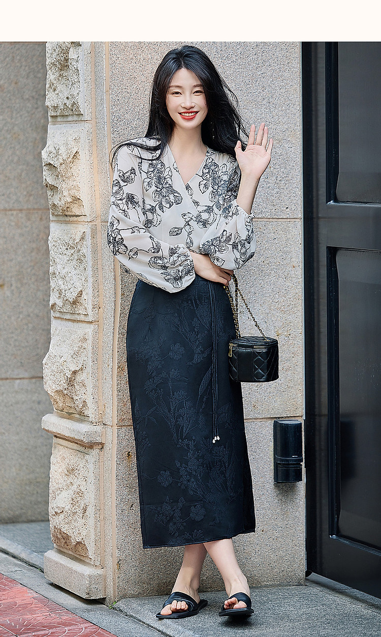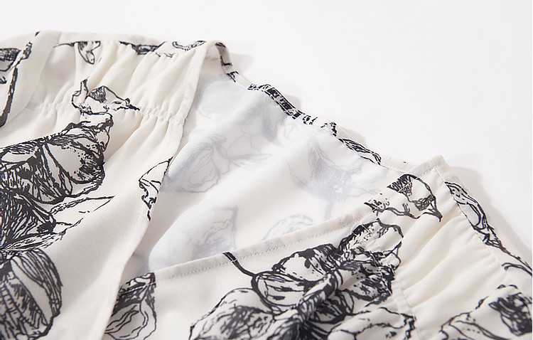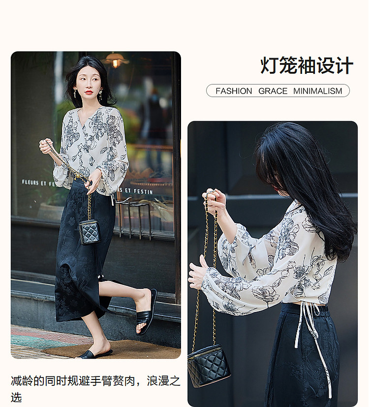商品名称:【韩风大姐姐】夏素描印花衬衫设计感交叉领灯笼袖藏肉衬衣女上衣 011329