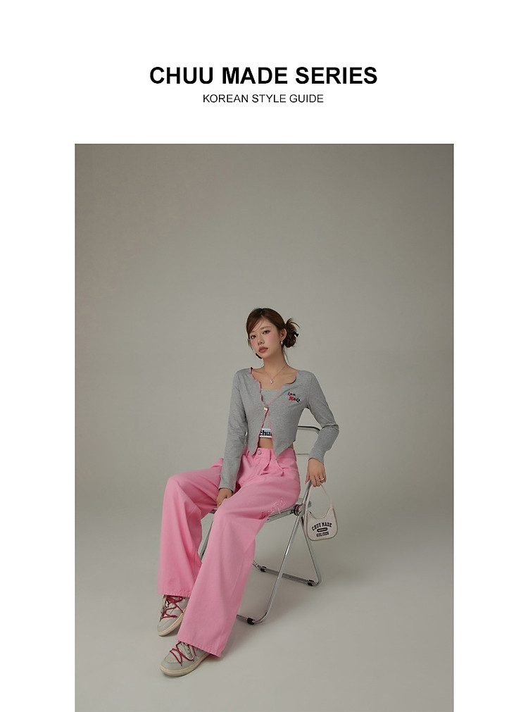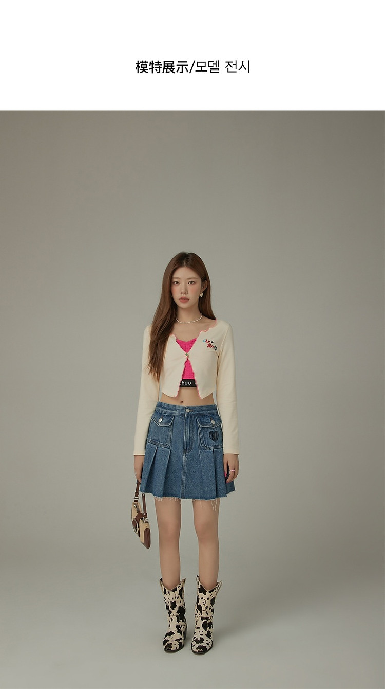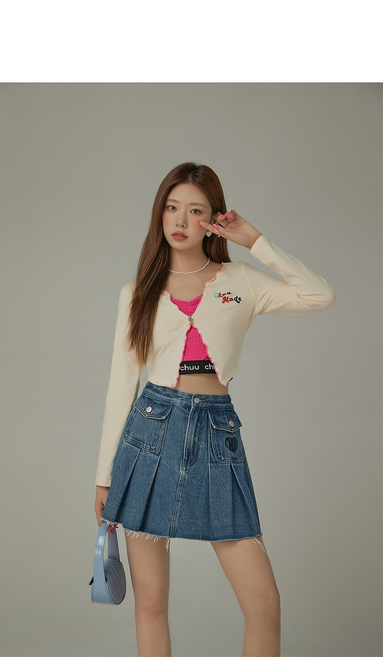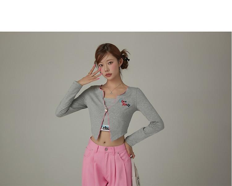 CHUU刺绣字母外套女春秋撞色木耳边长袖开衫上衣 364499