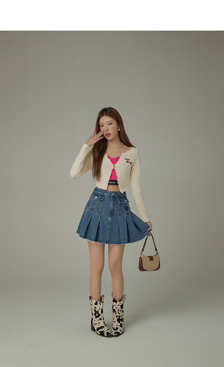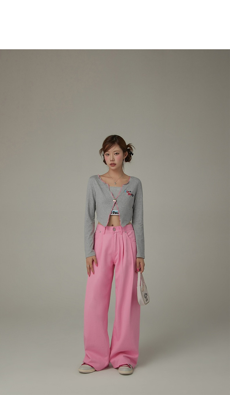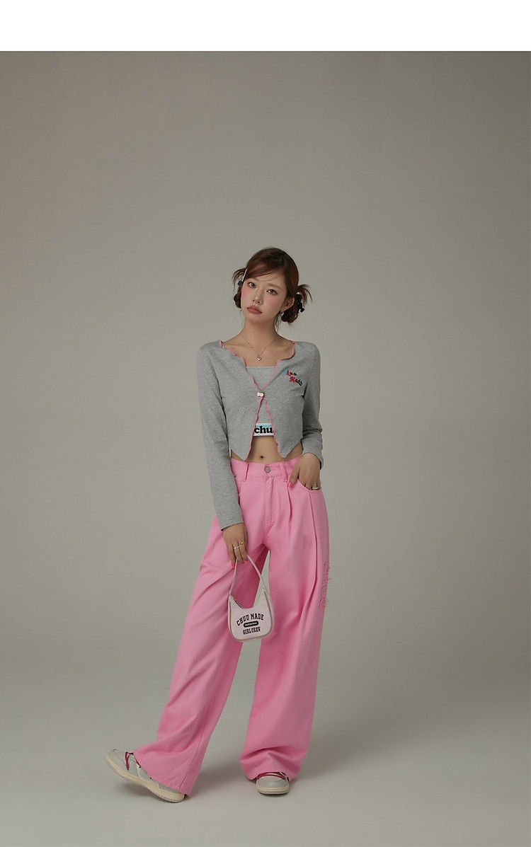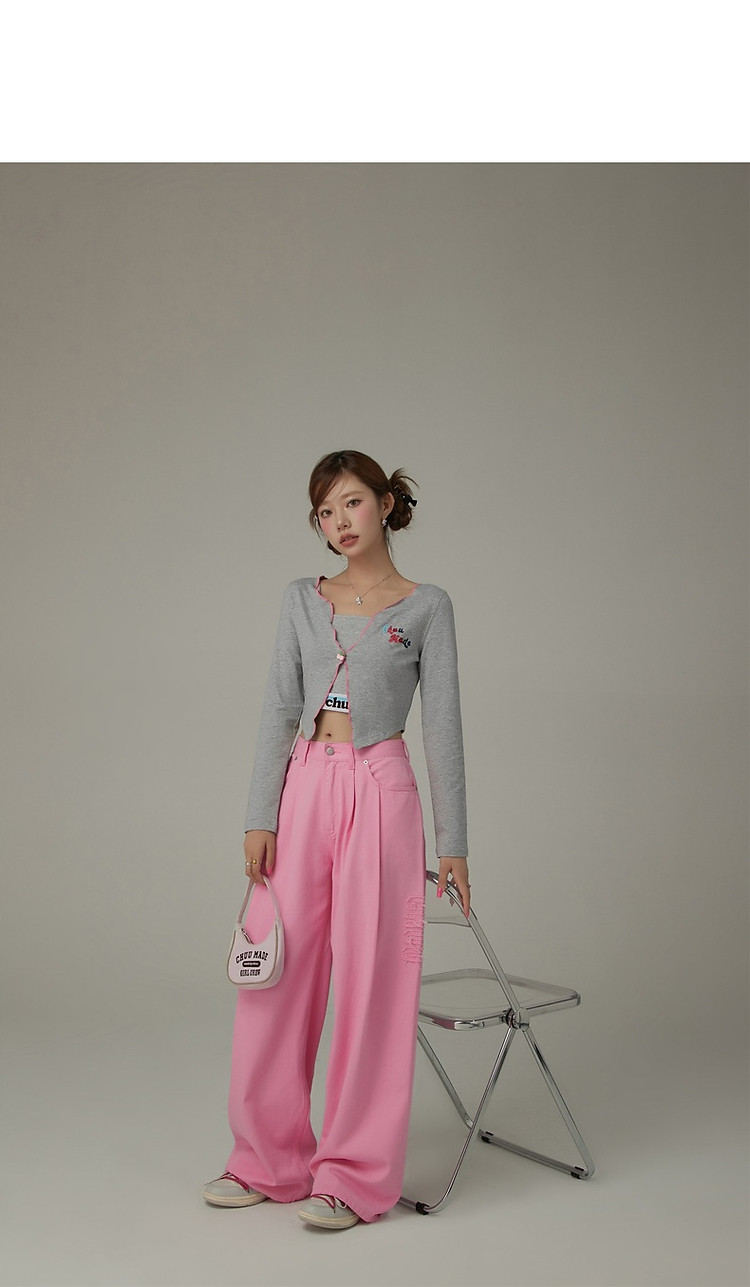 CHUU刺绣字母外套女春秋撞色木耳边长袖开衫上衣 364499