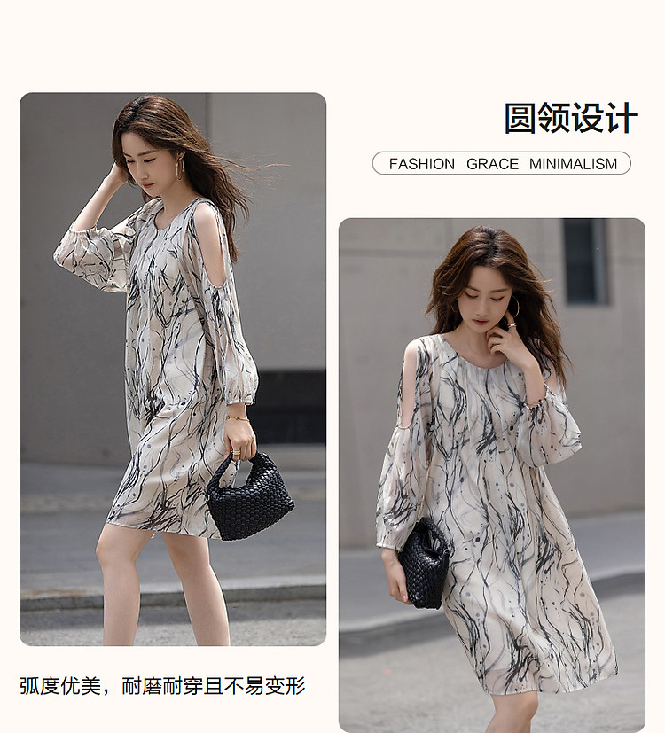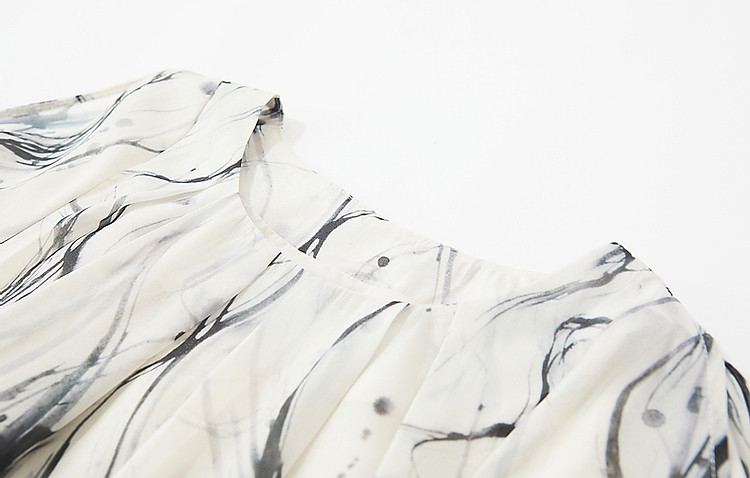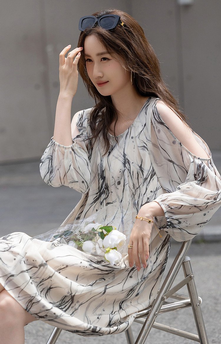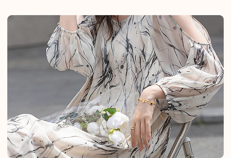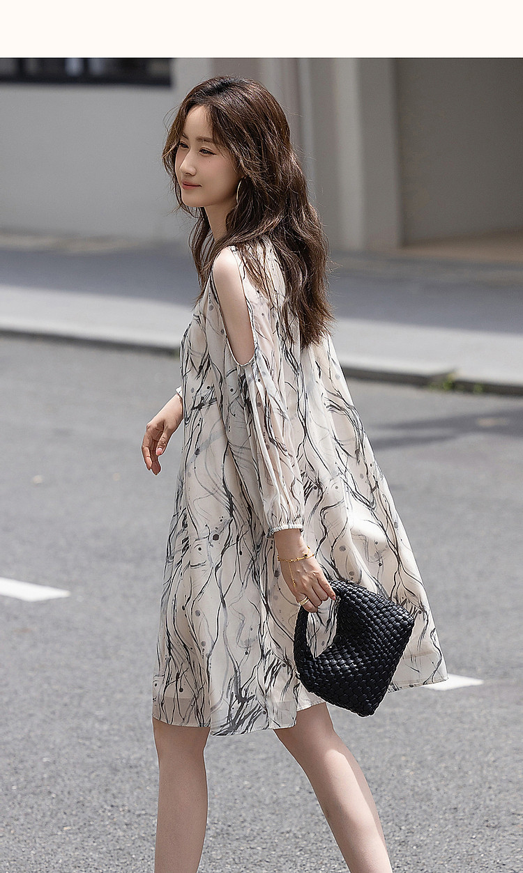 商品名称:【在水一方】夏国风新中式清雅水墨印花露肩轻盈藏肉女式连衣裙 975681