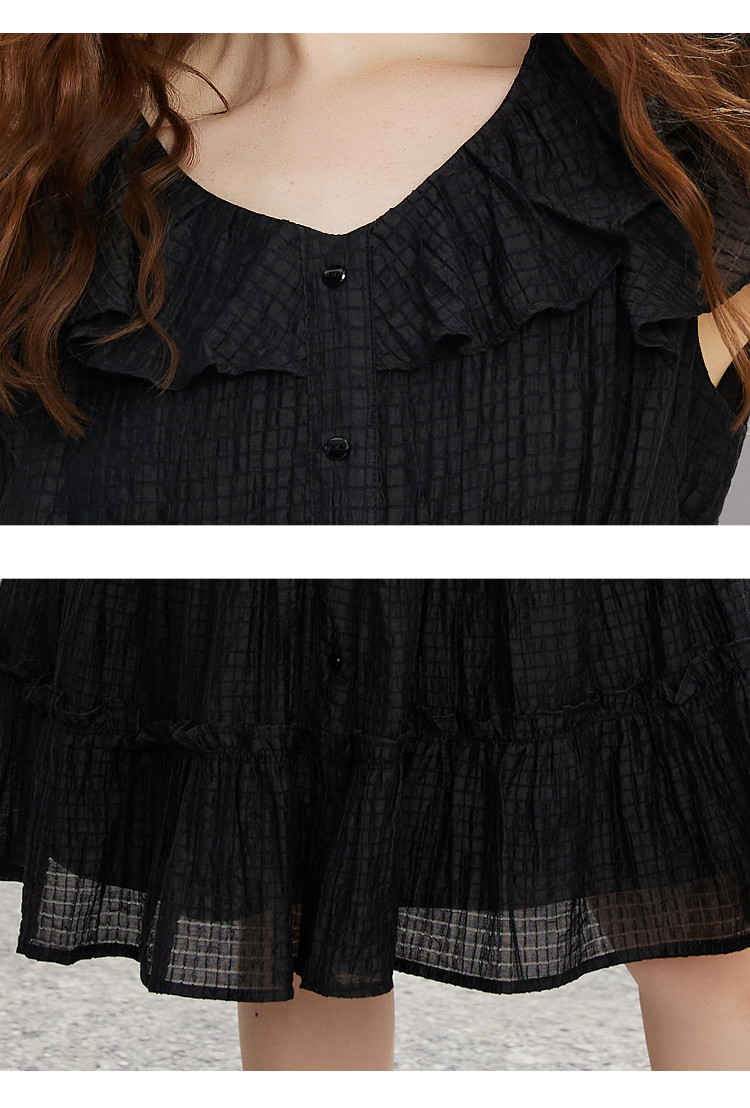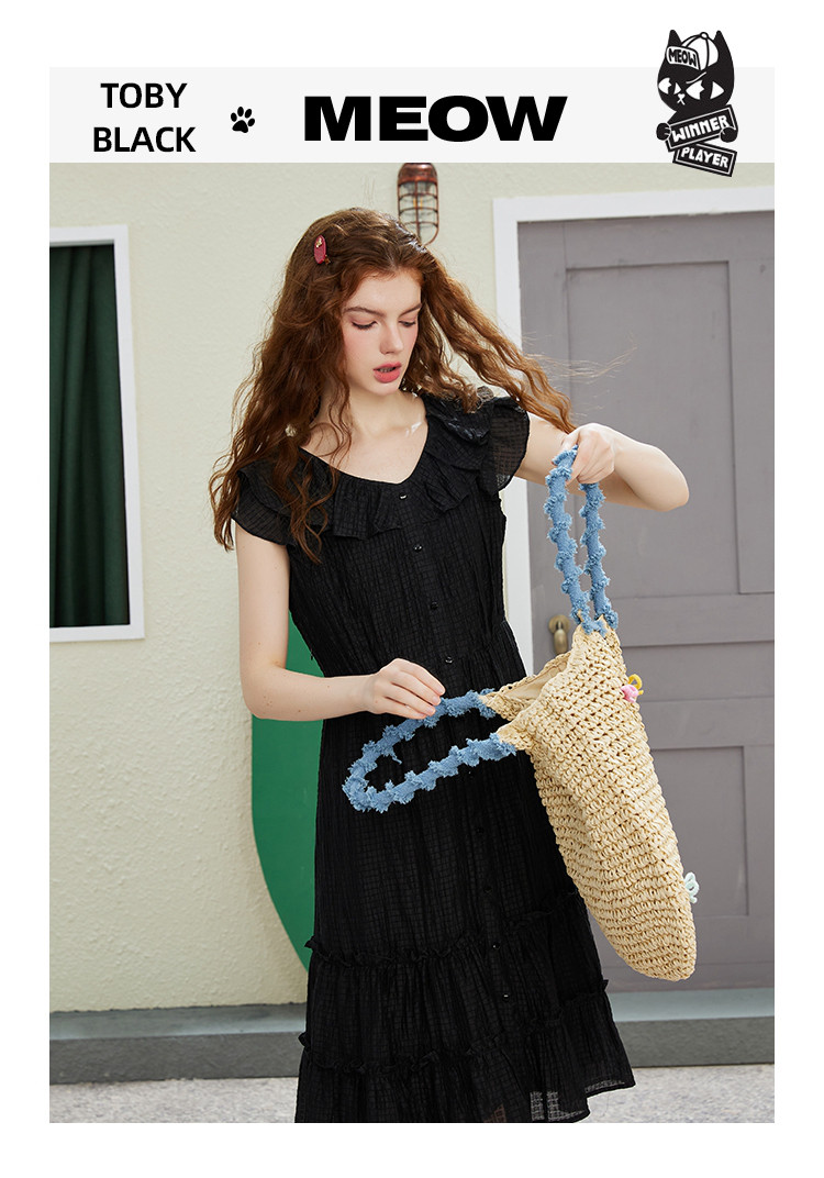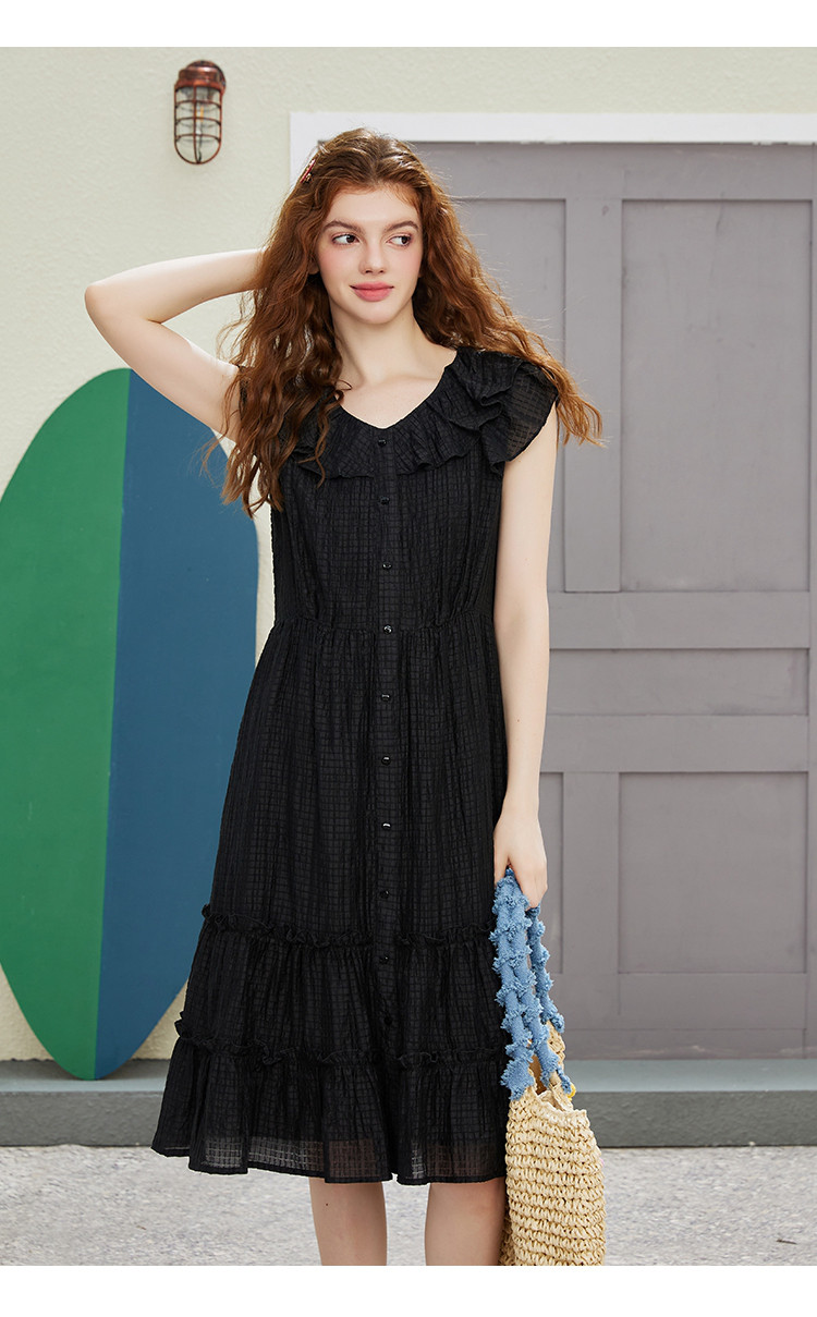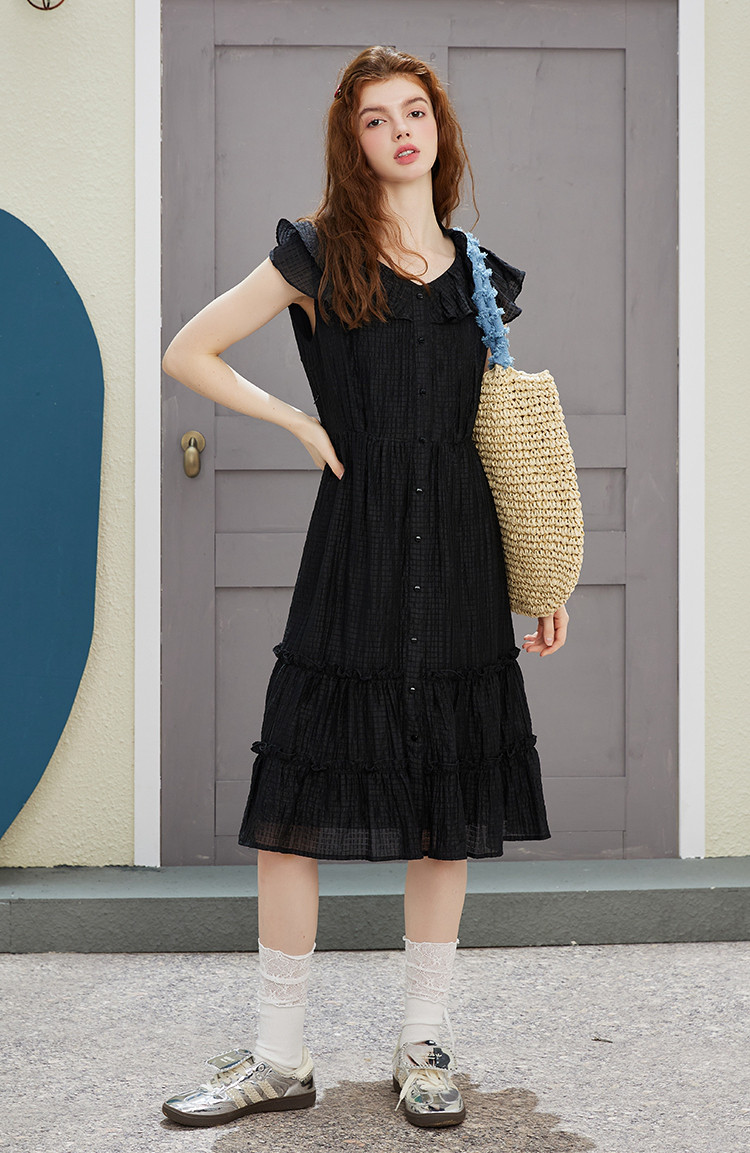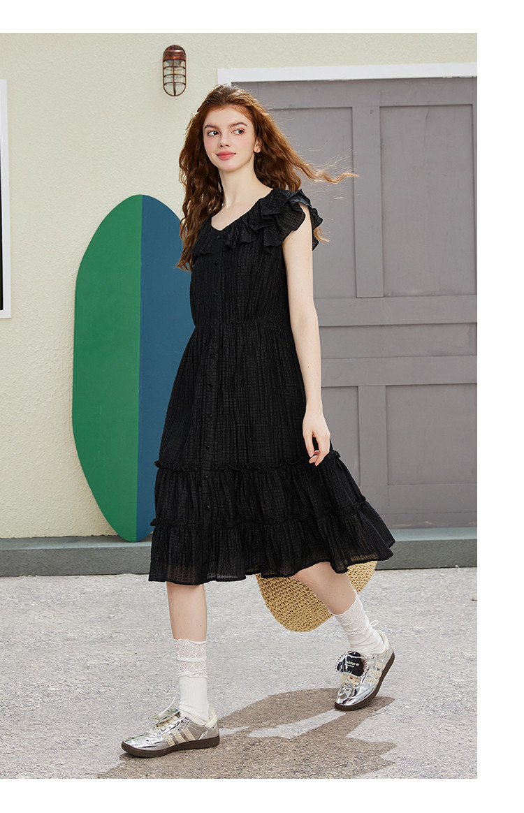 商品名称:飞飞袖简约设计感连衣裙夏季圆领中款优雅气质小黑裙 675037
