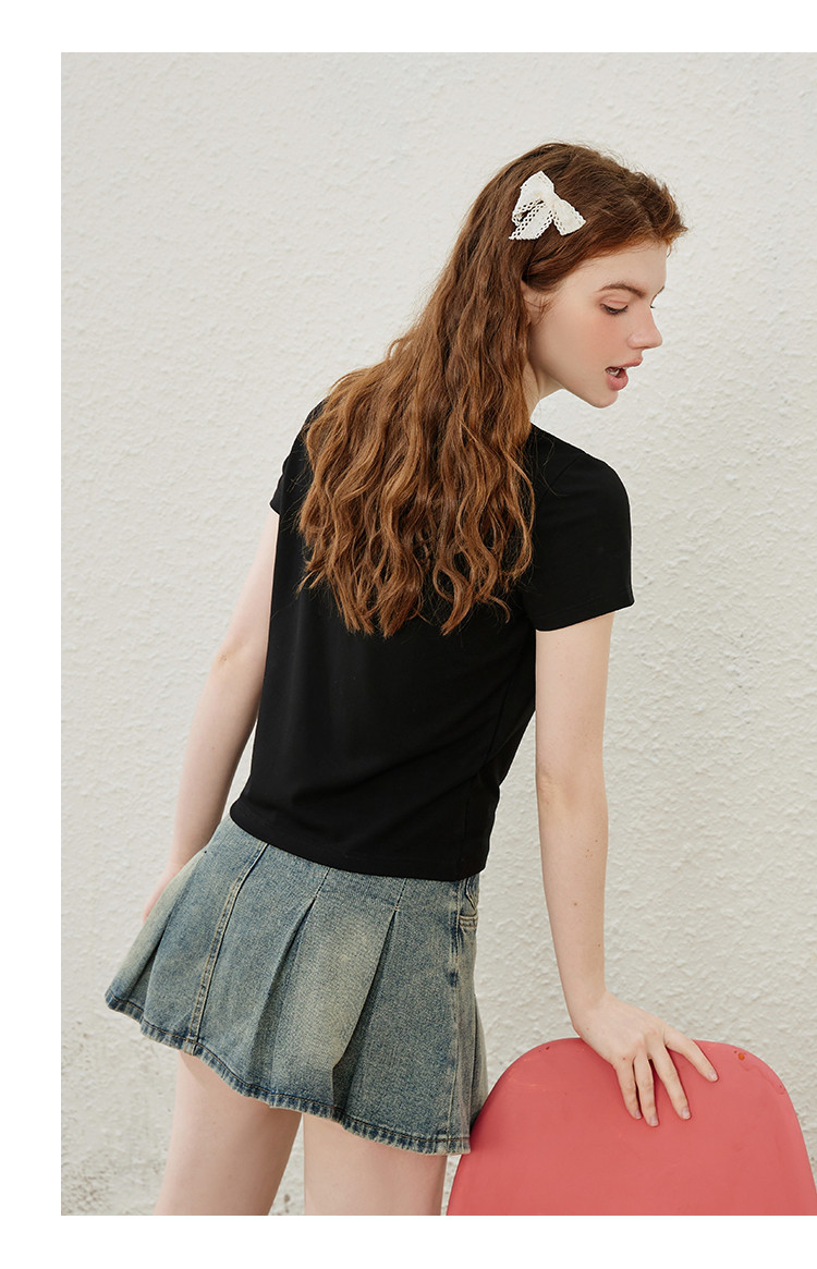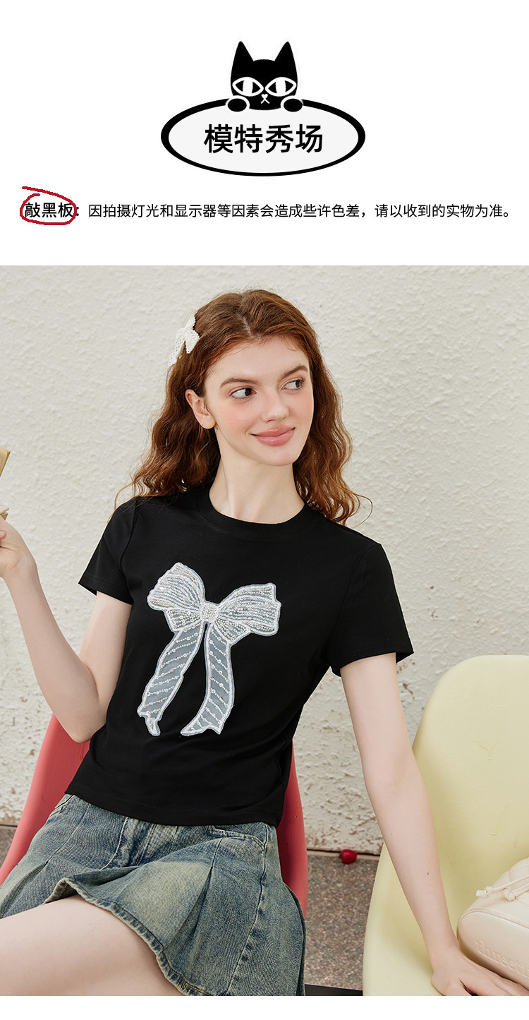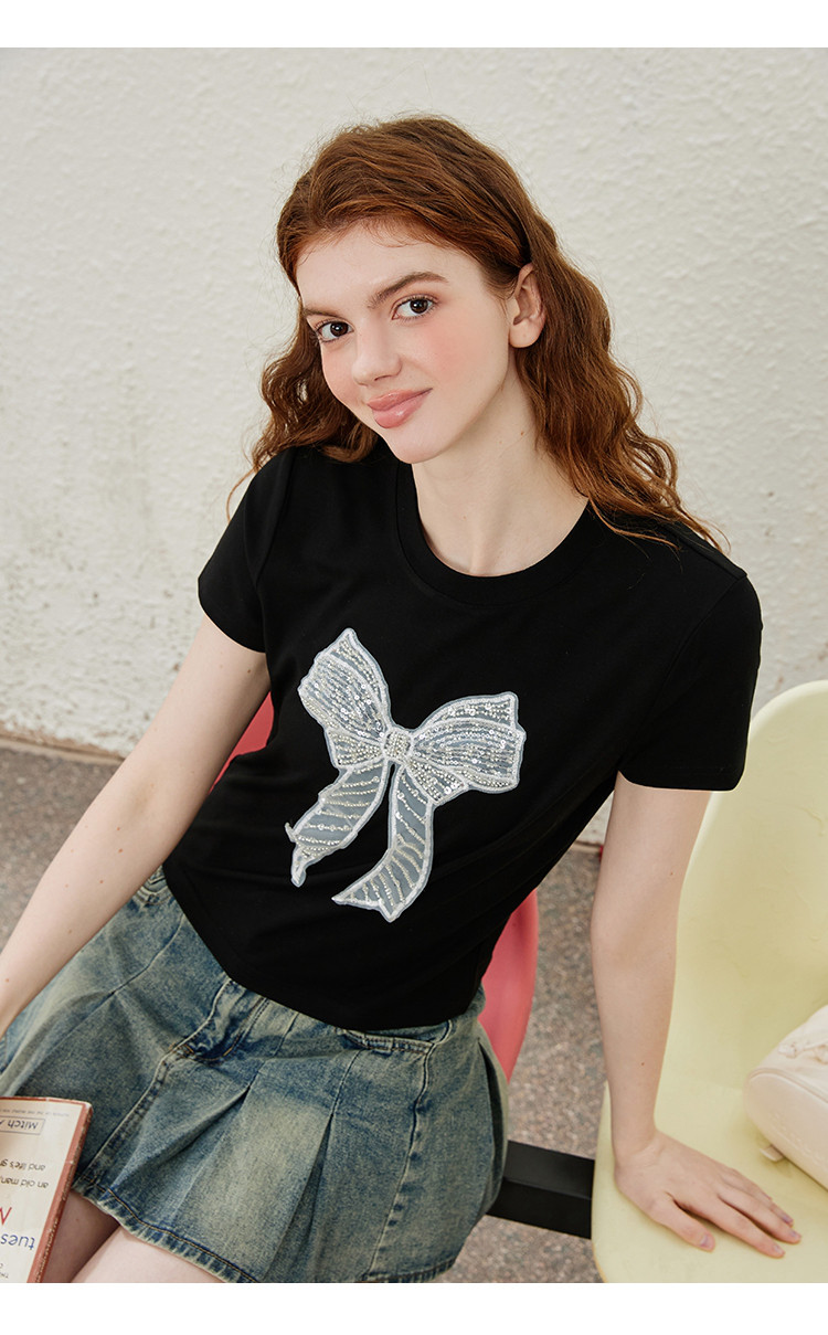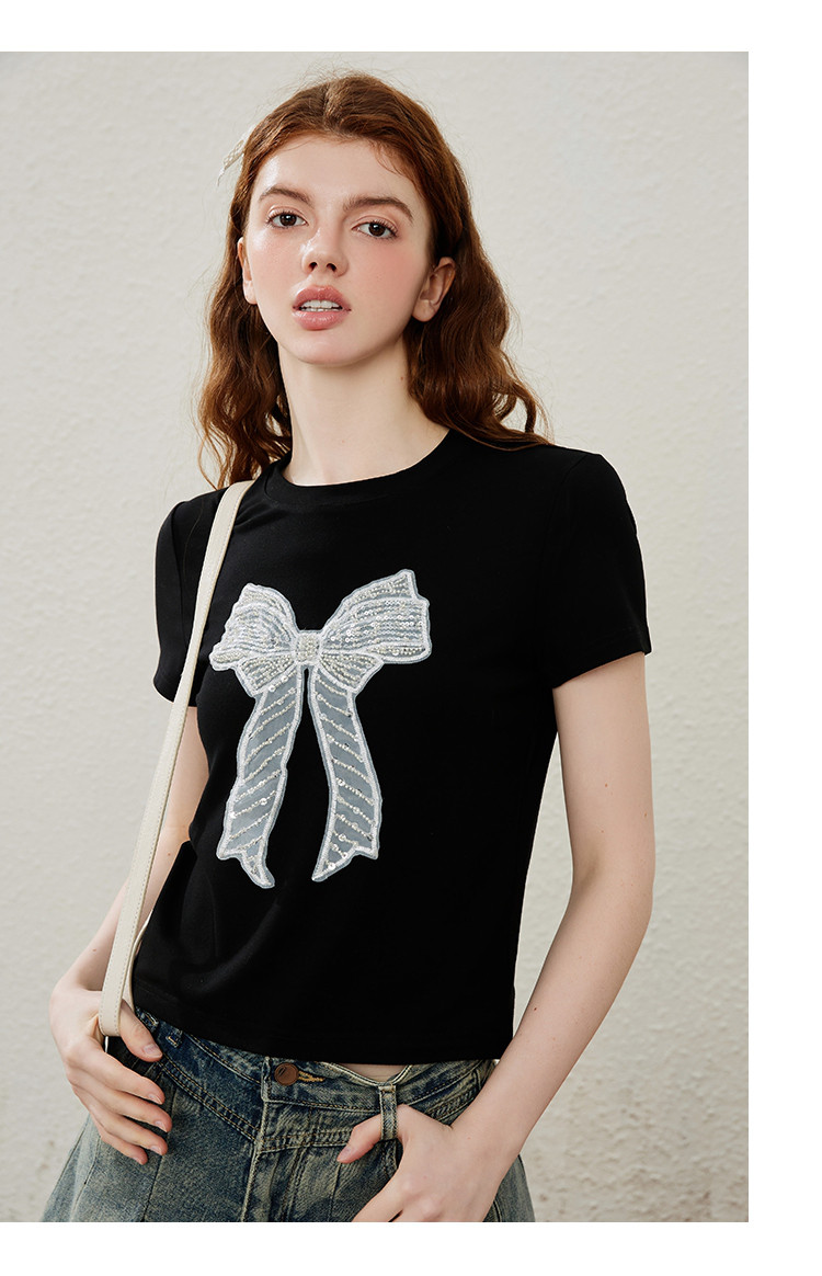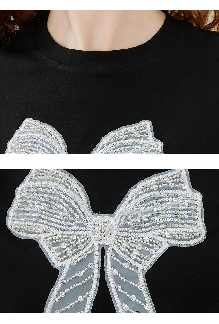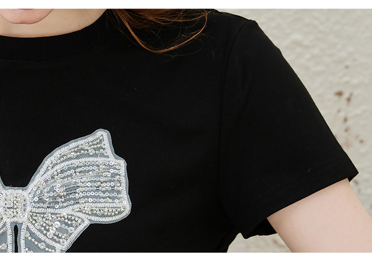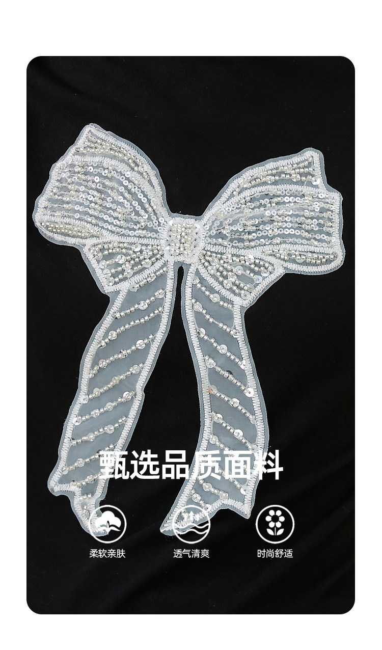 商品名称:重工刺绣蝴蝶结钉珠设计感个性女式T恤夏季休闲短袖上衣 404445