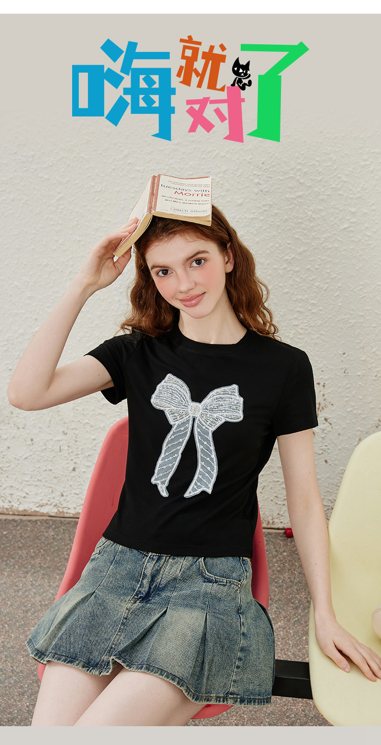 重工刺绣蝴蝶结钉珠设计感个性女式T恤夏季休闲短袖上衣 404445