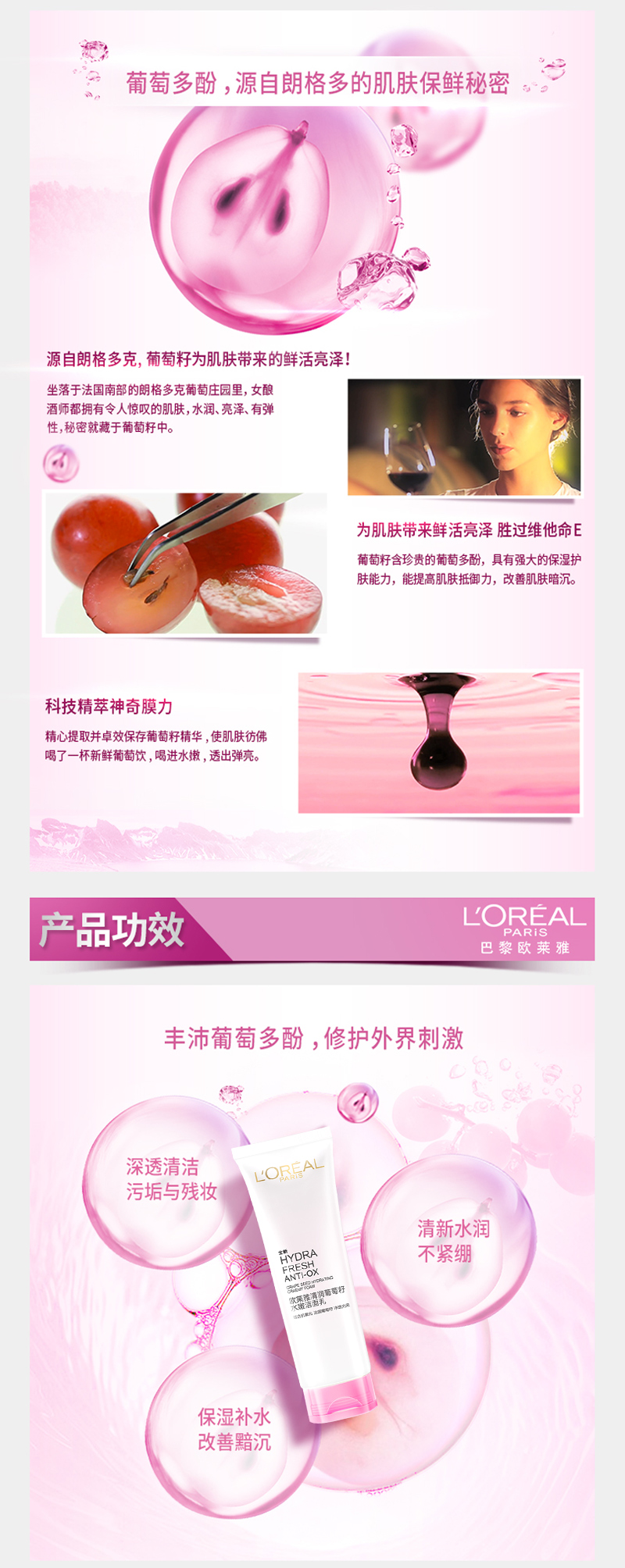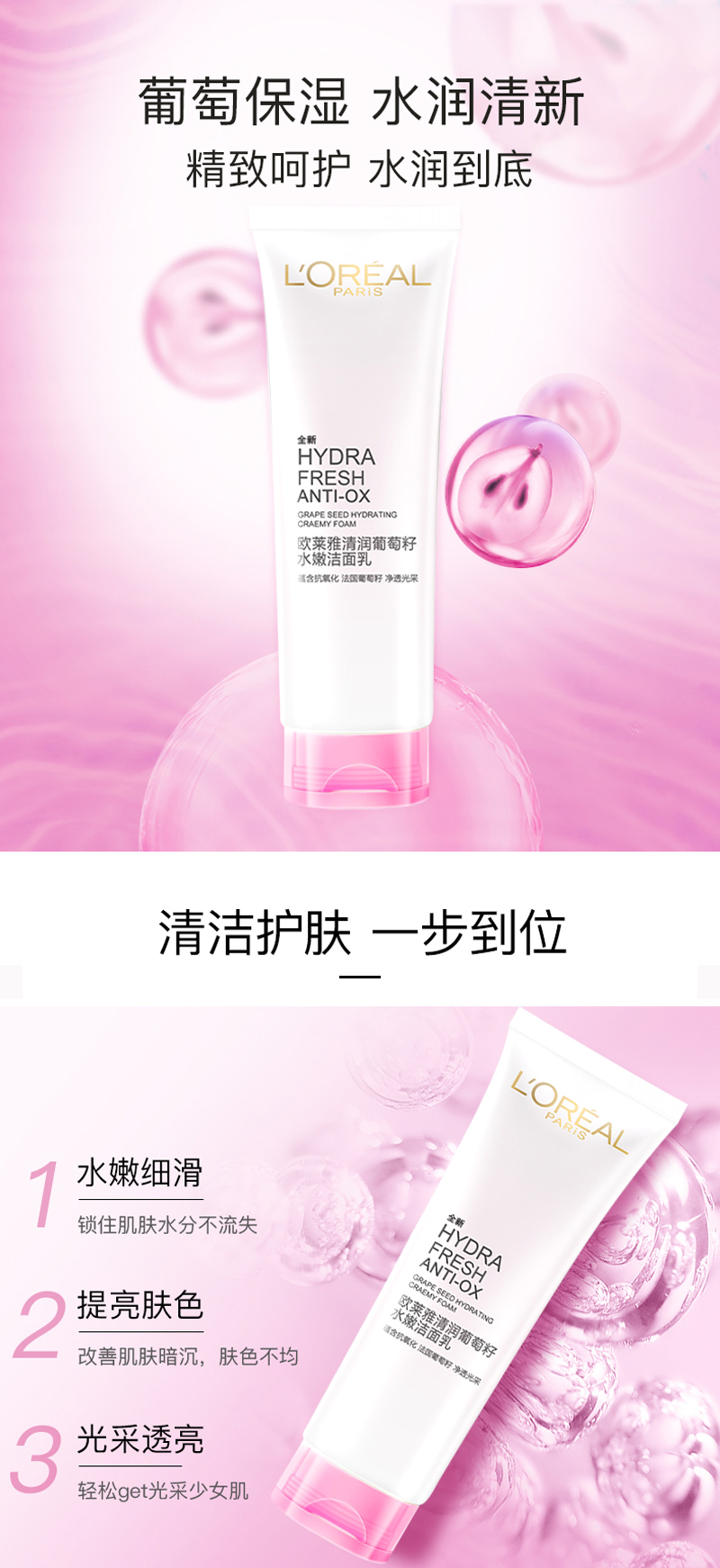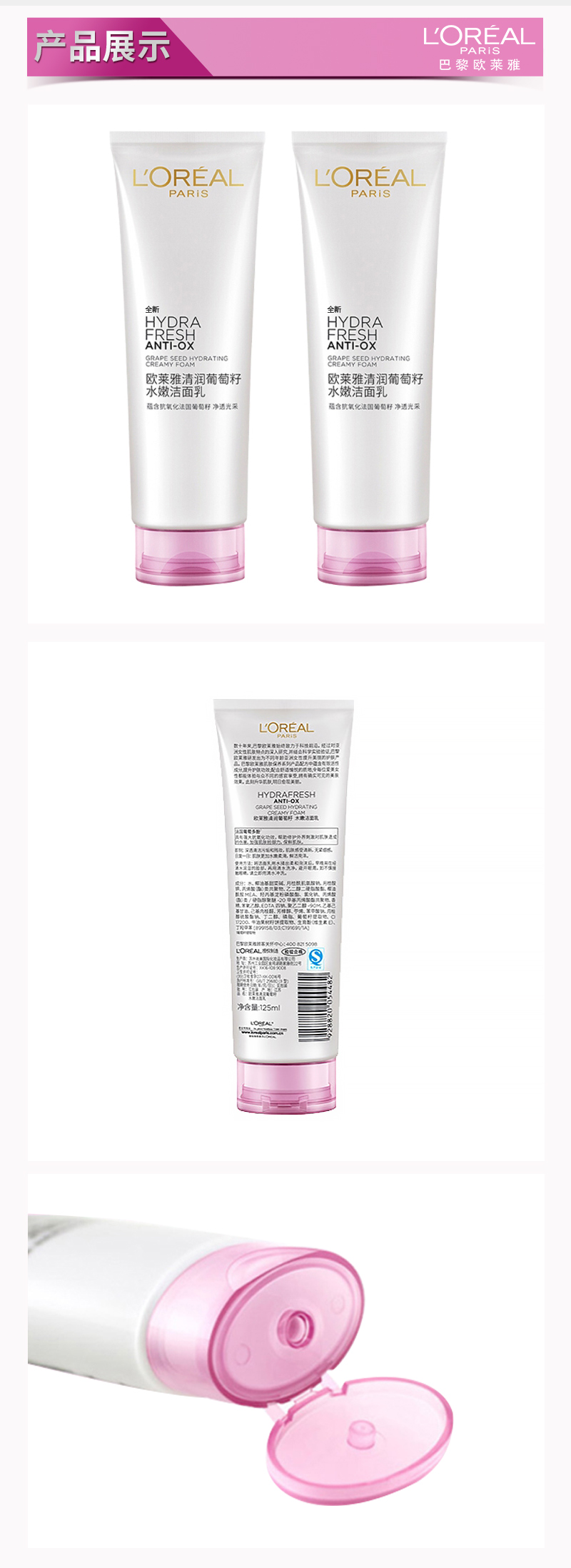 商品名称:L'oreal/欧莱雅 葡萄籽洁面乳 125g 补水保湿 深层温和清洁