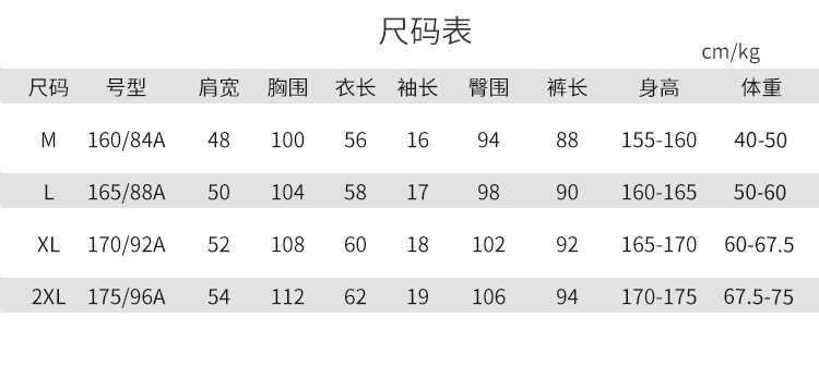 尺码 肩宽(cm) 袖长(cm) 上装号型 下装号型 衣长(cm) 身高(cm) 裤长(cm) 体重(kg) 臀围(cm) 胸围(cm) 号型