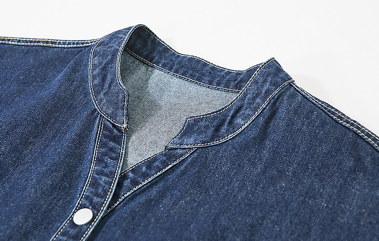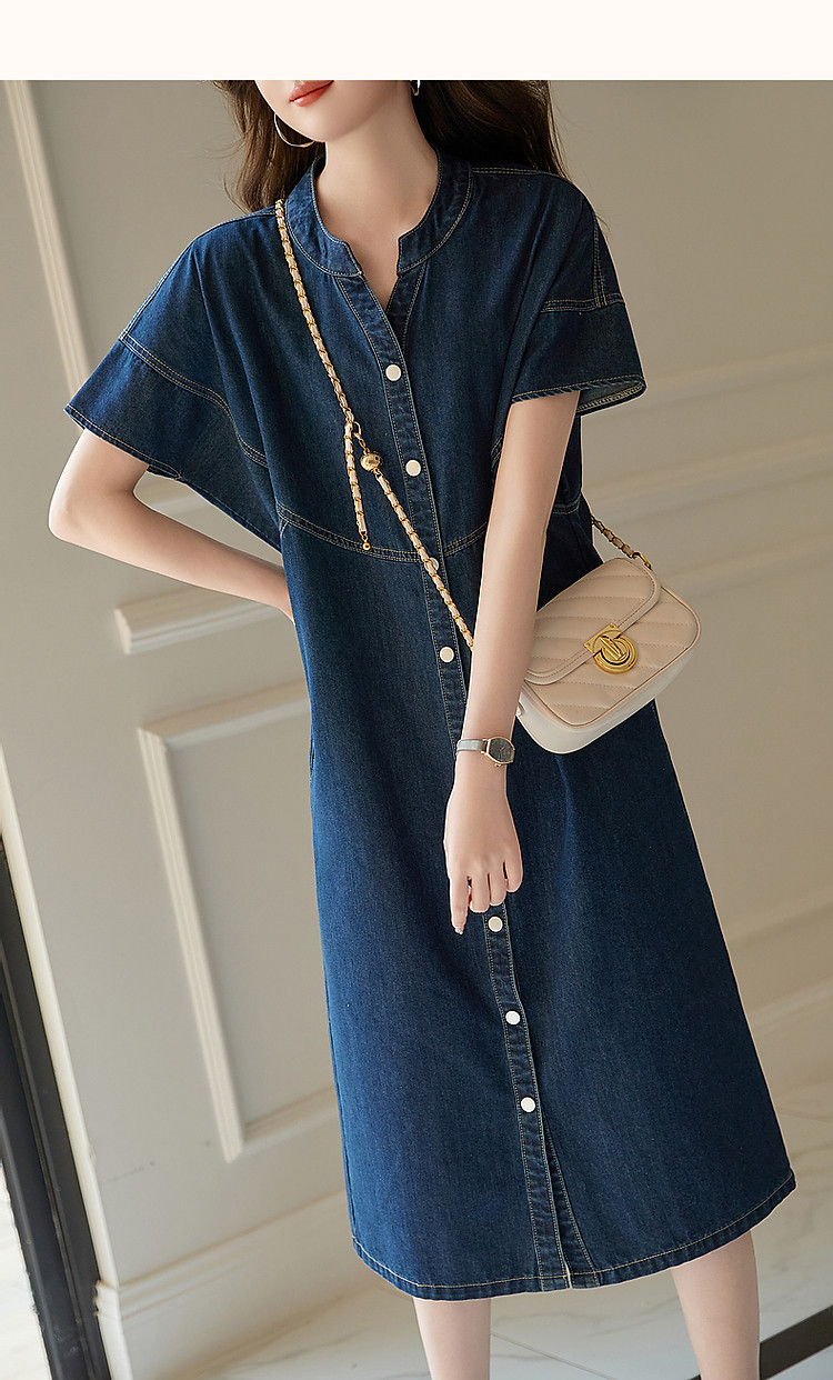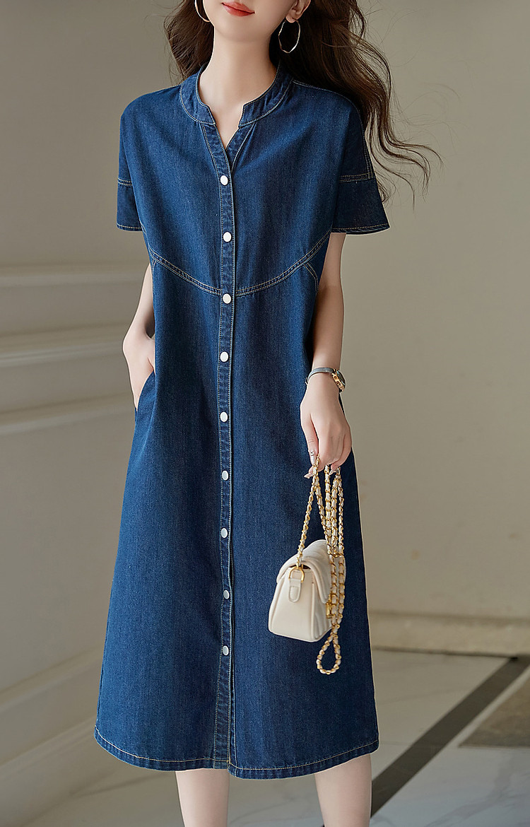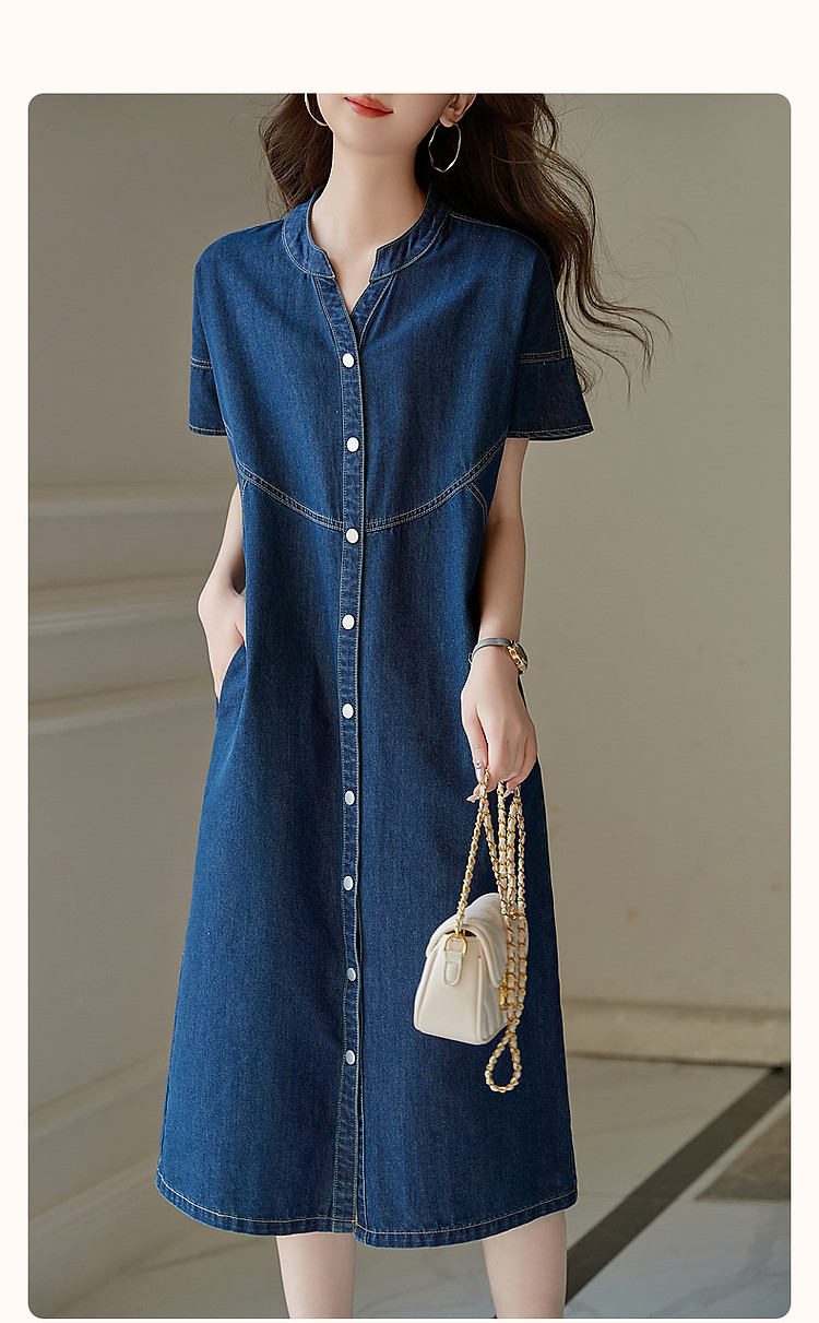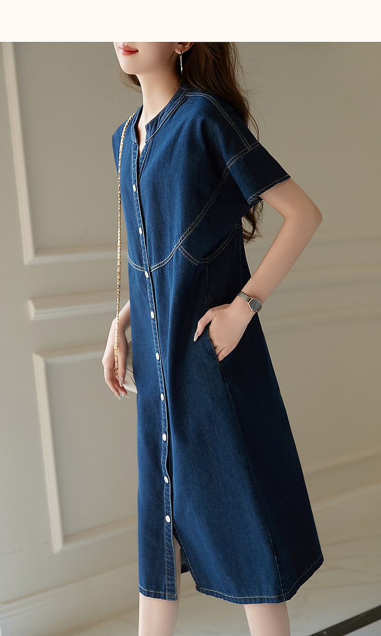 【洒脱自在随心】夏V领简约风短袖口袋装饰直筒牛仔连衣裙女中长 084673