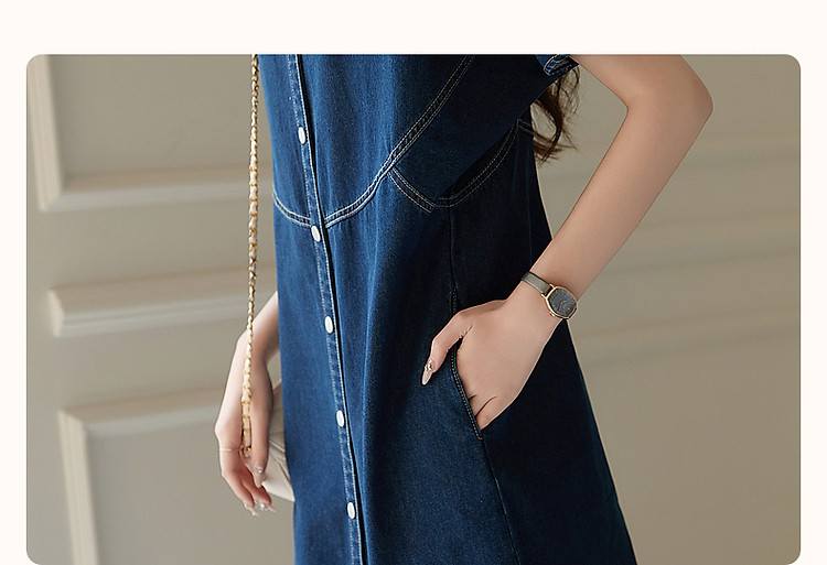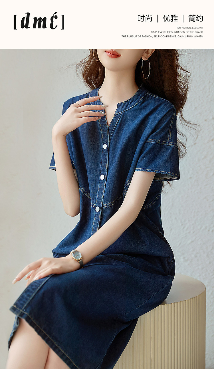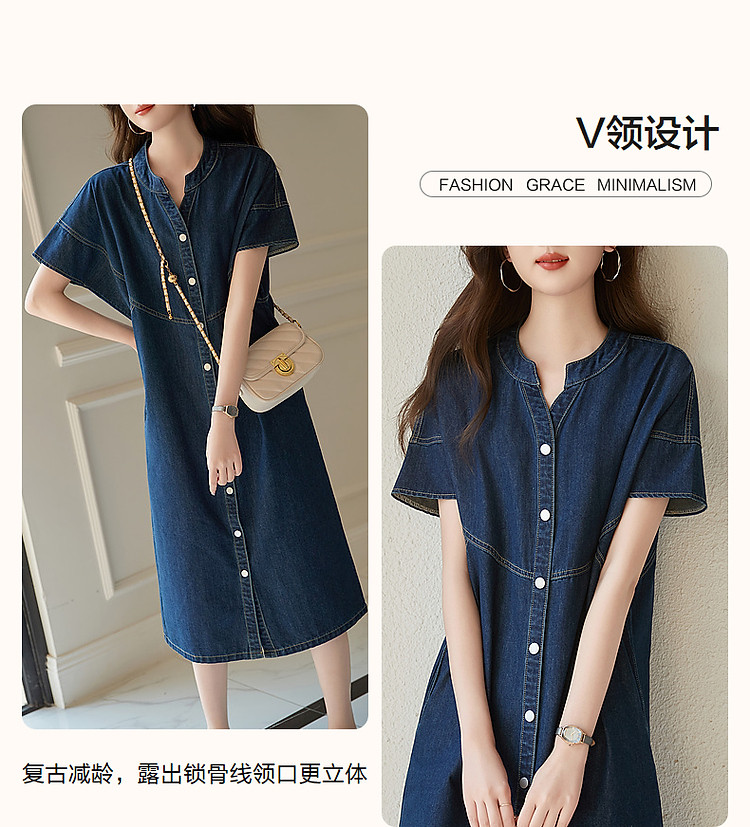 商品名称:【洒脱自在随心】夏V领简约风短袖口袋装饰直筒牛仔连衣裙女中长 084673