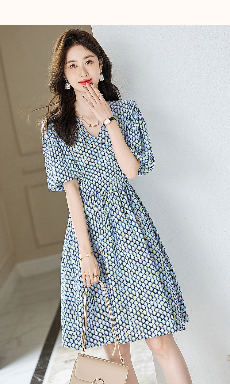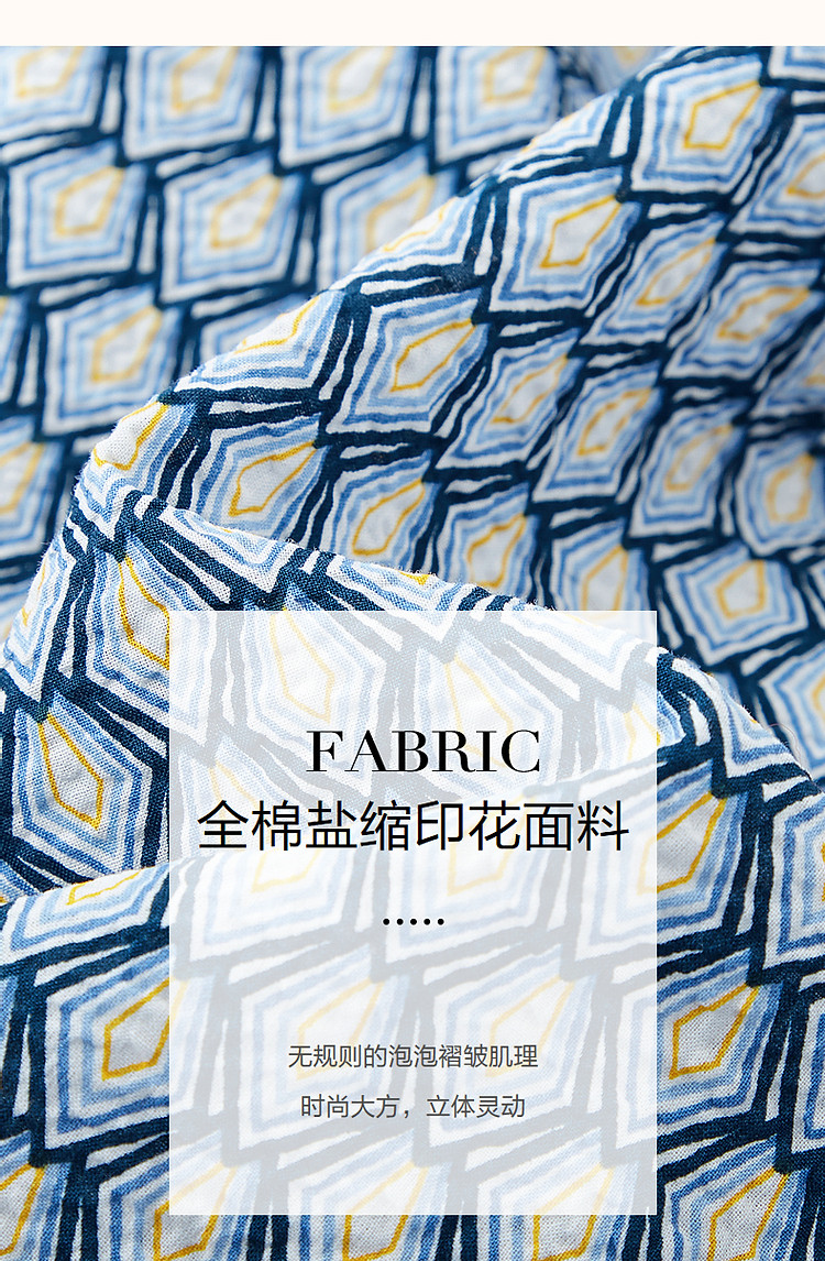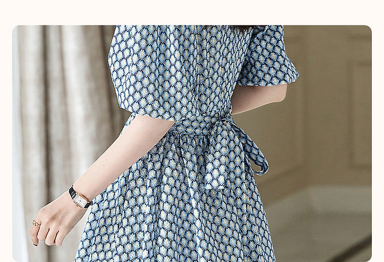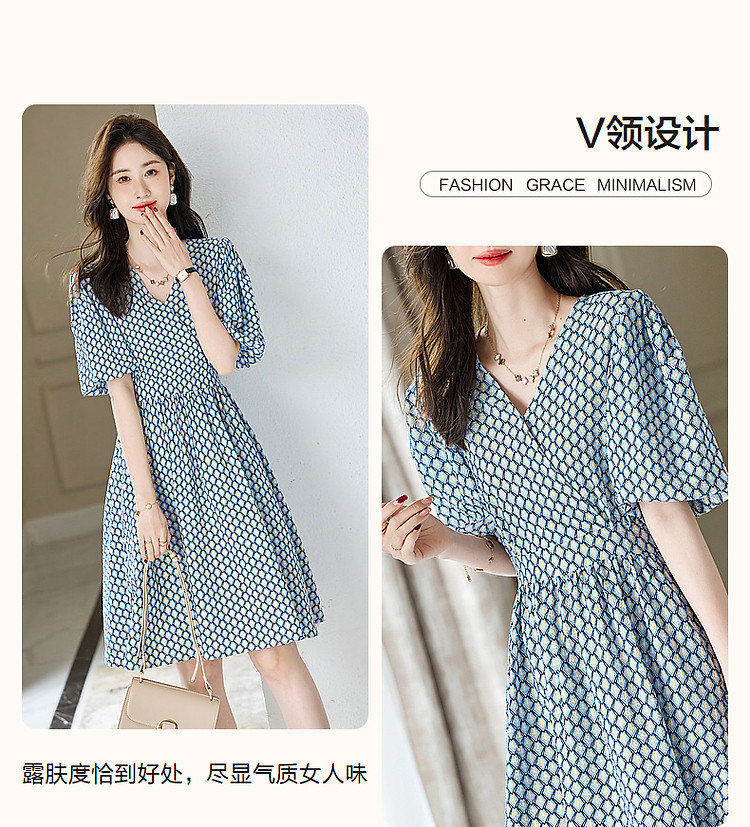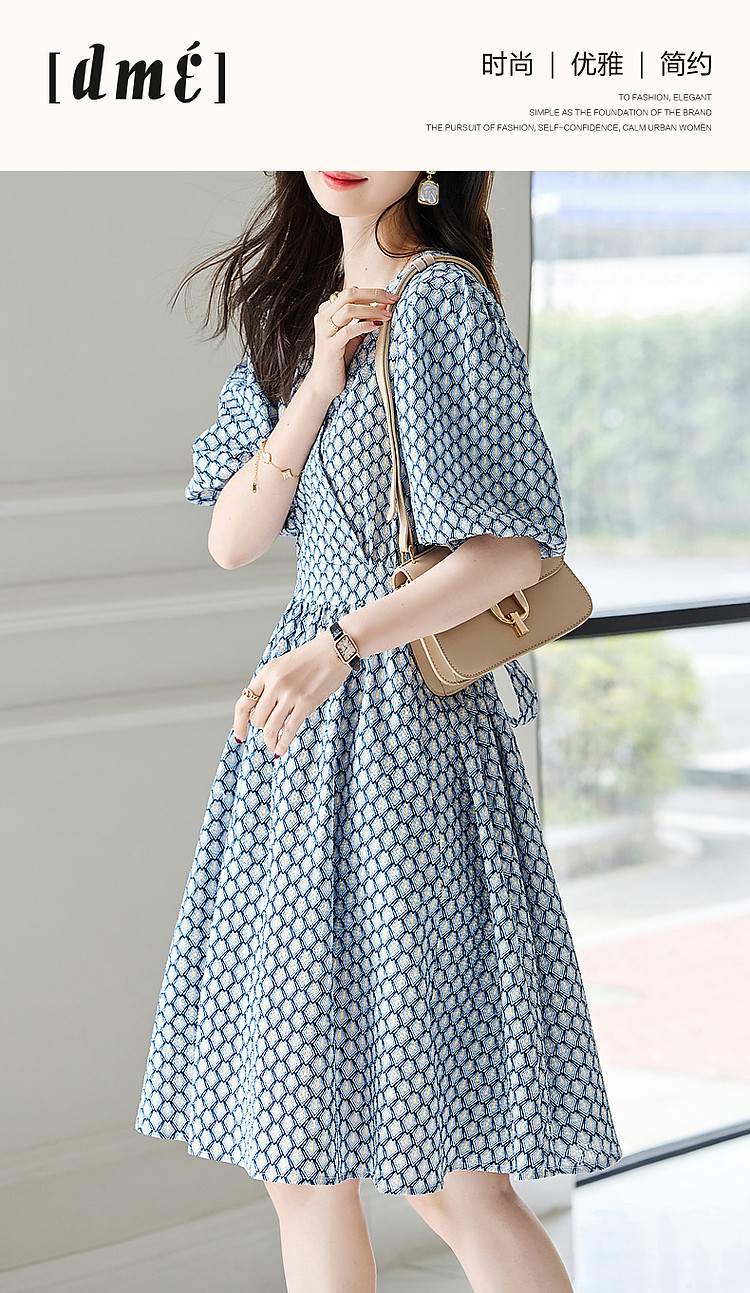 商品名称:【泡泡褶皱肌理】夏法式V领100%棉碎花收腰绑带几何连衣裙 607425