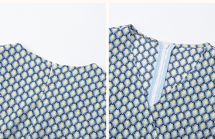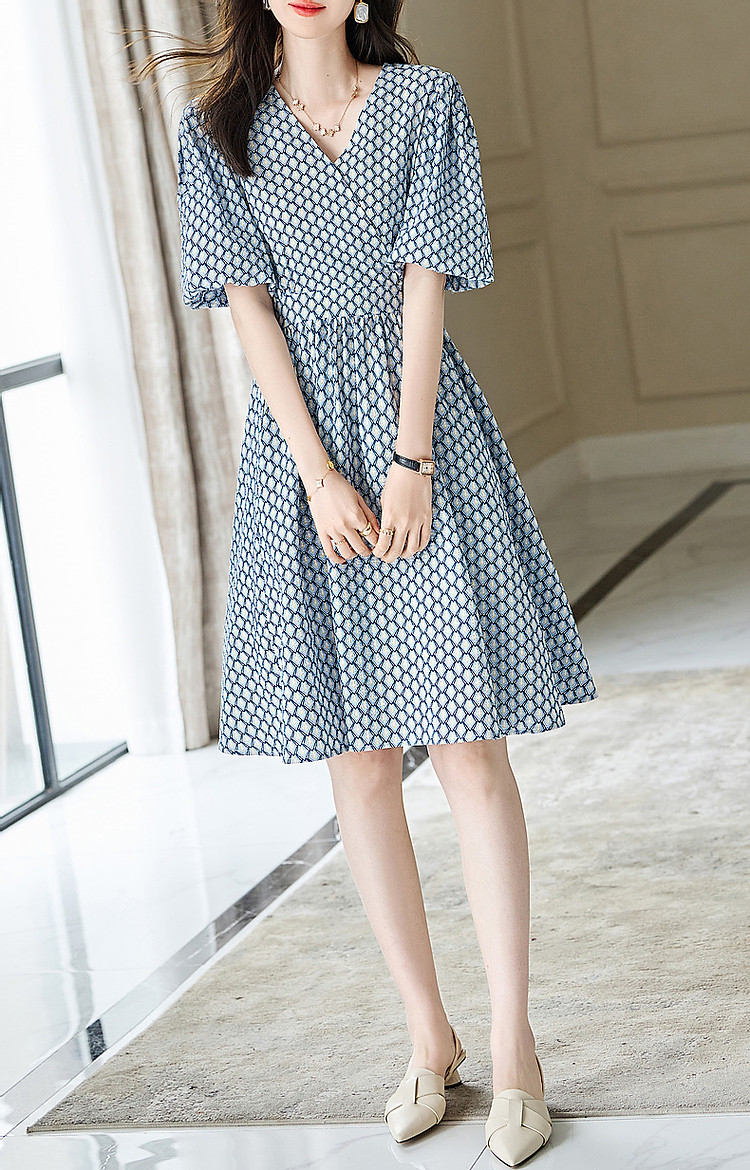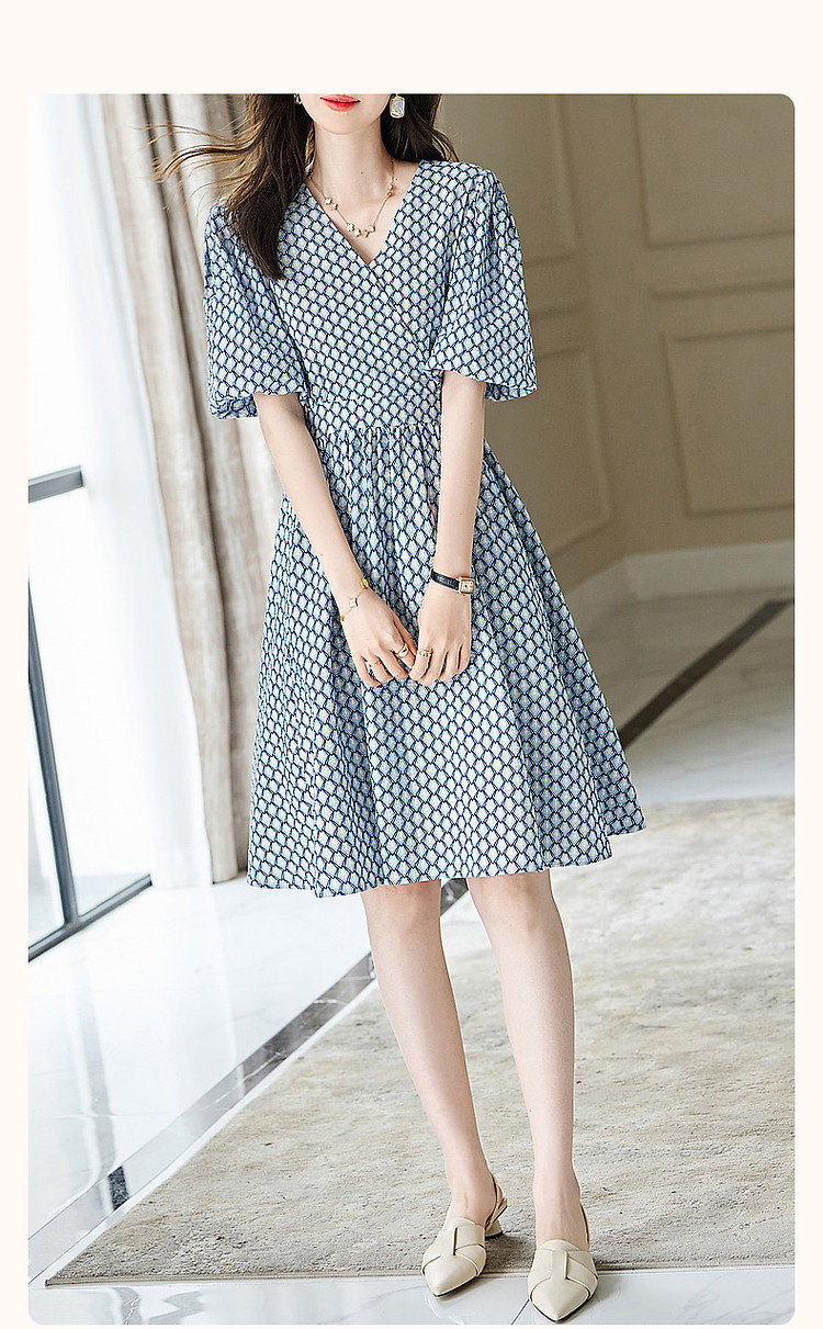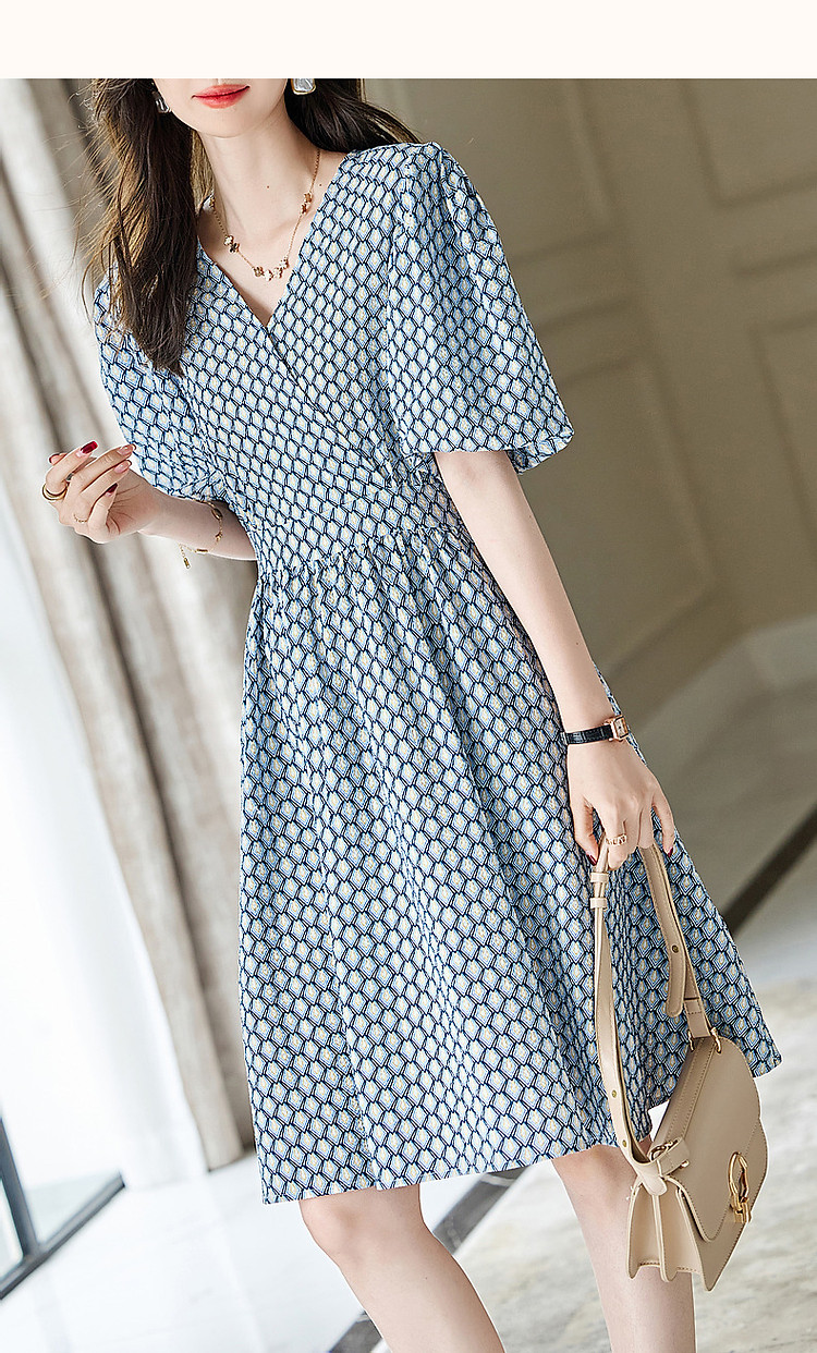 商品名称:【泡泡褶皱肌理】夏法式V领100%棉碎花收腰绑带几何连衣裙 607425