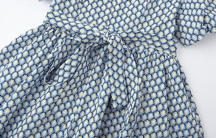 【泡泡褶皱肌理】夏法式V领100%棉碎花收腰绑带几何连衣裙 607425