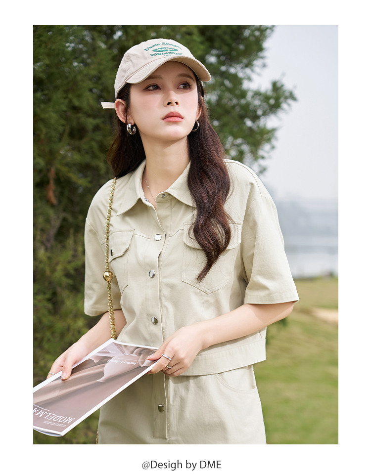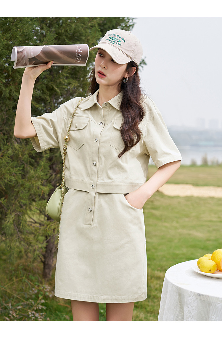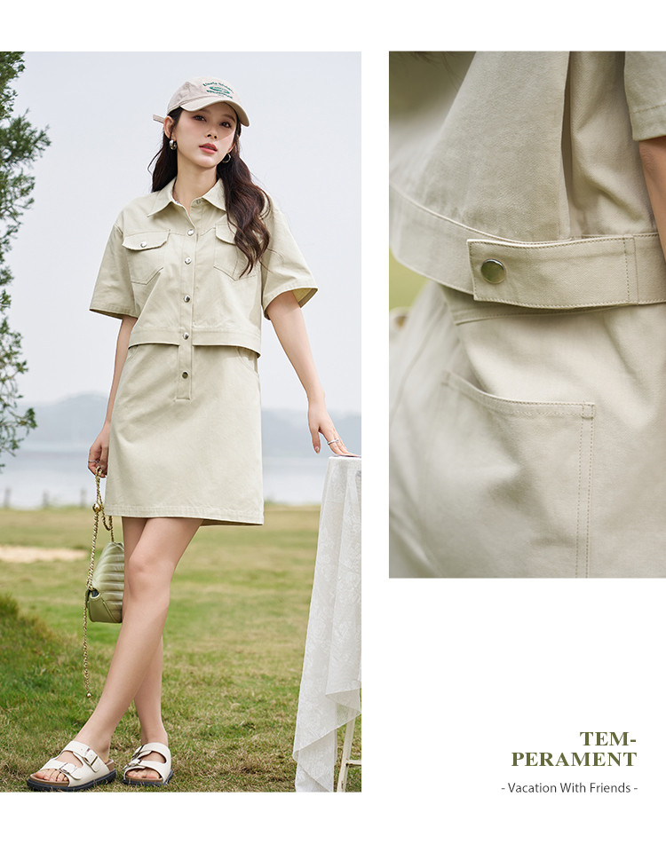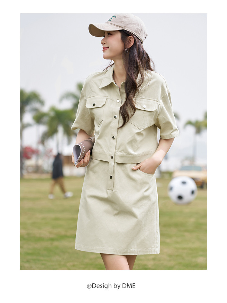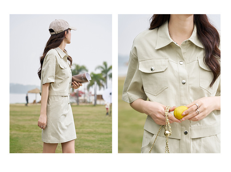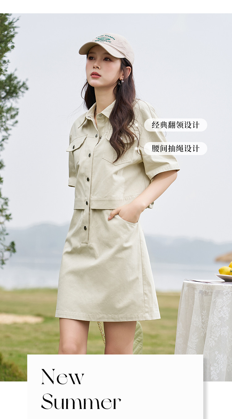 【学院风工装连衣裙】夏季翻领显瘦气质开叉舒适百搭裙子女 678529