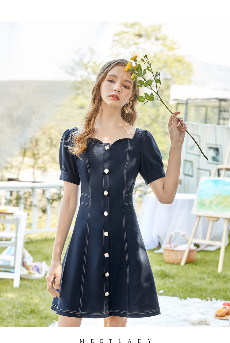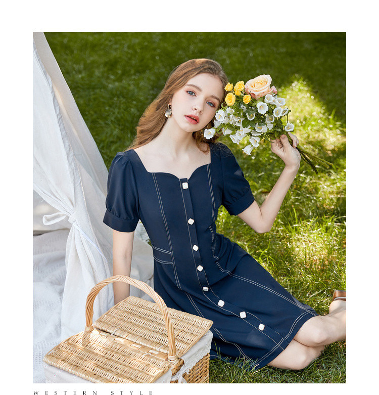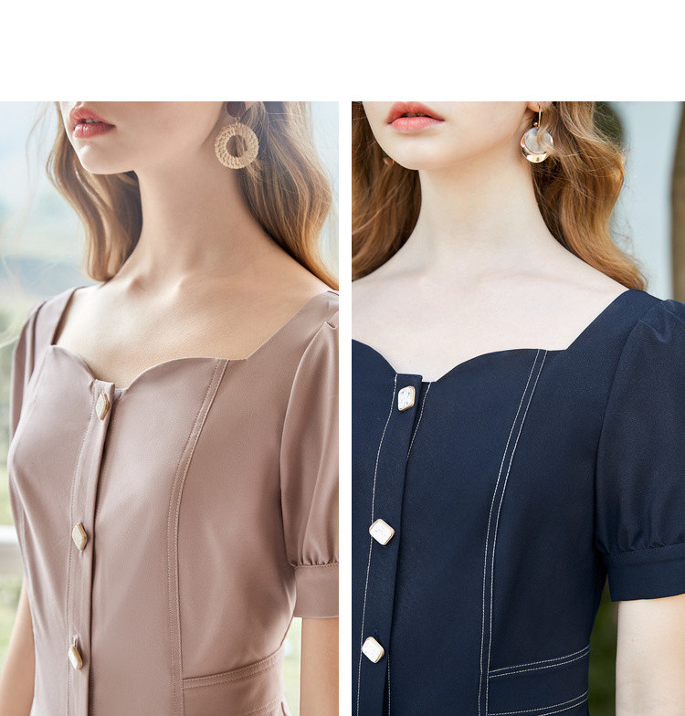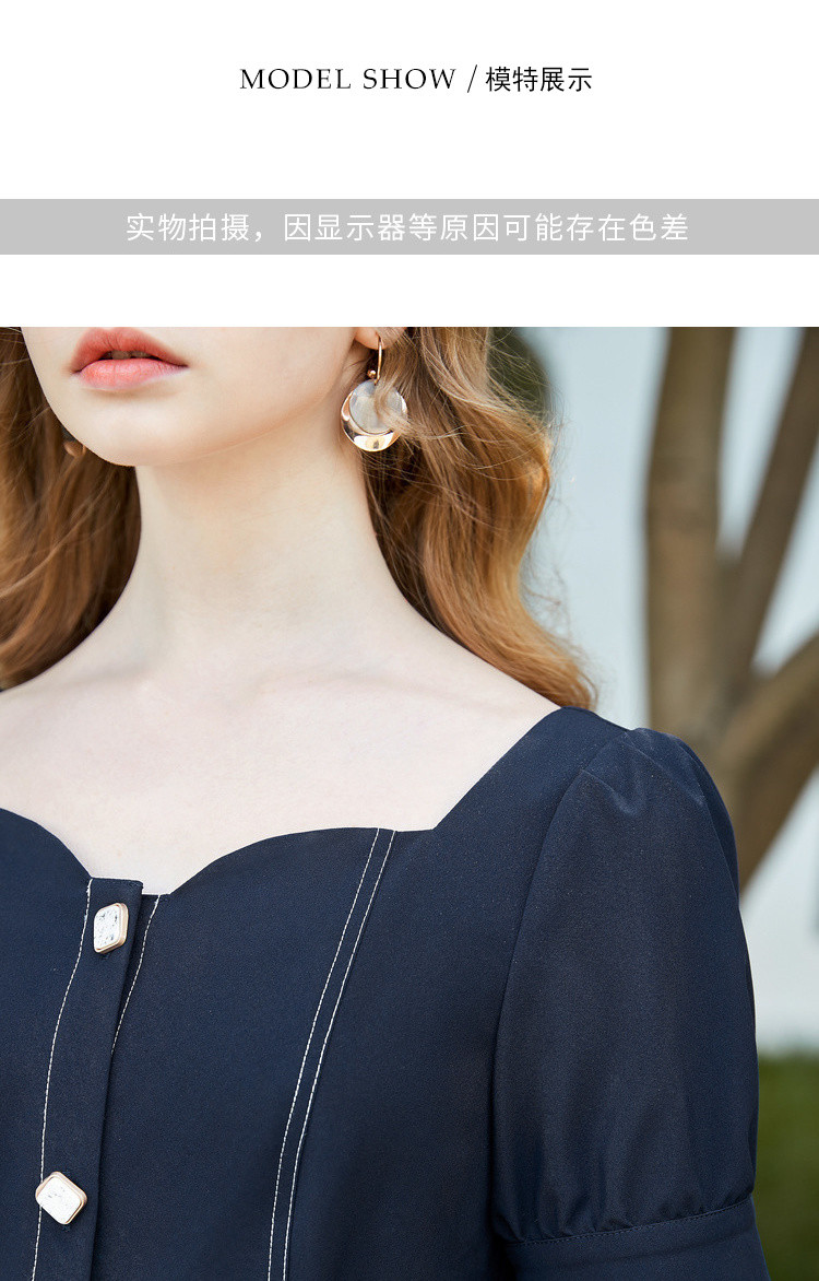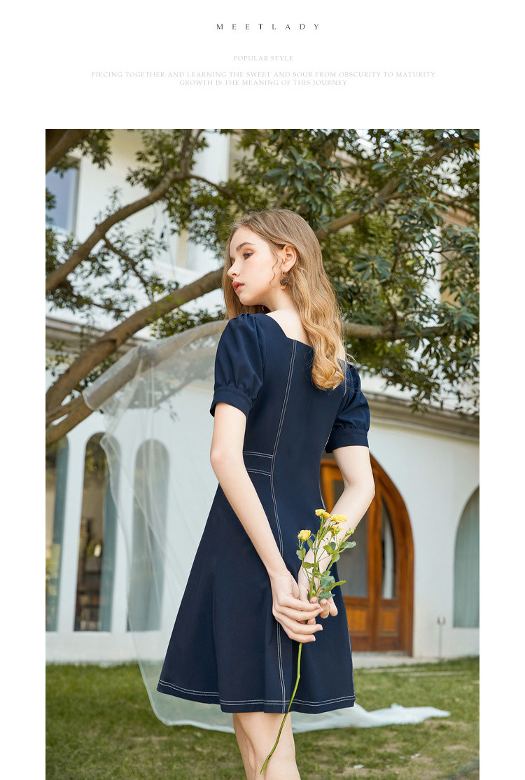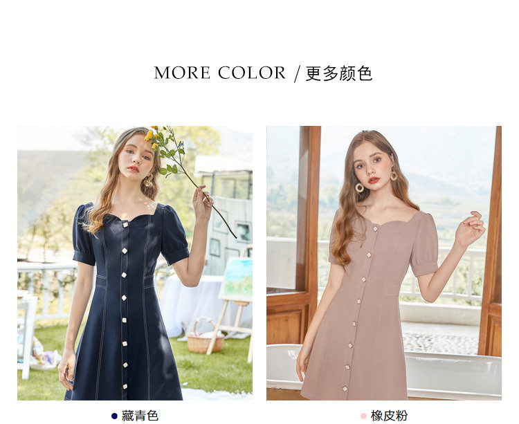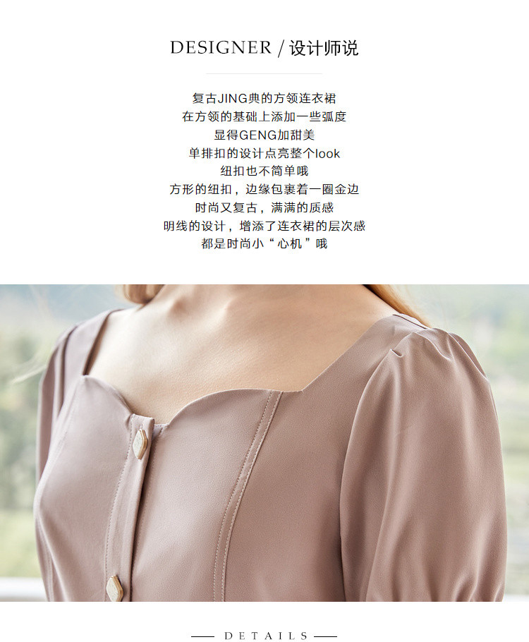 商品名称:【双色可选】夏季复古方领连衣裙女时尚泡泡袖收腰中长款裙子 021908
