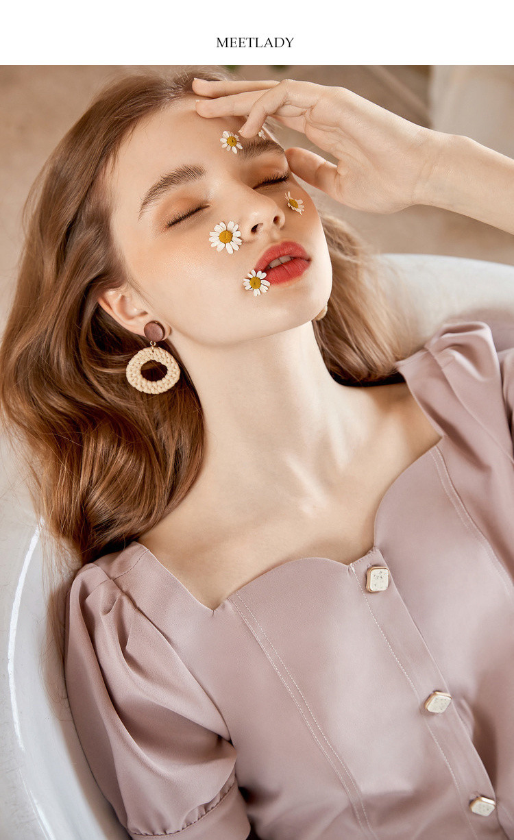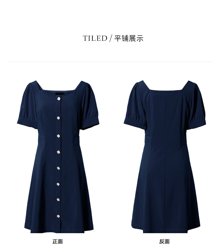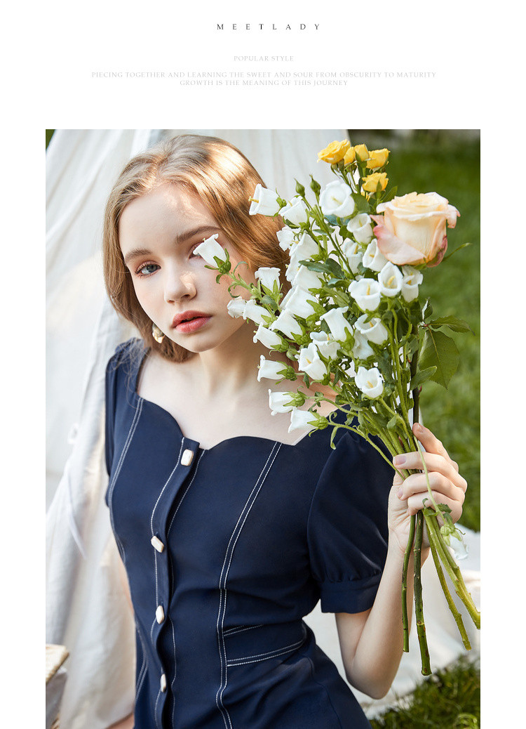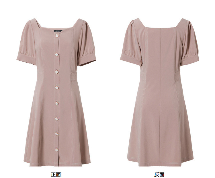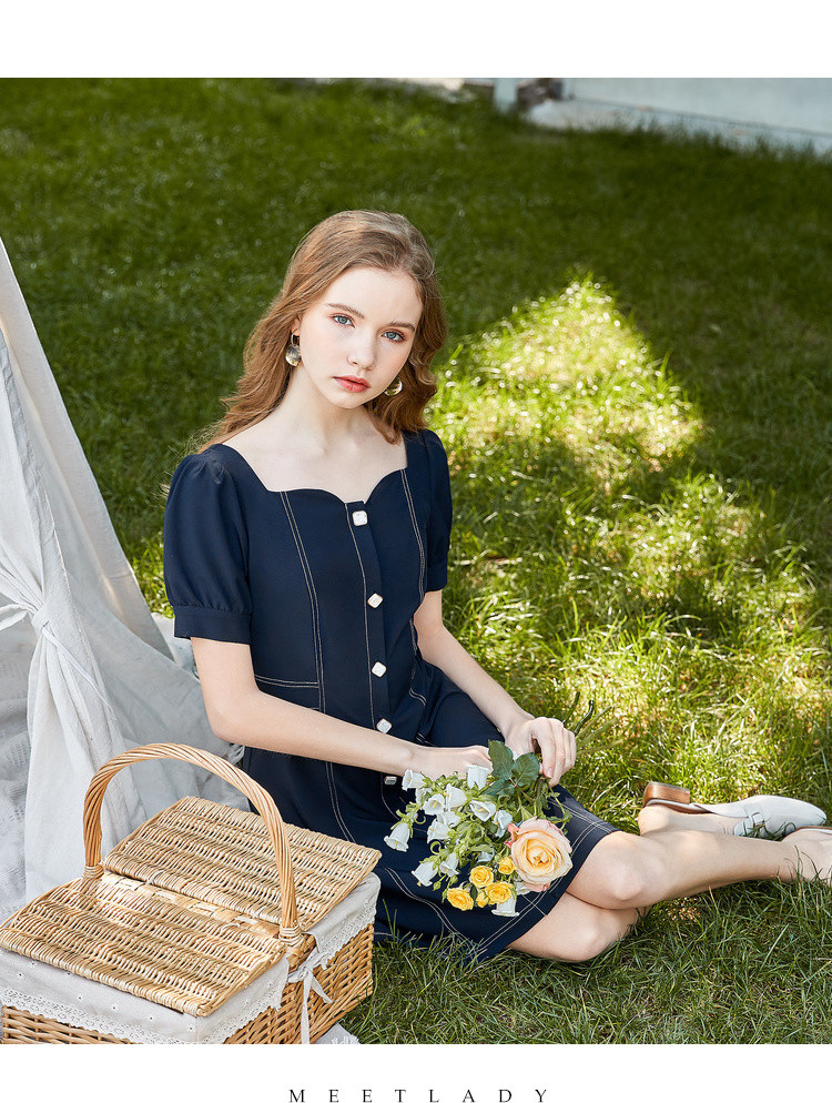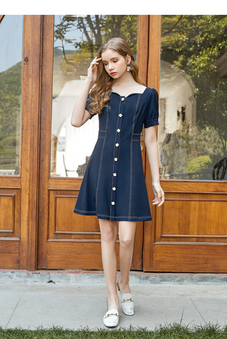 商品名称:【双色可选】夏季复古方领连衣裙女时尚泡泡袖收腰中长款裙子 021908