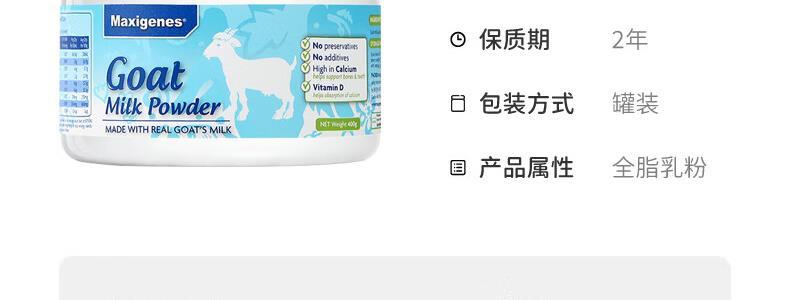 商品名称:澳洲 美可卓(Maxigenes)成人孕妇无糖全脂高钙山羊奶粉 400g【带中文标】