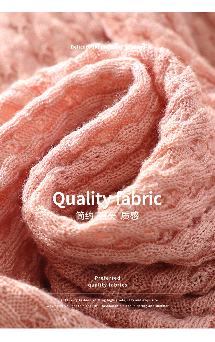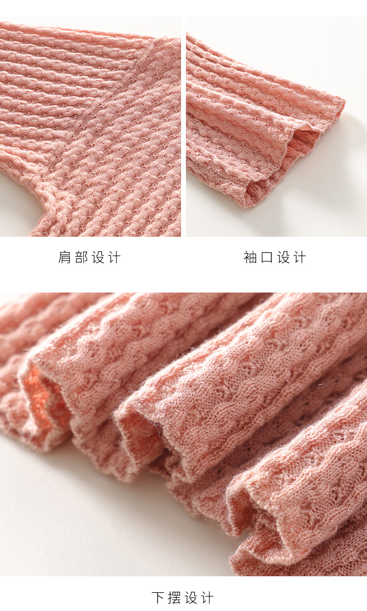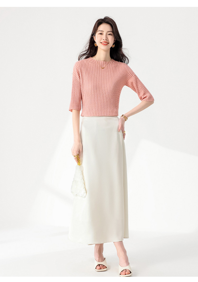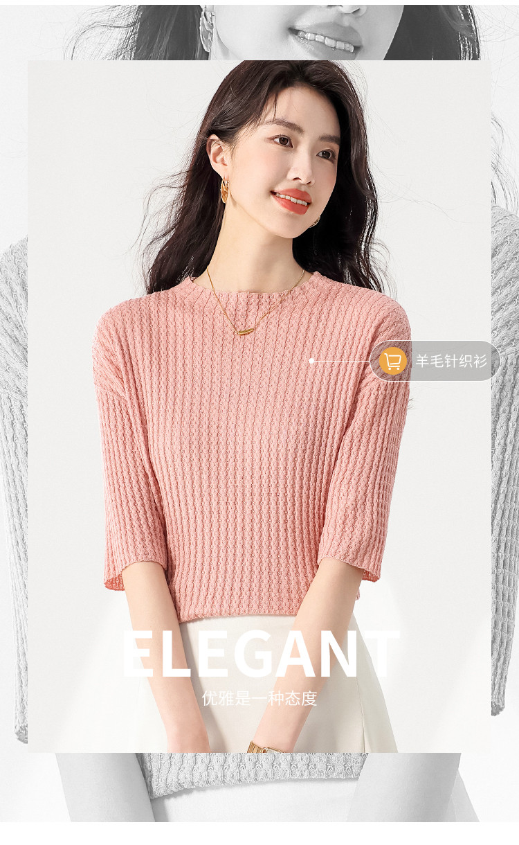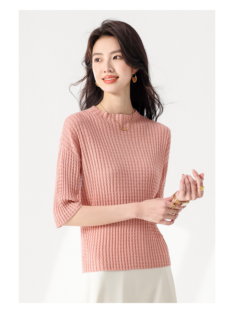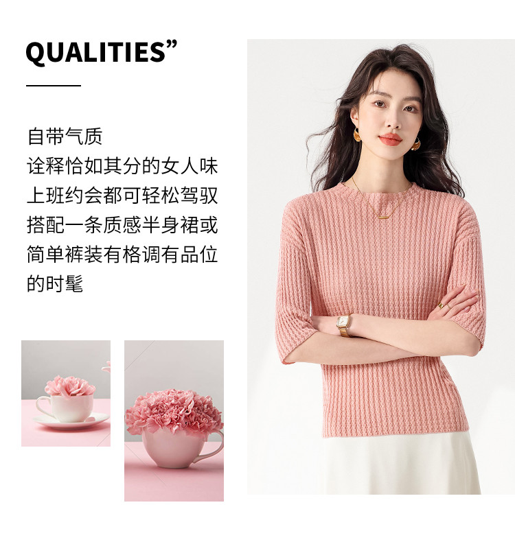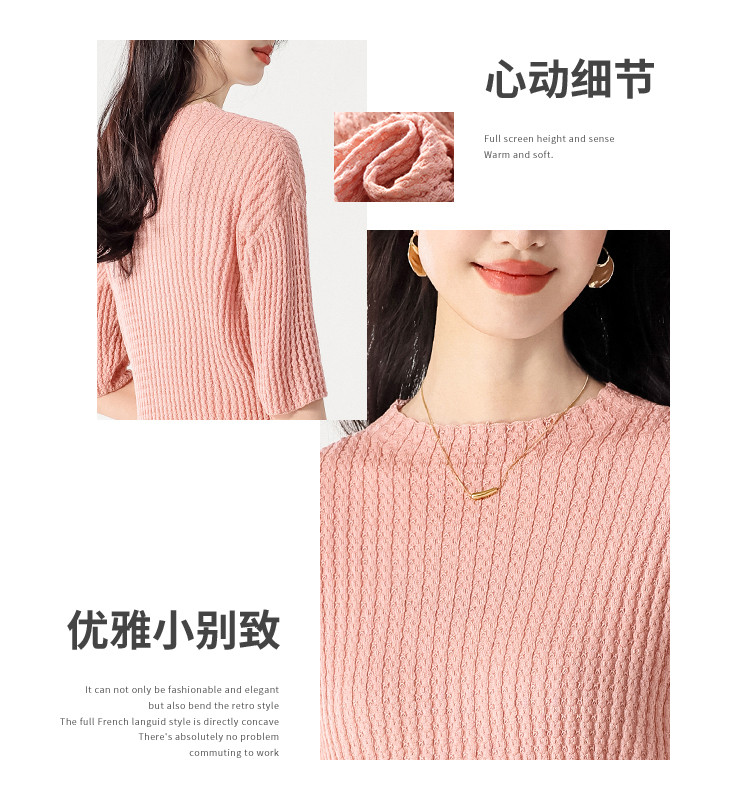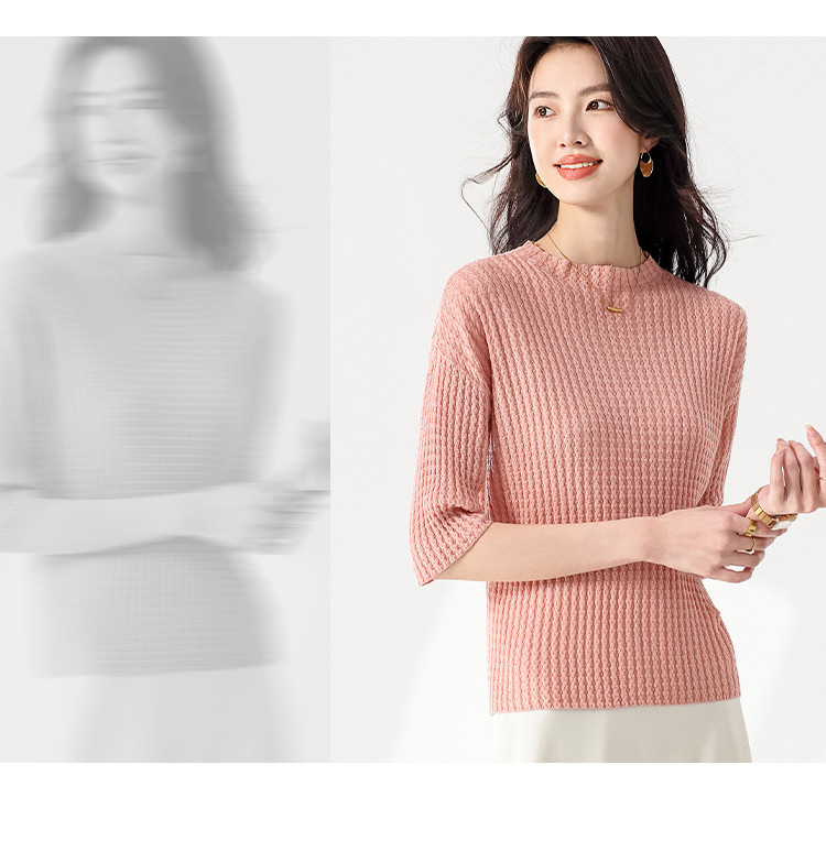 商品名称:轻薄透气纯色泡泡提花圆领含桑蚕丝针织衫女夏打底衫短袖T恤 233299