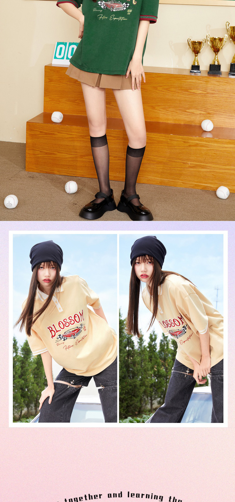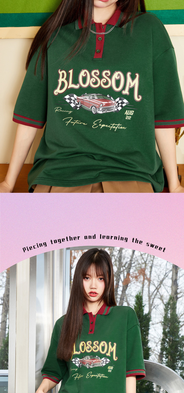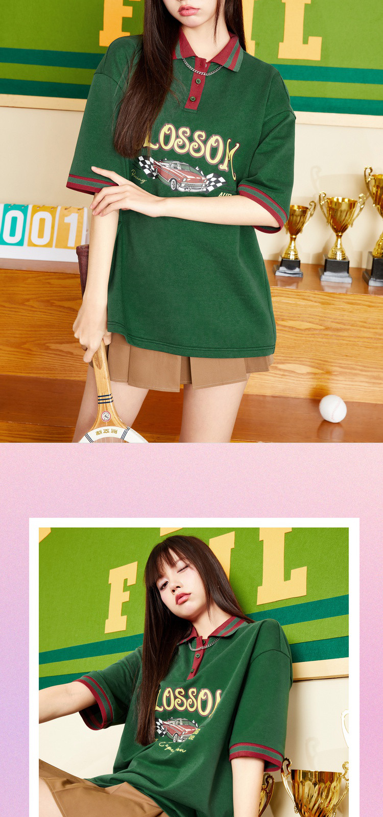 复古POLO领撞色印花宽松T恤女韩版休闲上衣 749780
