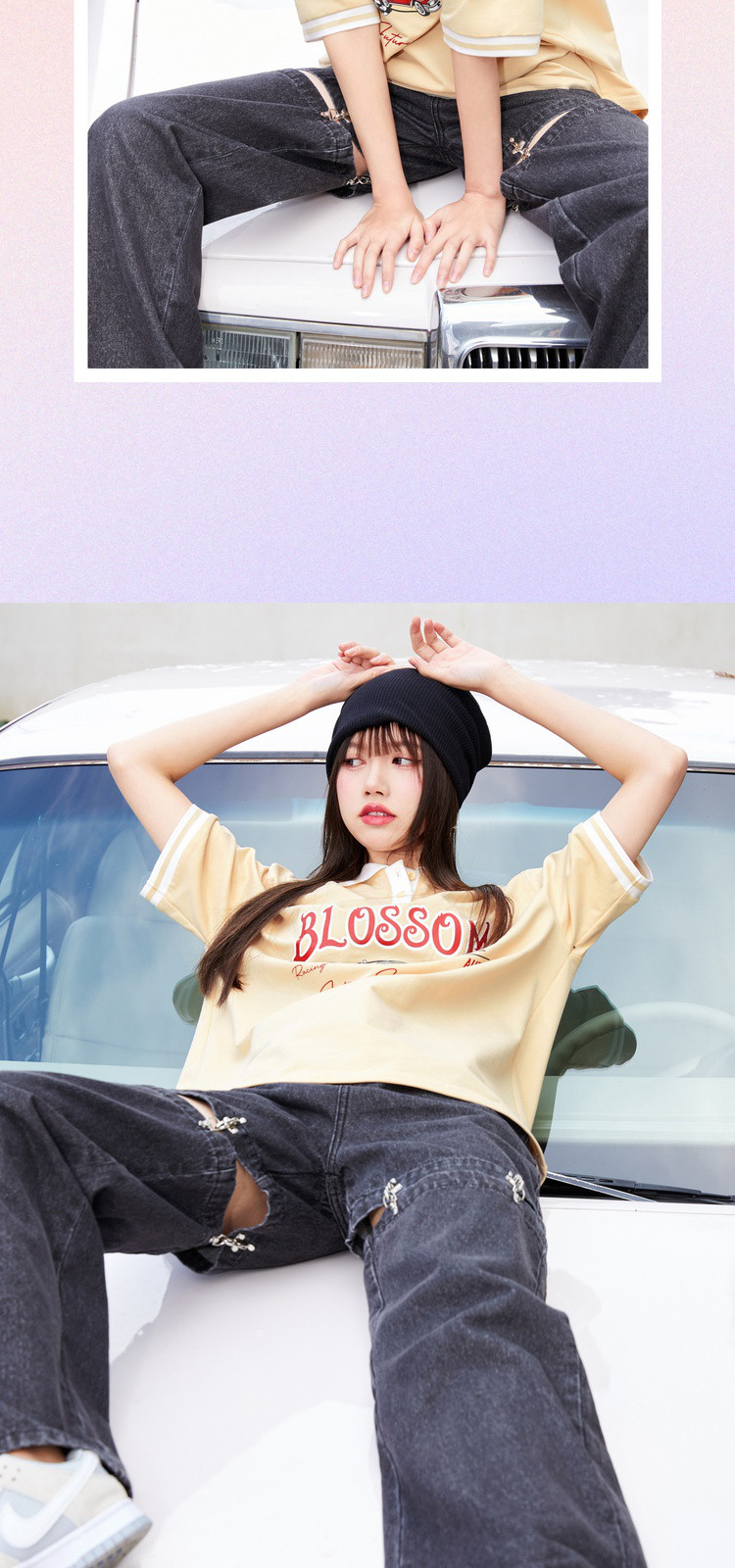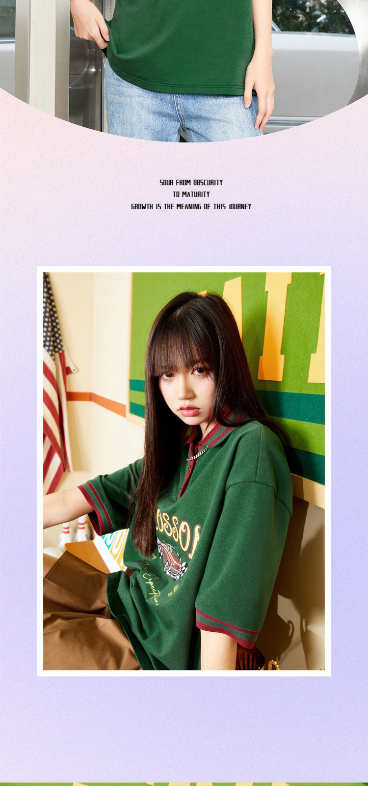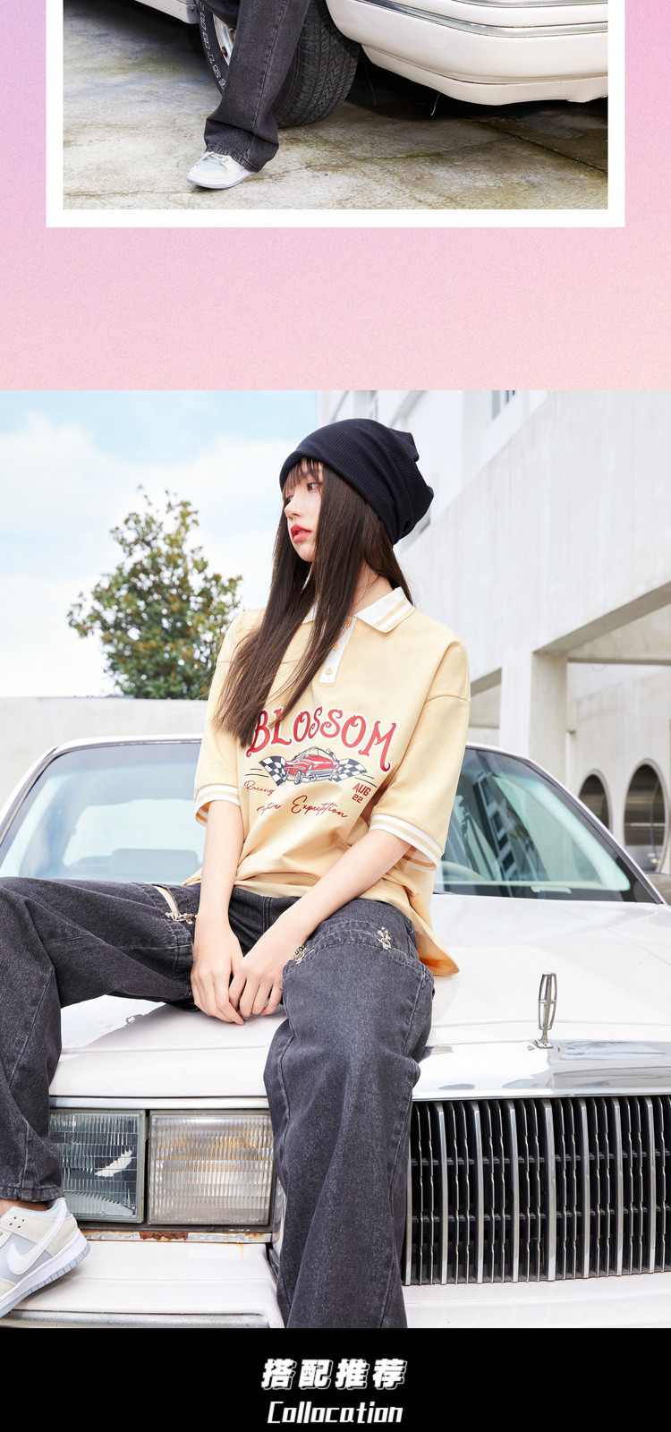 复古POLO领撞色印花宽松T恤女韩版休闲上衣 749780