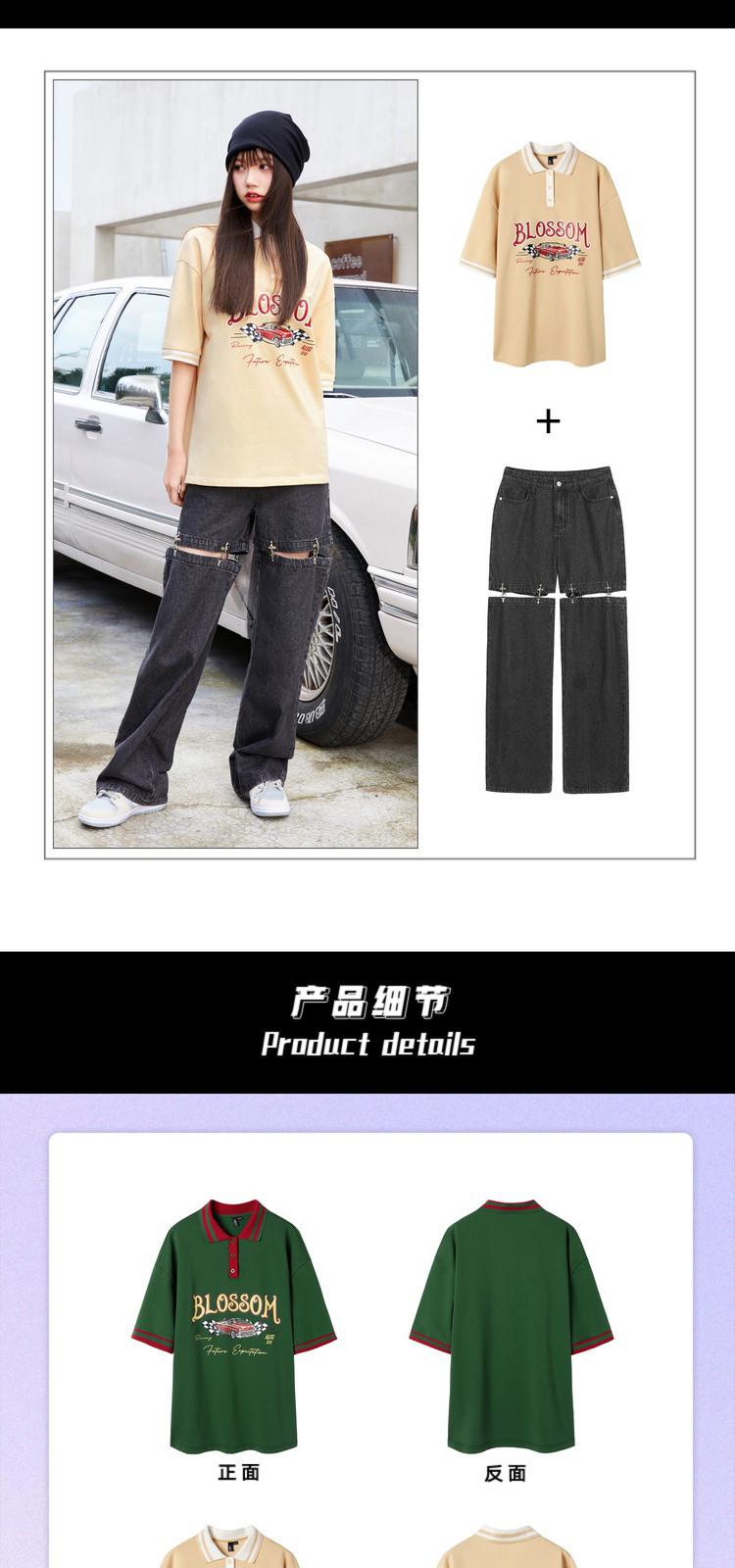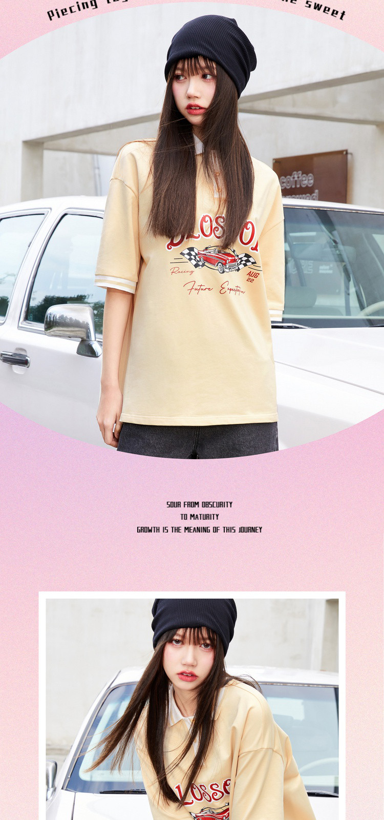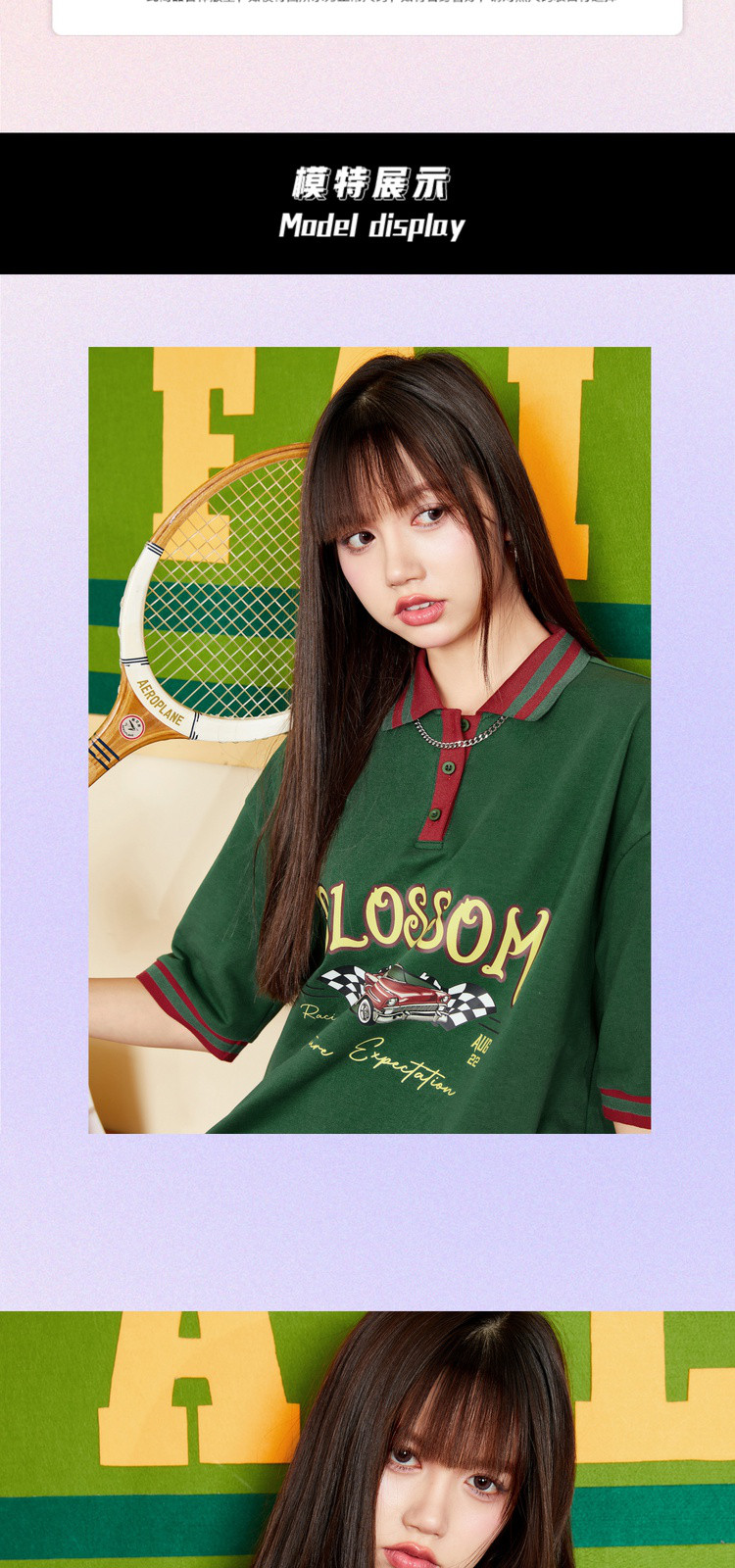 商品名称:复古POLO领撞色印花宽松T恤女韩版休闲上衣 749780