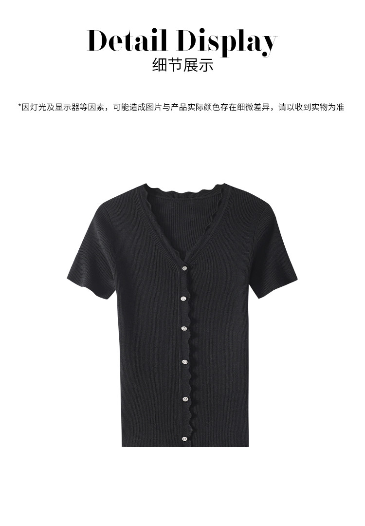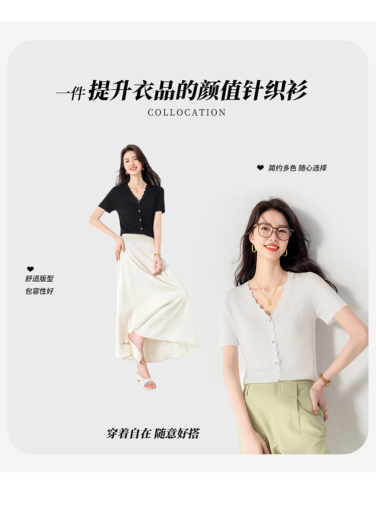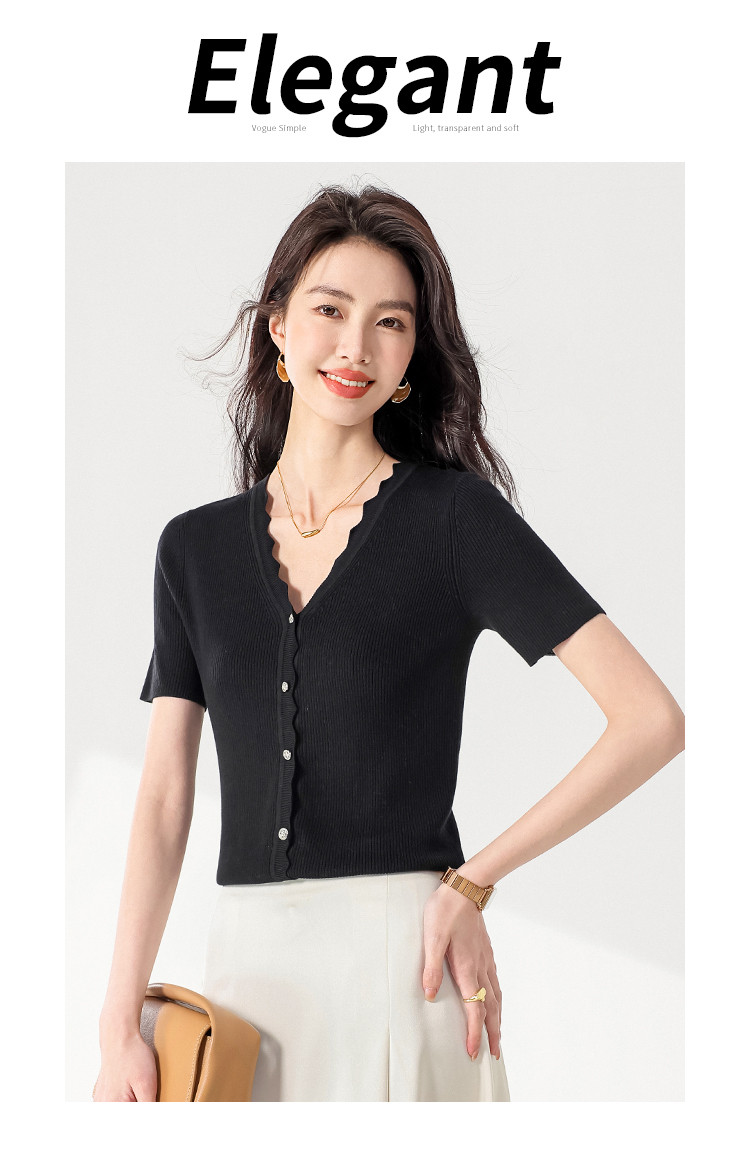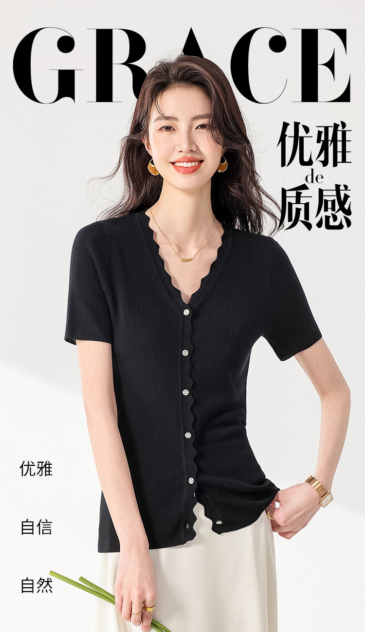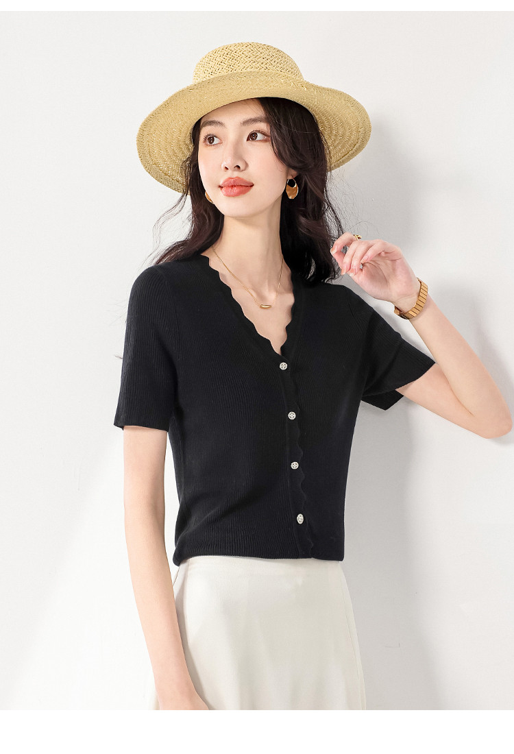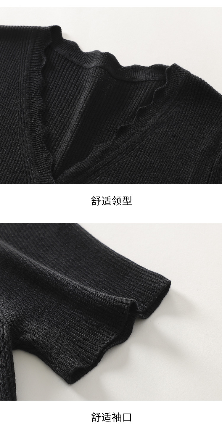 商品名称:【含桑蚕丝】纯色V领抽条短袖针织打底T恤开衫毛衣外套小衫 942355